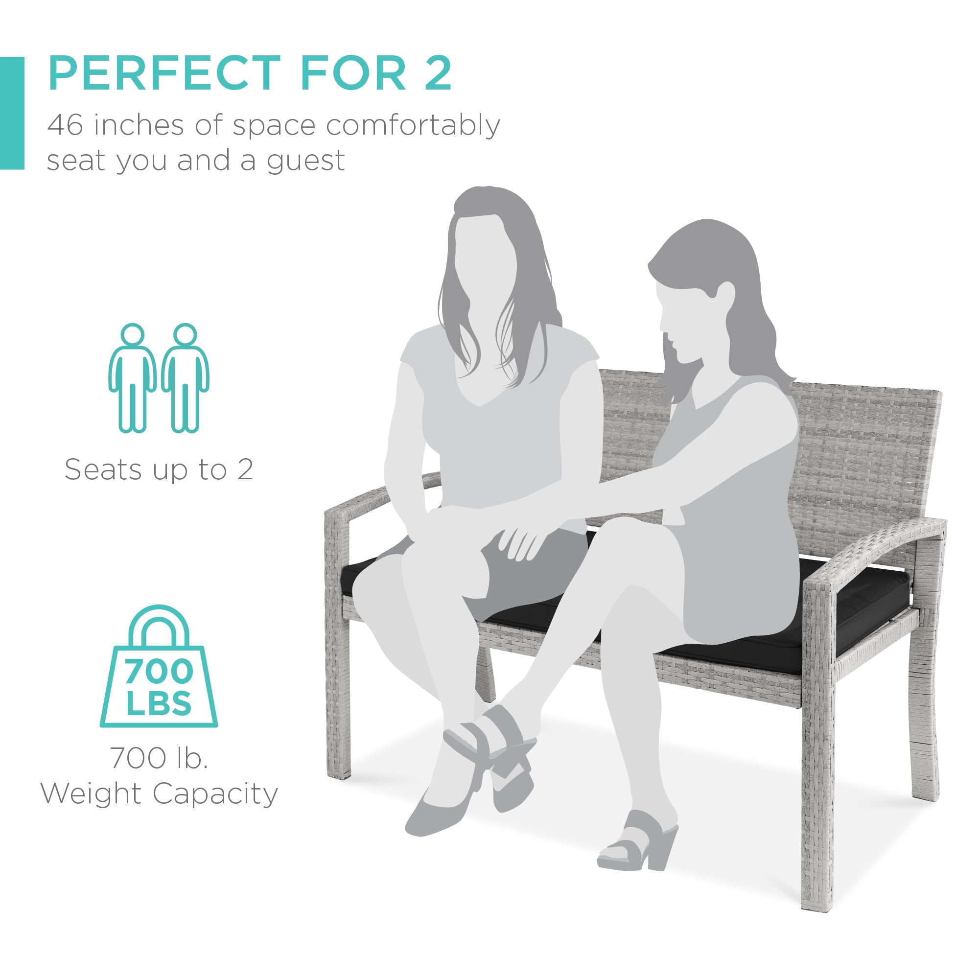 QUALITY COMFORT: A gently curved backrest pairs with a soft, weather-resistant cushion that attaches to the frame with securing straps EASY SETUP: A simple five-step process brings this outdoor seat together in as little as 30 minutes DURABLE MATERIALS: Sturdy, weather-resistant wicker is handwoven over a durable, powder-coated steel frame to withstand the elements and ensure lasting quality PERFECT FOR 2: Comfortably seats up to 2 people with a weight capacity of 700 pounds, so you and your guest can enjoy with peace of mind USE IT ANYWHERE: Sit back and enjoy the day from the comfort of your porch, patio, yard, or garden as this bench maximizes space and style; OVERALL DIMENSIONS: 47″ (L) x 26″ (W) x 34″ (H); WEIGHT CAPACITY: 700 lbs.
