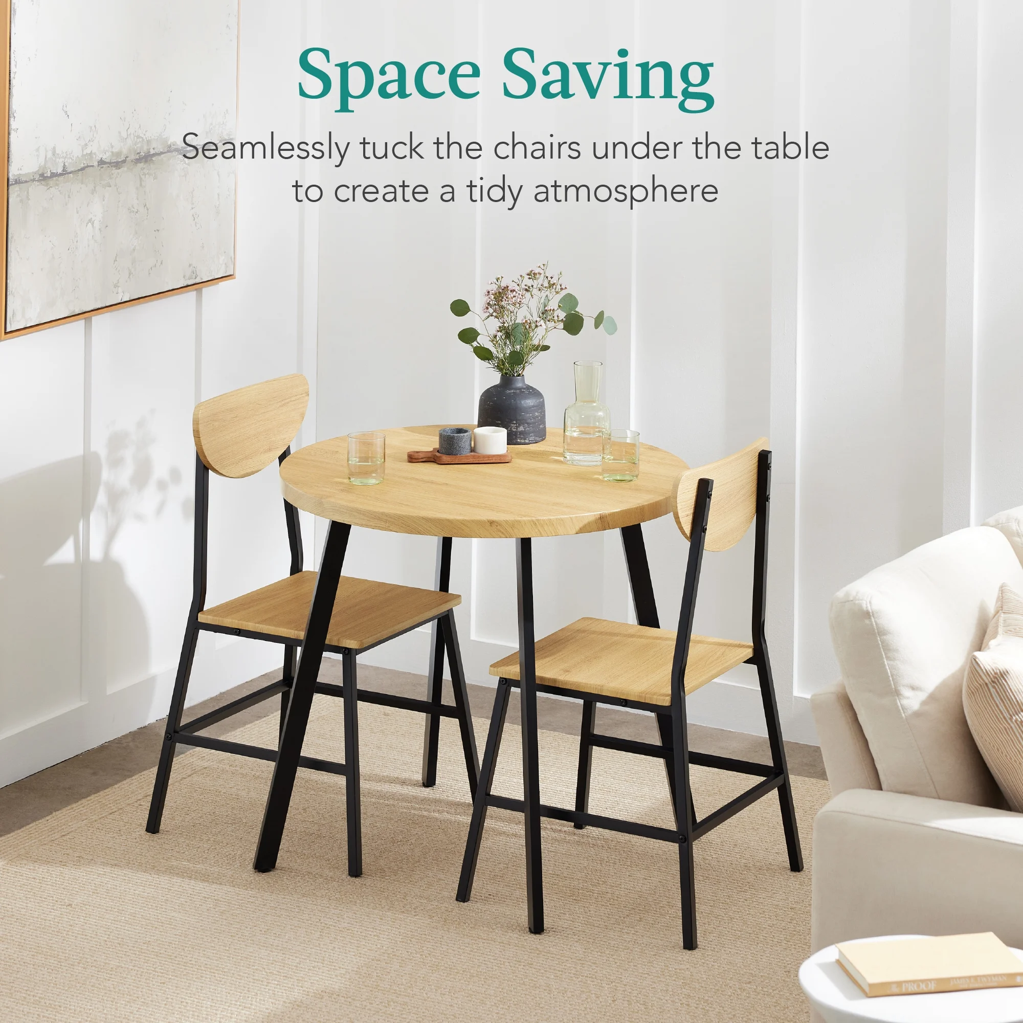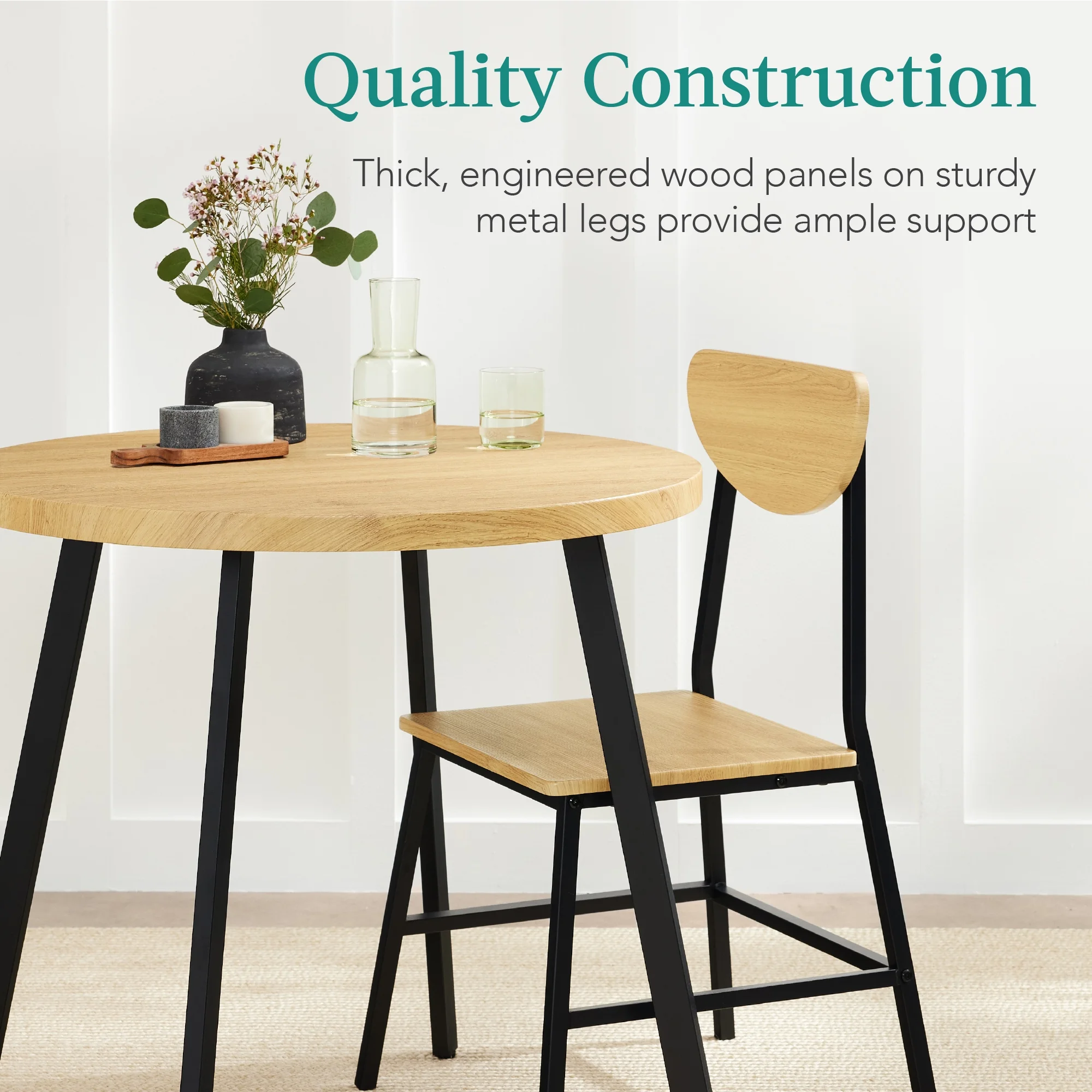 MID-CENTURY MODERN DESIGN: This dining set for 2 combines smoothly curved wooden panels and sleek metal legs for a stylish addition to your home MULTIFUNCTIONAL: A compact profile helps this table fit anywhere in your home, making it a versatile addition to any kitchen, dinette, or breakfast nook SPACE SAVING: The chairs seamlessly tuck under the 31.5-inch round tabletop to save space and create a tidy atmosphere-perfect for small living areas or seating extra guests for a small lunch gathering QUALITY CONSTRUCTION: A set of sturdy, 1.5-inch thick metal legs support an engineered wood tabletop and comfortable matching chairs with gently curved backrests for reliable support HEAVY-DUTY SUPPORT: A sturdy, 220-pound capacity tabletop with two durable 275-pound capacity chairs makes this a reliable addition to your home dining experience; TABLE OVERALL DIMENSIONS: 31.5″(Dia) x 30″(H); TABLE WEIGHT CAPACITY: 220 lbs. ; CHAIR OVERALL DIMENSIONS: 19.25″(L) x 19.75″(W) x 33.5″(H); CHAIR WEIGHT CAPACITY: 275 lbs.
