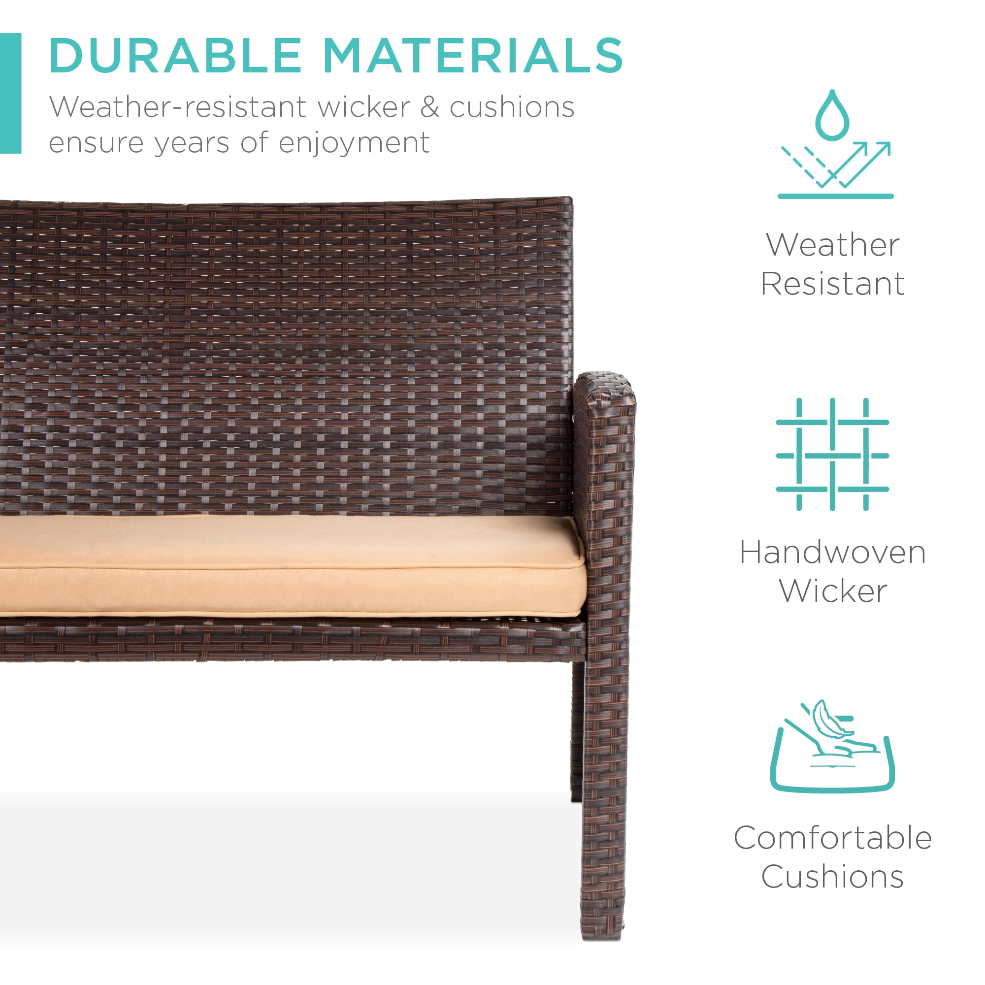 MODULAR FURNITURE SET: This versatile furniture set features a table, one double sofa, and two chairs to provide four seats that can be mixed & matched to your sitting space DURABLE MATERIALS: All-weather wicker is handwoven over a steel frame for lasting durability, while weather-resistant cushions prevent fading and wear from the wind and rain GLASS TABLE TOP: The wicker coffee table comes with a removable, tempered glass top to create a smooth, sturdy surface for food and drinks MACHINE-WASHABLE COVERS: Removable cushion covers come out clean with warm soap and water to maintain a clean, plush appearance for years to come GREAT FOR OUTDOOR SPACES: The perfect way to enhance your backyard, balcony, patio, and other outdoor sitting spaces; DOUBLE SOFA: 43″(L) x 26″(W) x 30″(H); Chair (each): 26″(L) x 23.5″(W) x 31″(H); COFFEE TABLE: 35″(L) x 18″(W) x 17″(H)