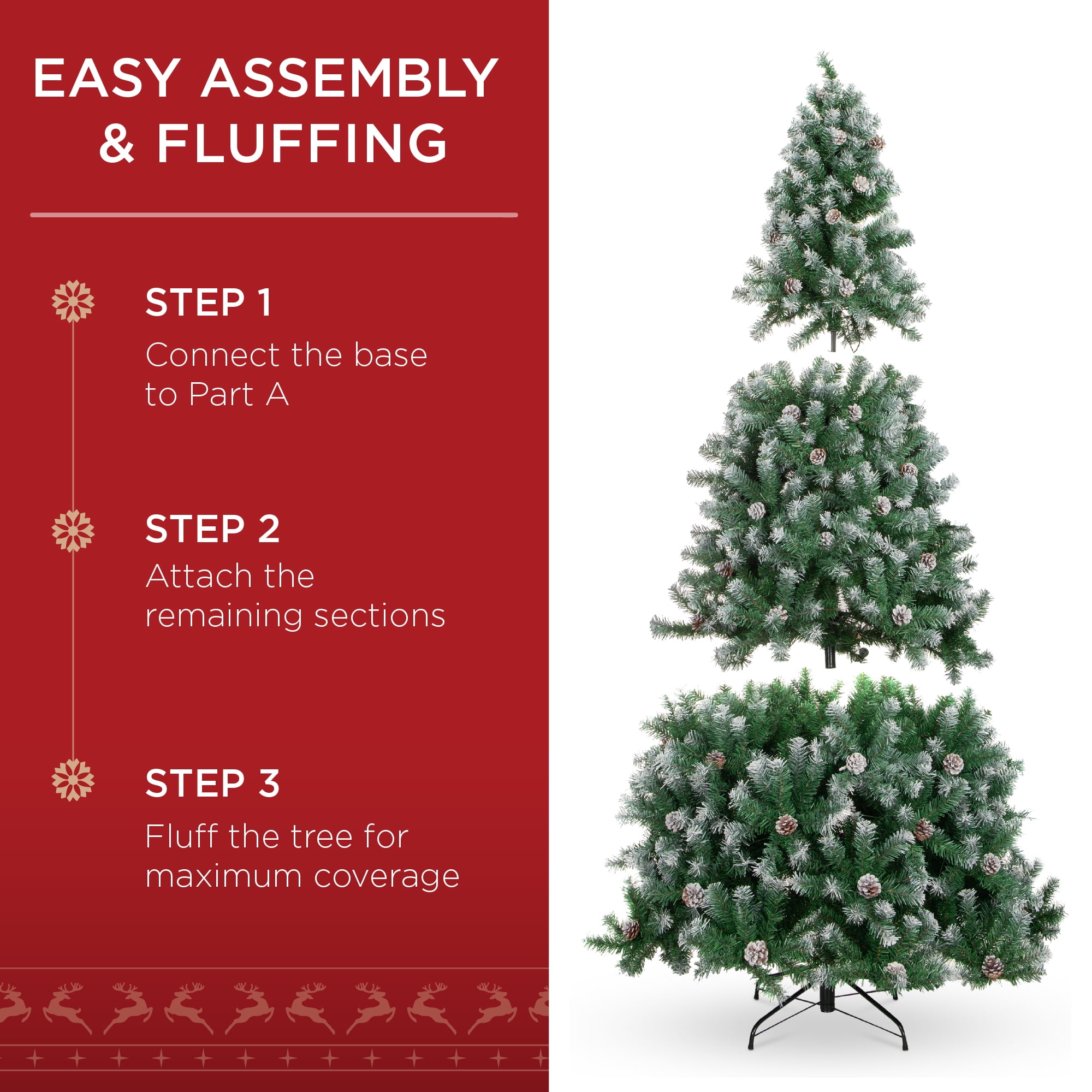 HOLIDAY MAGIC: Inspire holiday cheer in your home, office, or holiday party with a Christmas tree that forms the perfect centerpiece; equipped with sturdy branches, strong enough to hold garland and all your favorite ornaments for a customized look PRE-DECORATED DESIGN: Made with pine cones that are evenly dispersed throughout the tree’s partially flocked branches to create a natural look that brings a feel of the outdoors into your space EASY ASSEMBLY & FLUFFING: Put the tree together in just 3 steps: simply connect the base to the largest section of the tree before attaching the remaining sections and easily fluffing the branches REALISTIC APPEARANCE: Hundreds of tips create a full, yet tapered appearance with meticulously crafted branches that mimic the color and texture of an authentic pine tree; Number of Tips (4.5ft/6ft/7.5ft/9ft/12ft): 450/ 1,000/ 1,346/ 2,028/4,188 HIGH-QUALITY DESIGN: Crafted with durable metal hinges and flame-retardant PVC branches that stand tall with the help of a sturdy metal base, so you can enjoy your tree for holiday seasons to come!; OVERALL DIMENSIONS: 43.5″(Dia) x 72″(H)