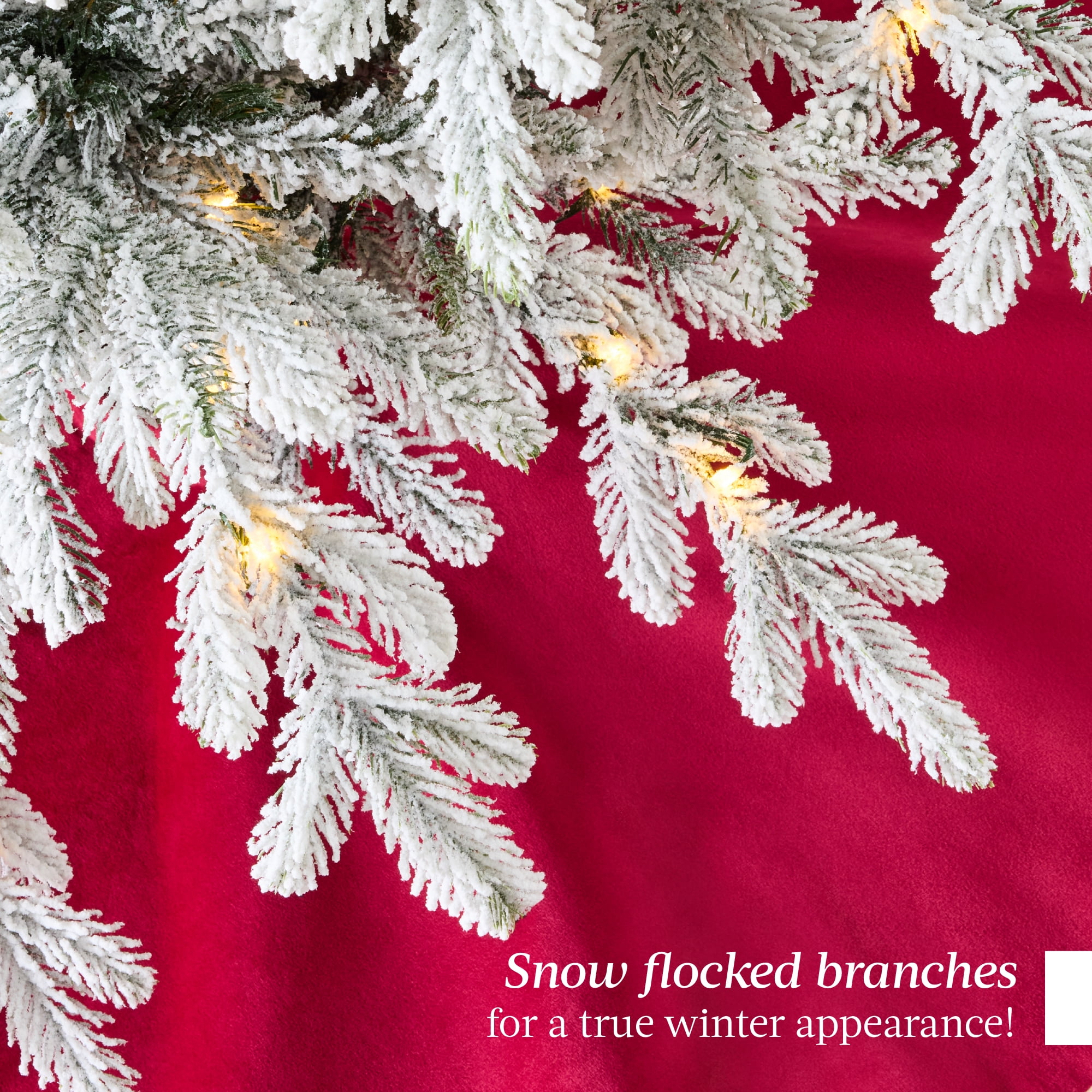 Transform your holiday decor with our Pre-Lit Flocked Aspen Noble Fir Christmas Tree. Crafted with specially designed branches that blend premium-quality PE and PVC, this tree authentically captures the stiff, horizontal pattern of the iconic Noble Fir. With a strong foundation of realistic, flame-retardant branch tips, it can effortlessly support your heaviest ornaments. The sturdy metal base keeps your tree upright throughout the holiday season. Assembly is a breeze with a simple 3-step process, complemented by the instant cordless light system. Stack the tree sections, fluff the branches, and plug in the base for a brilliant display. Thousands of tips create a lush, full appearance that leaves plenty of room for your decorating creativity. And with nine versatile light functions featuring warm white and multicolored LED lights, you can add a dynamic touch to your holiday celebrations. Choose from 300 lights for the 6ft tree or 400 for the 7.5ft version to illuminate your festive moments.