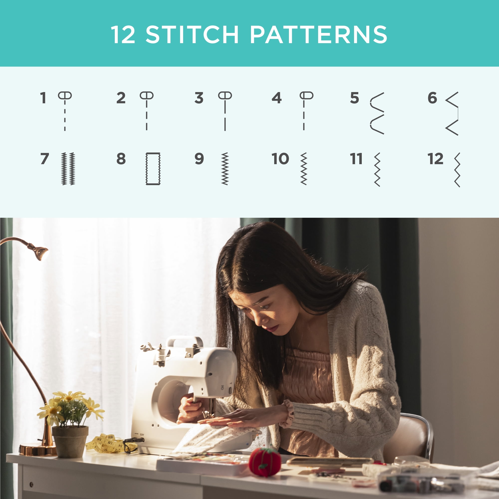 BEGINNER’S KIT INCLUDED: Whether you’re a pro or just starting out, this set has what you need to get started including bobbins, spools, a spare needle, and needle threader. Choose between 2 speeds for your ideal comfort level 12 PRESETS: Preset stitch patterns simplify the learning curve for beginners, allowing them to complete more complex projects with ease EASY TO USE: Automatic thread rewind, thread cutter, tension dial, and a sewing light make it easy for beginners and pros to operate this machine COMPACT & PORTABLE: Use the carrying handle to easily transport this small machine as needed. A battery-operated option allows you to sew anywhere using 4 AA batteries (batteries not included) VERSATILE USE: Use your sewing machine to patch up torn clothes, or to create DIY crafts, masks, or clothes from scratch. Includes a storage compartment for easy access to threads and other supplies; OVERALL DIMENSIONS:11″(L) x 4.5″(W) x 10.5″(H)