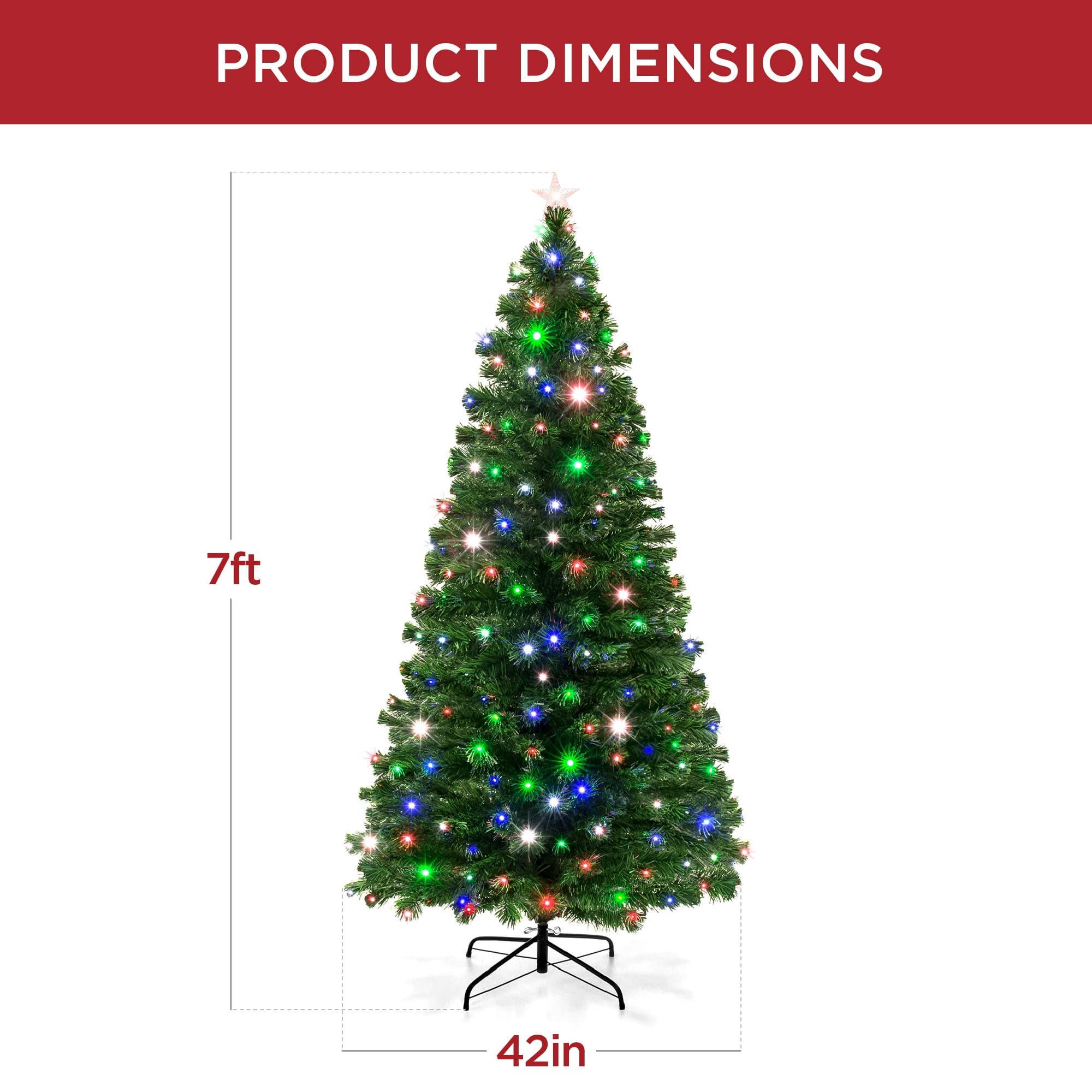 FIBER OPTIC LIGHTS: Cycle between eight light sequences as hundreds of multicolored LED & fiber optic lights come to life with a festive star topper to spread the holiday spirit; Light Counts (6ft/7ft/8ft): 230/280/320 LUSH, FULL SHAPE: A standout during the holidays, the tall profile combined with full, realistic branches add an eye-catching addition to any room in your home EASY ASSEMBLY & FLUFFING: This tree comes together in an easy two-piece assembly; fluff for 45-90 minutes (depending on the size of your tree) for a natural, full-bodied appearance HIGH-QUALITY: Crafted with durable flame-retardant PVC branches that stand tall with a convenient, folding base that provides stable balance and easy placement MANY WAYS TO DECORATE: Accentuate different areas of your living space, office, or even a holiday party by customizing your tree with garland, lights, ornaments, and more!; OVERALL DIMENSIONS: 42″(Dia) x 84″(H)