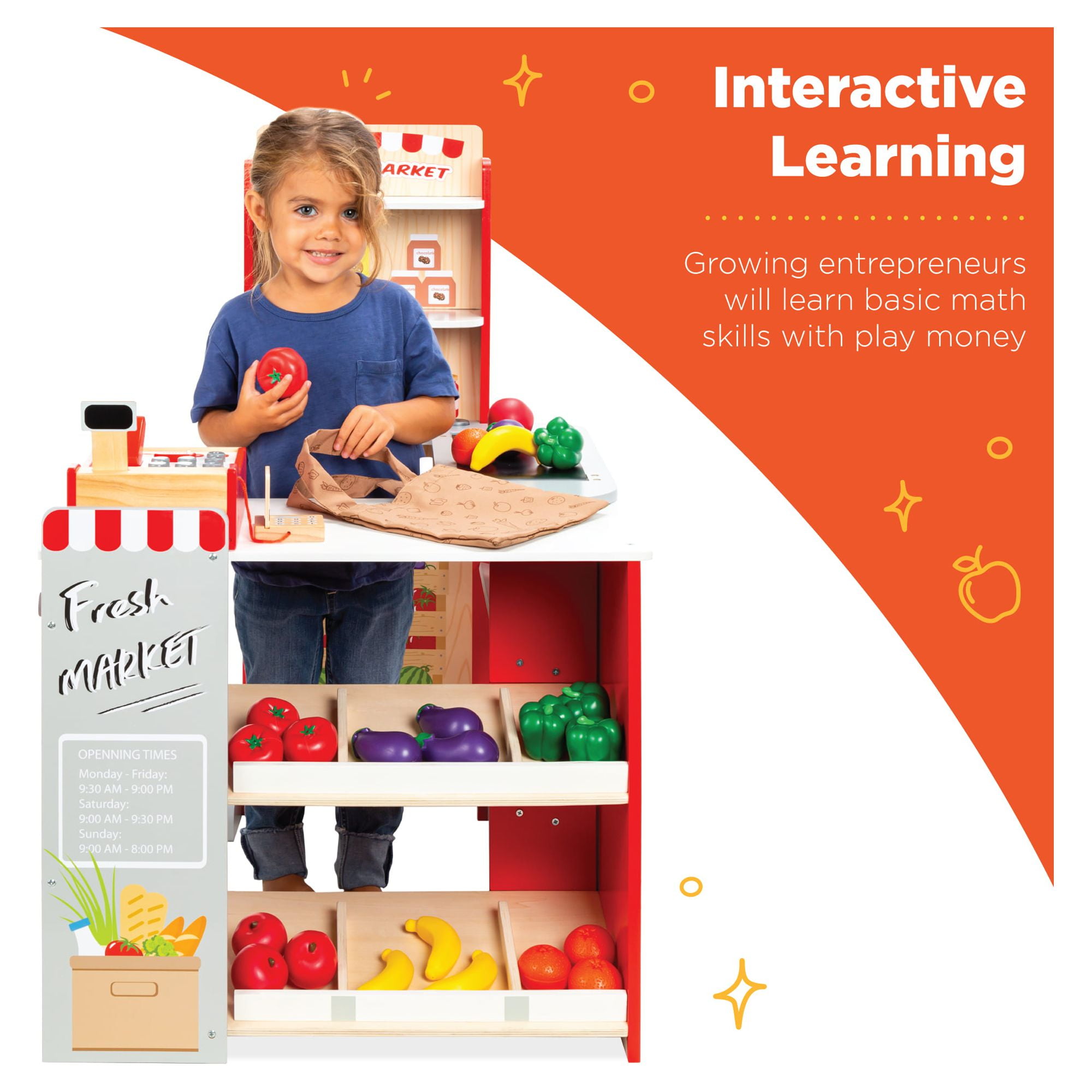 OVER 40 ACCESSORIES INCLUDED: Kids can easily play pretend with 24 fruits and veggies for checkout, play-money, credit card, a grocery bag, and a play-scanner for a fully immersive experience REGISTER & CHALKBOARD: Kids can enjoy a checkout counter designed with a chalkboard to write specials on, shelves for kids to store groceries, and register that opens so they can check out their items MOVING CONVEYOR: Your child can place their included groceries on a moving conveyor, scan the fruits and veggies with the play scanner, and complete the checkout with the included coins and credit card as well as bag their groceries in the bagging area TRUE TO LIFE: Kids can enjoy playing a realistic pretend game while practicing basic math as they buy and sell groceries with play-money CERTIFIED & SAFE: Rest at ease while your child plays with a supermarket set that is both safe and fun; made with plastic materials and meets U.S. Federal safety standards for ASTM & CPSIA; OVERALL DIMENSIONS: 35″(L) x 23″(W) x 36″(H)