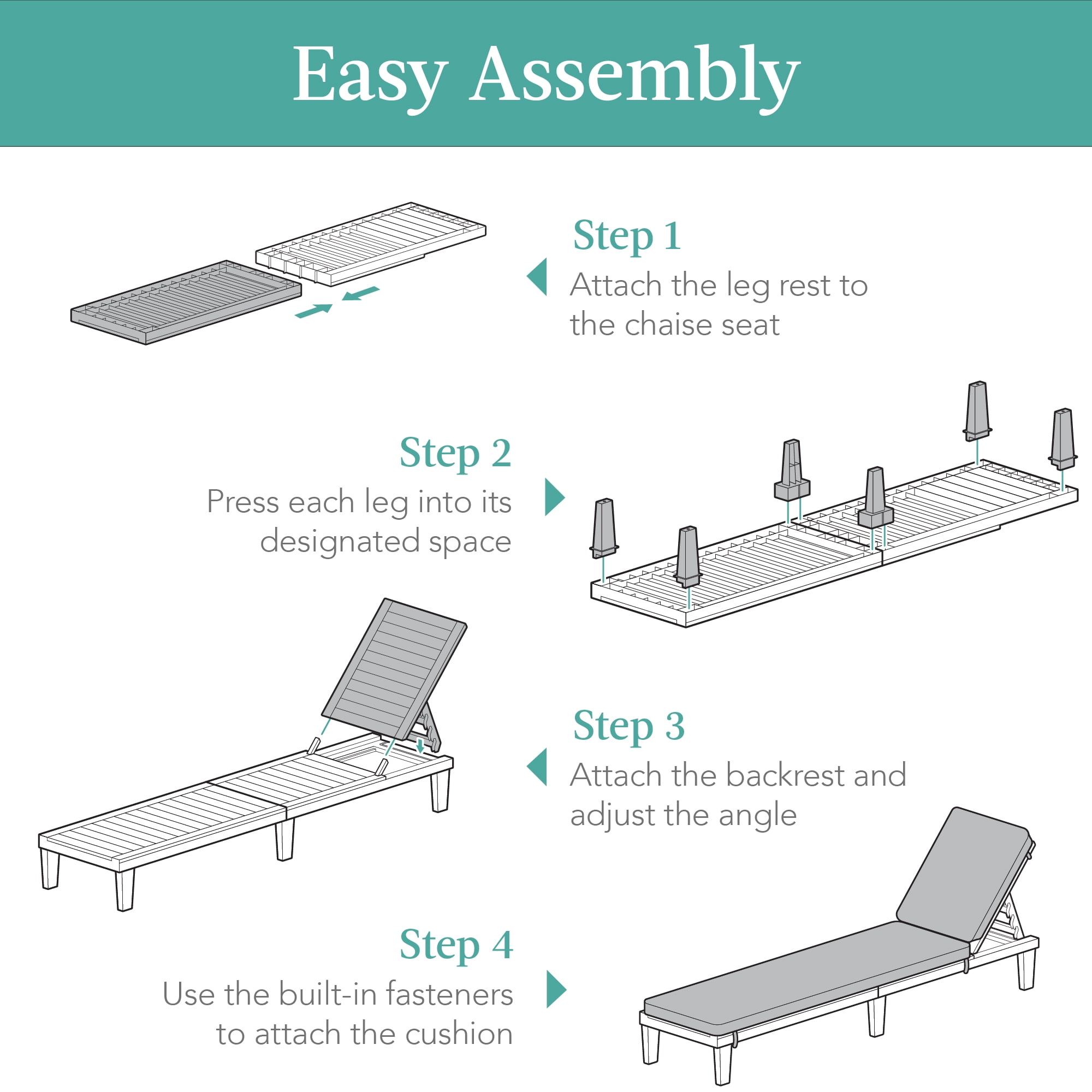 WATERPROOF FRAME: Durable PP resin comes decorated with a smooth wood-like texture, supports up to 330 pounds, and withstands wear from the elements with no need for maintenance COMFORTABLE CUSHIONS: Removable cushions use a set of six ties for easy attachment and removal, while a built-in zipper allows you to remove the weather-resistant cover for machine washing EASY ASSEMBLY: A tab-and-slot construction allows for a simple tool-free assembly; just four steps and up to 15 minutes, and you’re free to enjoy! ADJUSTABLE BACKREST: The backrest uses a notched track system to give you a choice of five sitting positions; sit upright and enjoy the view, or lie flat and tan STYLISH SEATING: This lounger features a sleek profile that blends seamlessly into any existing setup and turns any poolside, patio, or yard into a private lounge; OVERALL DIMENSIONS: 74.5″(L) x 22.6″(W) x 34.5″(H); WEIGHT CAPACITY: 330 lbs.