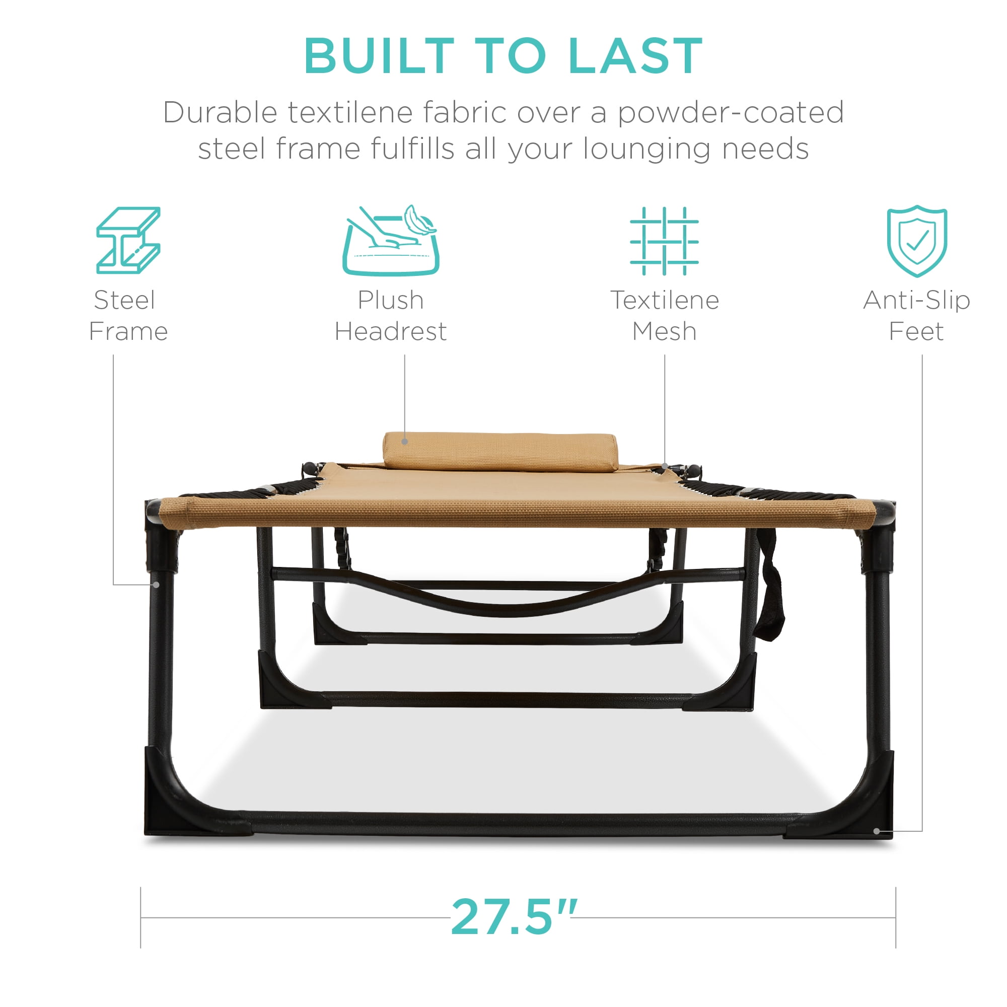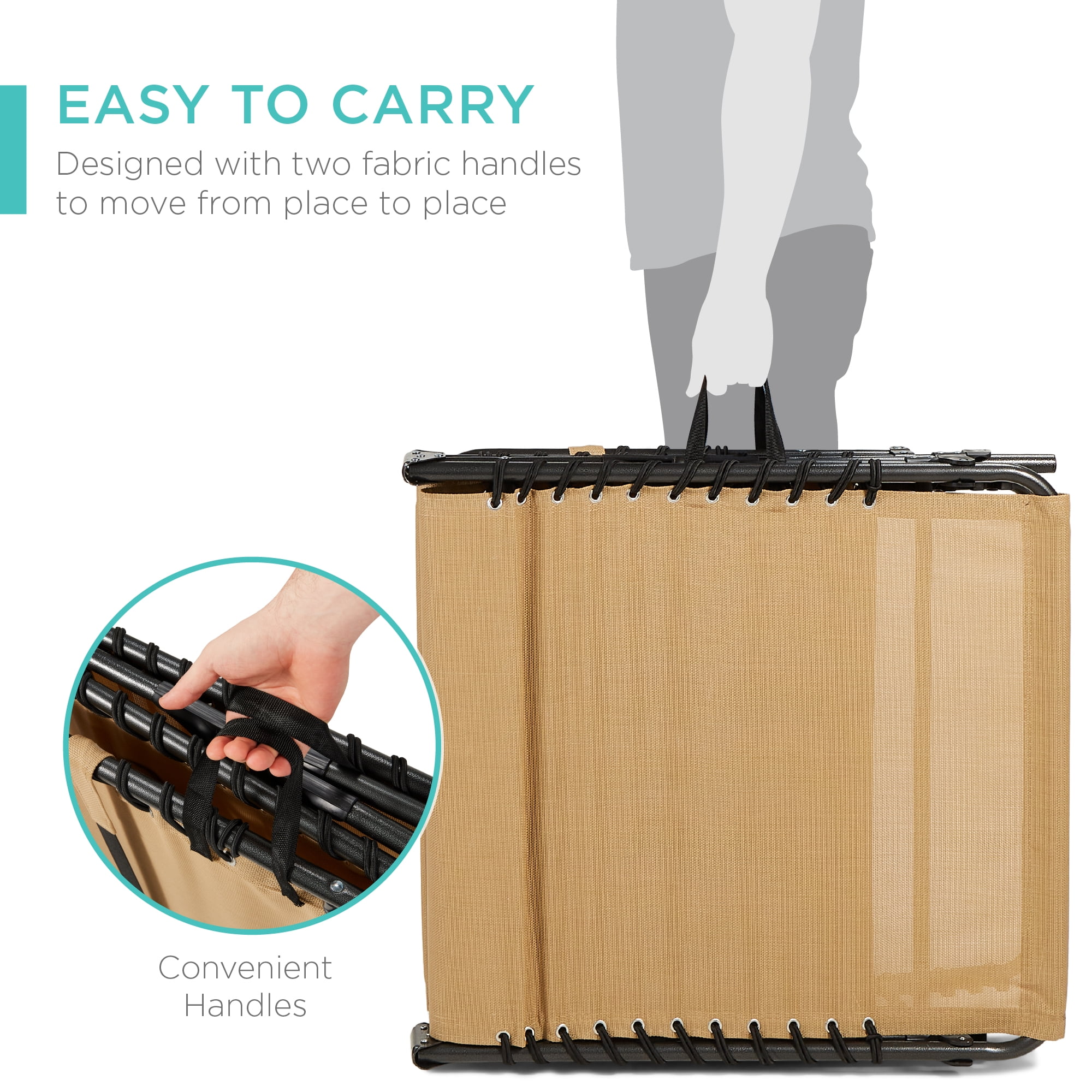 EASY TO CARRY: Conveniently folds into a compact package with two fabric handles on the sides that’s easy to carry from one place to another 8 LOUNGING POSITIONS: A simple lock and release system lets you freely adjust the backrest and footrest between eight comfortable lounging positions BUILT TO LAST: Textilene fabric on a 71in powder-coated steel frame pairs with all non-slip feet for long-lasting oxidation- and weather-resistant quality NO ASSEMBLY REQUIRED: Freely fold and unfold this seat without any tools needed-simply fold it up and store it away until you need it PERFECT ANYWHERE: The classic lounger design fits into your backyard, patio, or poolside setup, while its versatile design is welcome at the beach or camping; OVERALL DIMENSIONS: 74″(L) x 27.5″(W) x 12″(H); WEIGHT CAPACITY: 300 lbs.