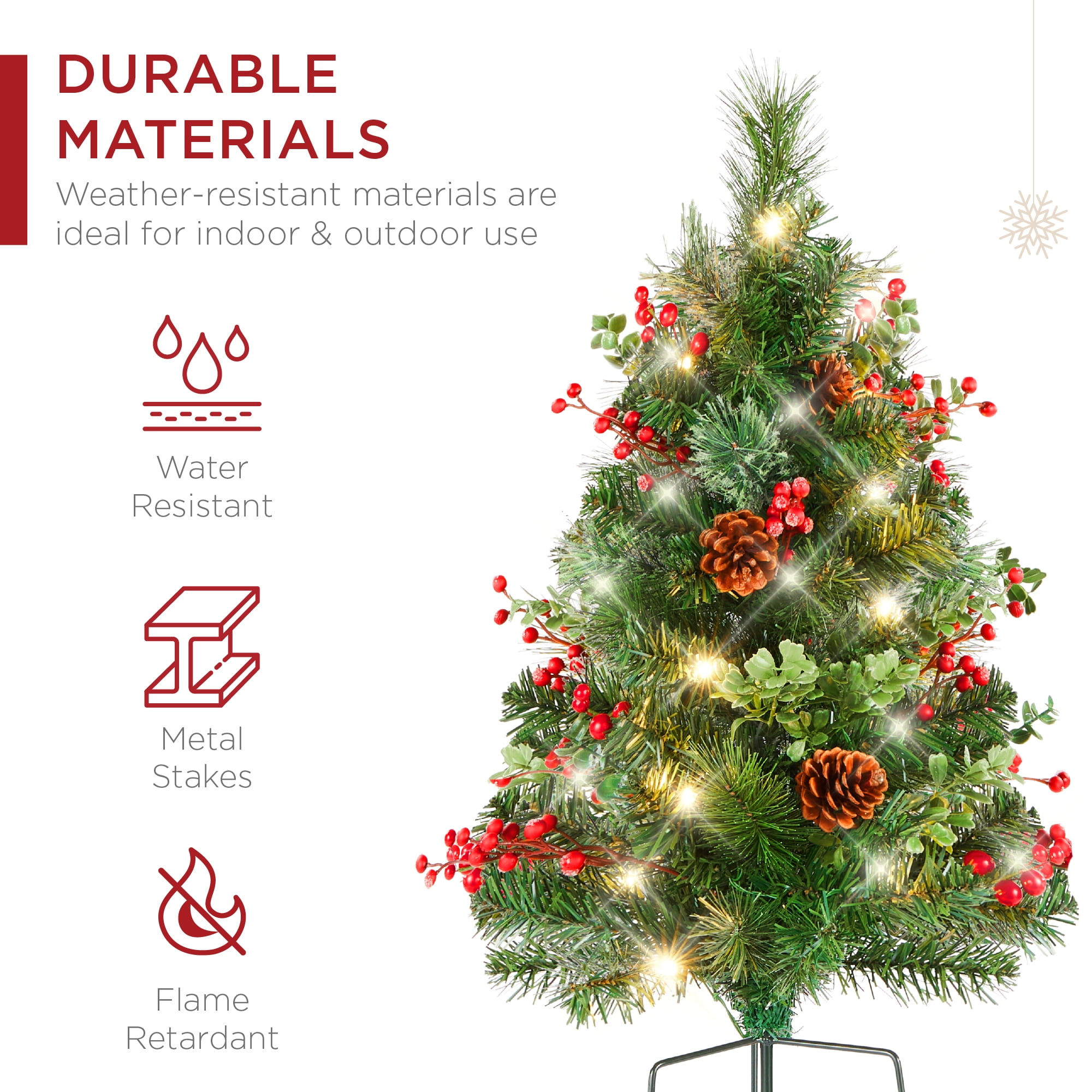 PERFECT HOLIDAY DECOR: This decorative, 24.5-inch pair of trees comes at the perfect size to make an eye-catching statement in your pathway or front lawn this holiday season DURABLE MATERIALS: Crafted with water-resistant materials, including flame-retardant PVC tips and durable metal stakes that keep your trees secure, so you can enjoy them for the holiday seasons to come! PRE-DECORATED DESIGN: Small pine cones and unique greenery/adornments (varies by style) create a beautiful natural look that bring a festive feel of the outdoors to your home MULTIFUNCTIONAL LED LIGHTS WITH TIMER: 30 LED lights with warm white and multicolored settings (Green w/Berries has white lights only) are pre-strung in each tree to save time while a built-in timer adds an additional spark to your wintery wonderland CORDLESS & BATTERY-OPERATED: Using these trees outdoors is simplified with battery boxes that eliminate the need for plug-in outlets, so you can stake them anywhere; OVERALL DIMENSIONS: 17″(Dia) x 30″(H)