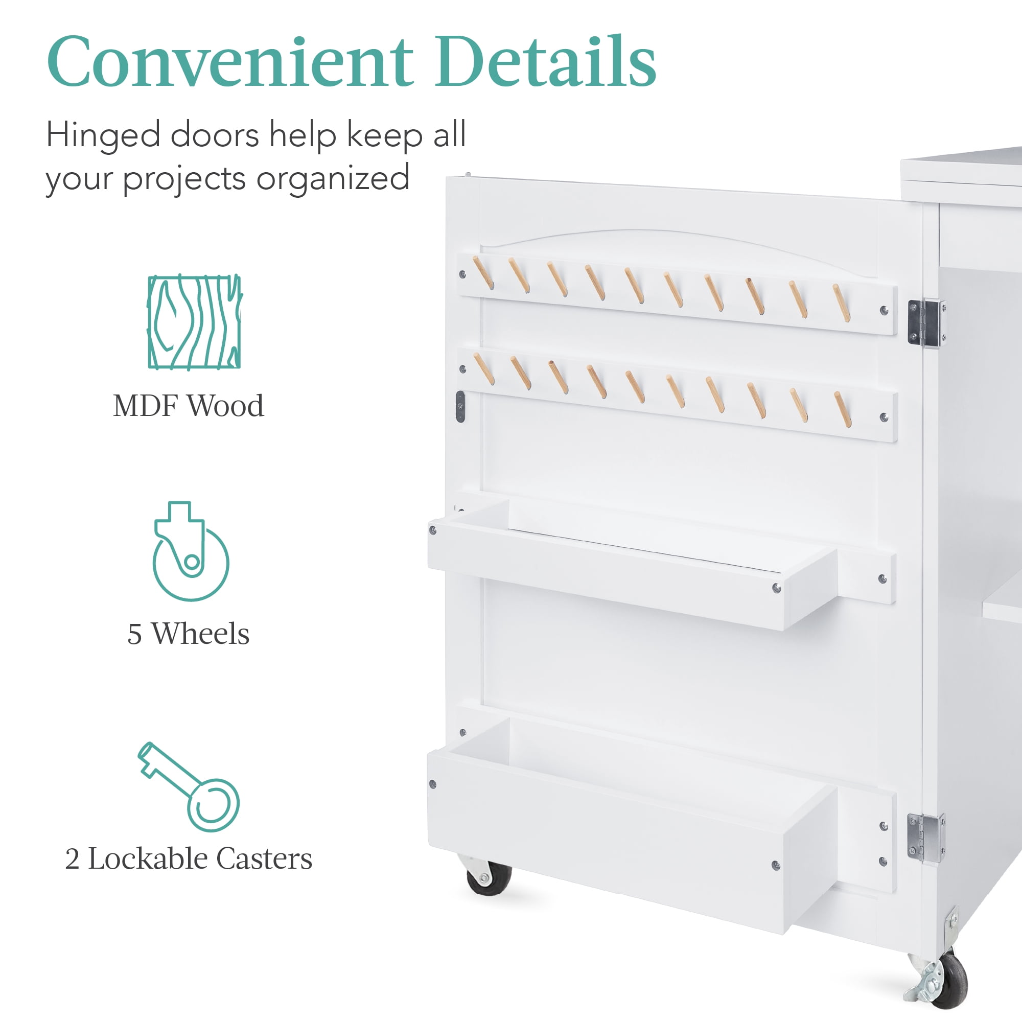STORAGE SPACE: Create fashion pieces in a breeze with a designated spot for yarn, pins, scissors, and materials in 2 rows of pegs, 2 attached storage trays, 1 large interior shelf, and a large tabletop space MULTIPURPOSE STATION: Use your station to tailor clothes, or use your space for other crafts, and even as a convenient work desk MOBILE SPACE-SAVING DESIGN: When not using your table, wheels with casters make it easy to move your station to a convenient spot to be used as a side table CONVERTIBLE SIDE TABLE: When finished using your station, tuck away your supplies, and close your sewing table into a compact side table that looks well in any room CONVENIENT DETAILS: MDF wood build with metal hinges provide a wobble-free experience while lockable wheels and magnetic door locks keep supplies from falling out when moving; OPEN DIMENSIONS: 46″(L) x 14.75″(W) x 30.5″(H); CLOSED DIMENSIONS: 23″(L) x 14.75″(W) x 31″(H)