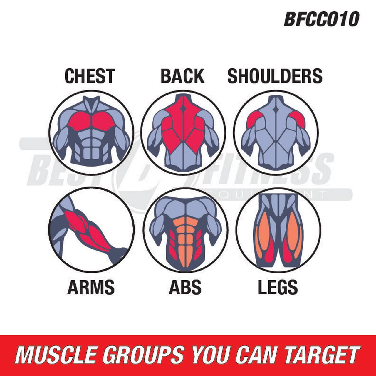 This cable crossover machine allows users to access a near-unlimited number of high and low pulley exercises while working every major muscle group. The BFCCO10 Cable Crossover features a no cable change design and 180-degree swiveling pulleys for frictionless movements in all directions. The professional carriage system on the BFCCO10 utilizes patented nylon bushings that glide on chrome guide rods for incredibly smooth action. Sturdy construction and an extra-wide mainframe provides users with a high-quality machine that is both cost-effective and budget-friendly. The Best Fitness BFCCO10 Cable Crossover is a dynamic addition to any home gym and garage gym exercise program.