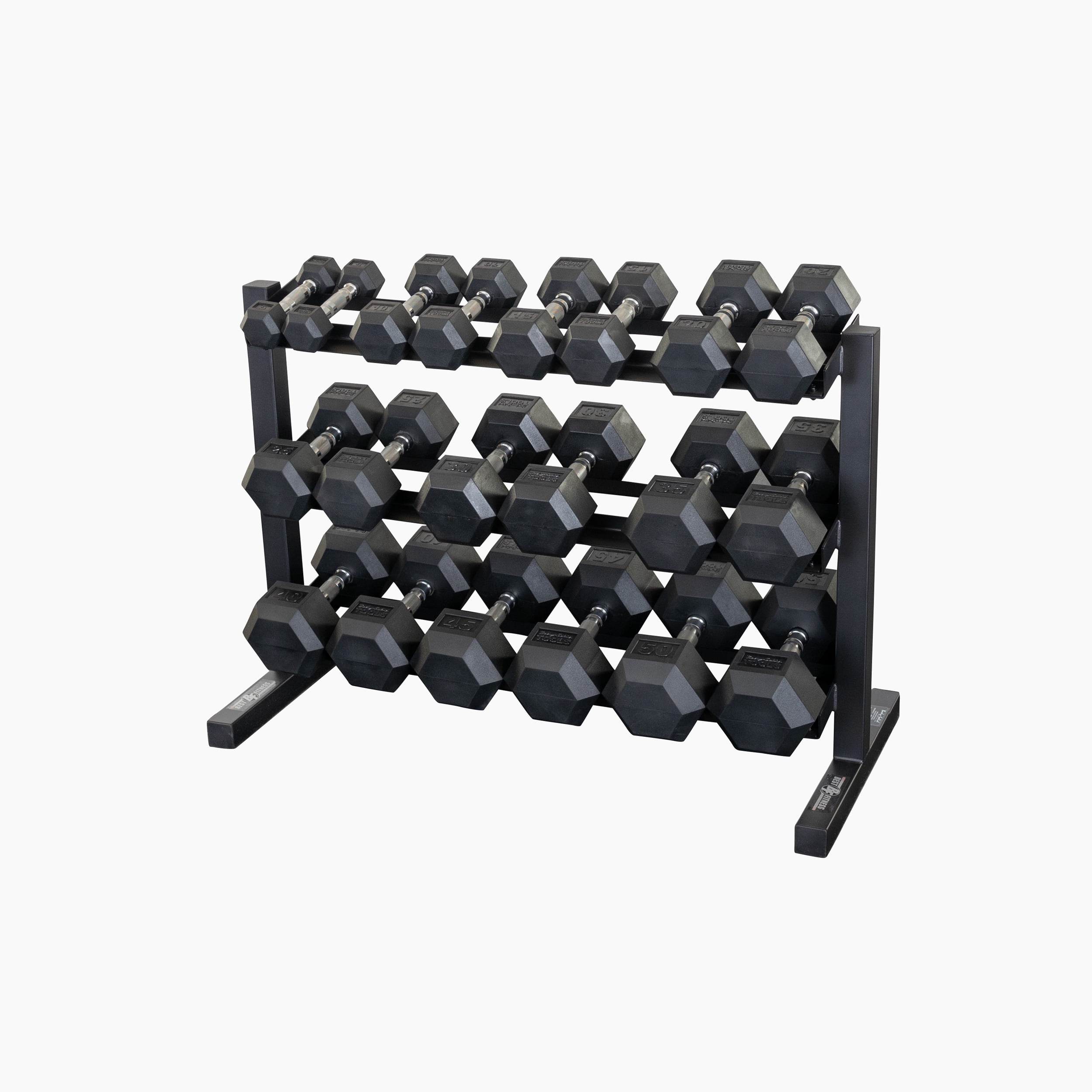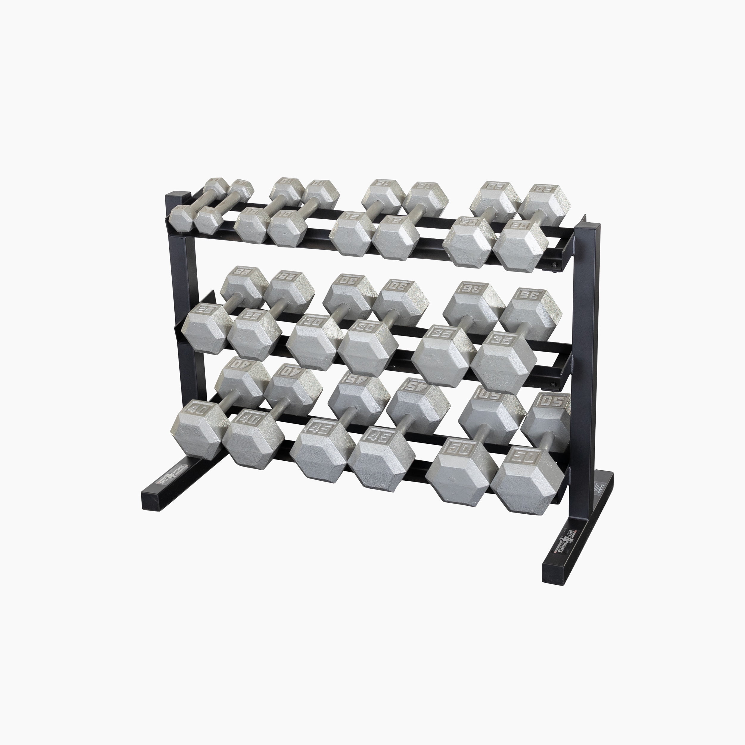The Best Fitness BFDR10B Dumbbell Rack is a sturdy, space-efficient and stable rack designed to keep workout areas clean, organized and safe. This three-tier dumbbell rack stores 10 pairs of hex dumbbells between 5-50 lbs. Featuring a durable powder-coat finish, the BFDR10B will stay scratch-free even in heavy use.
