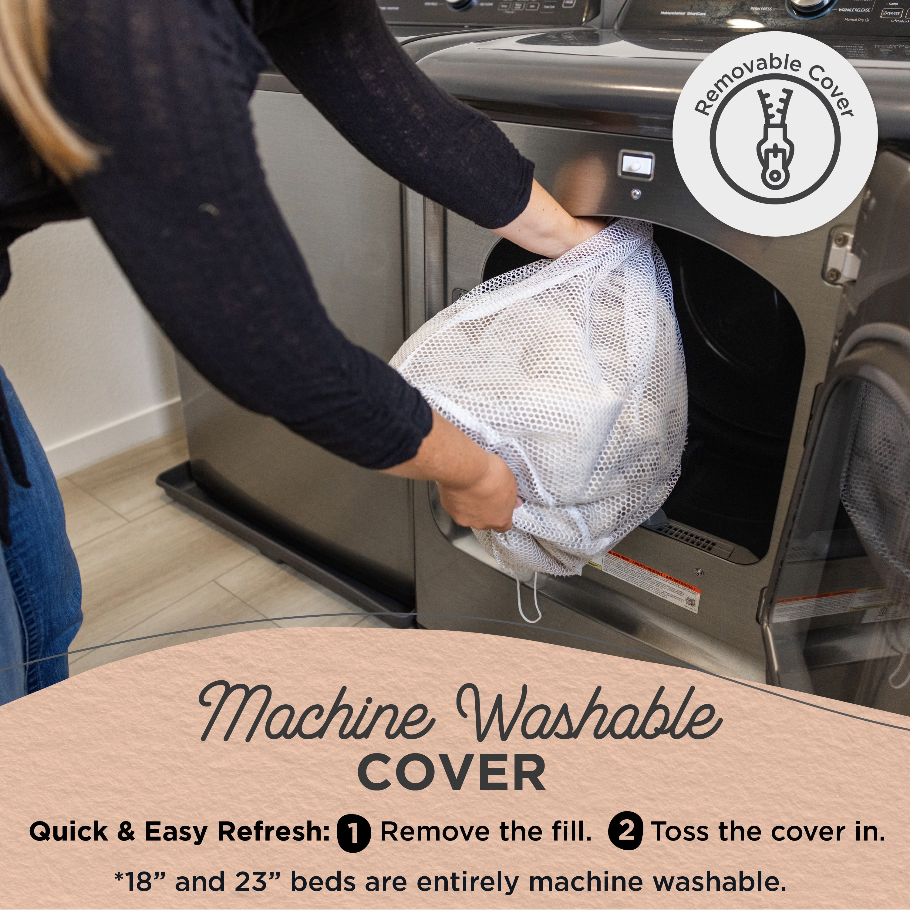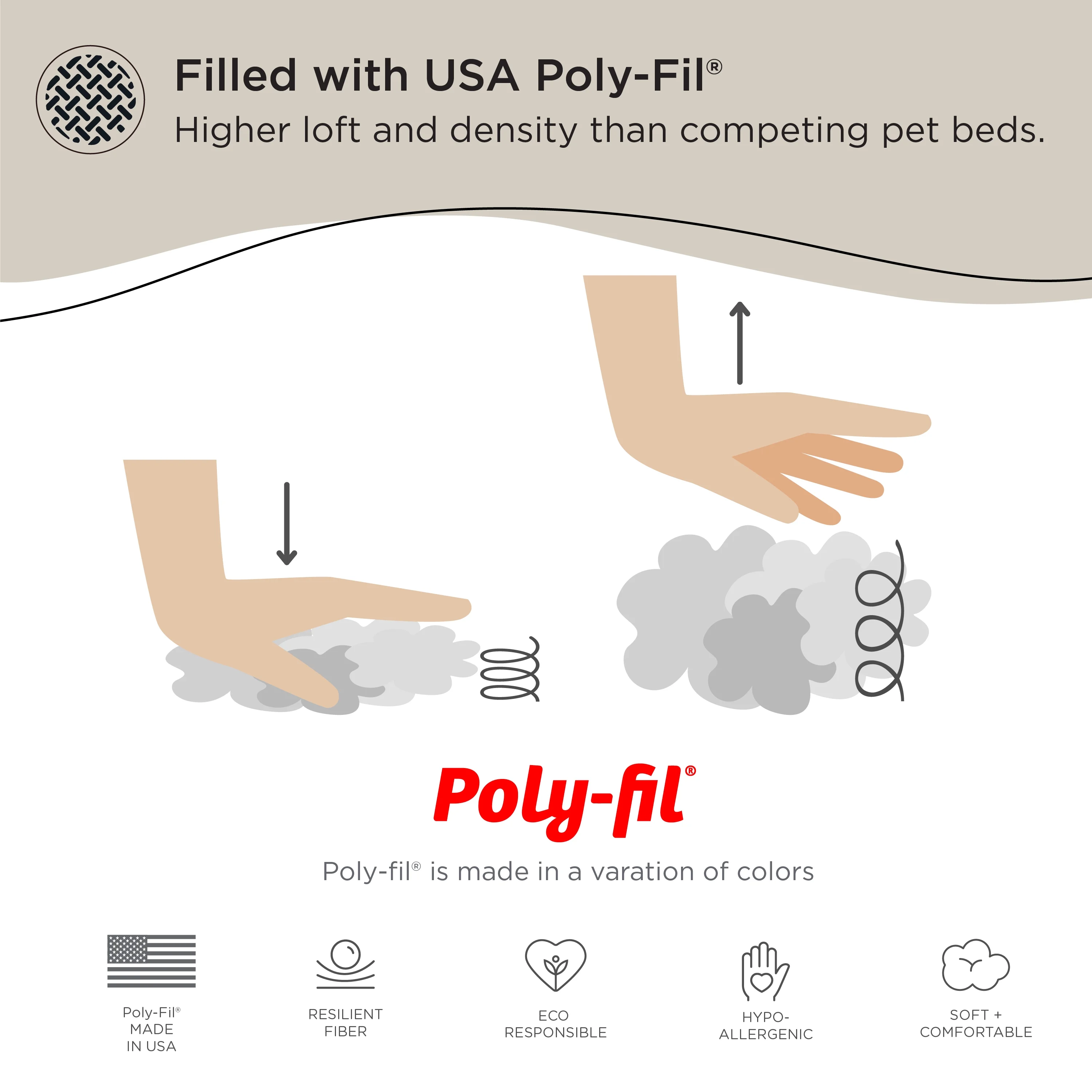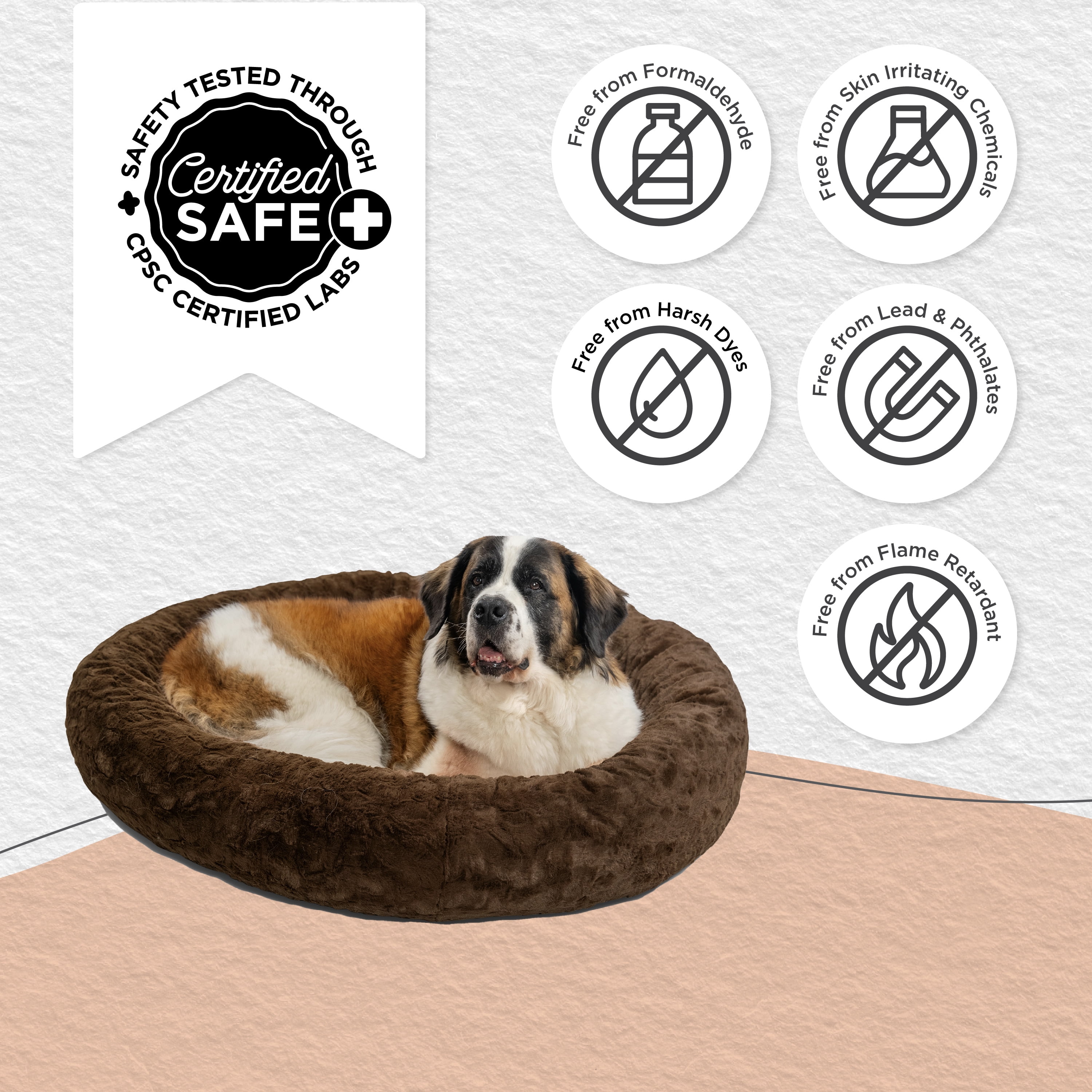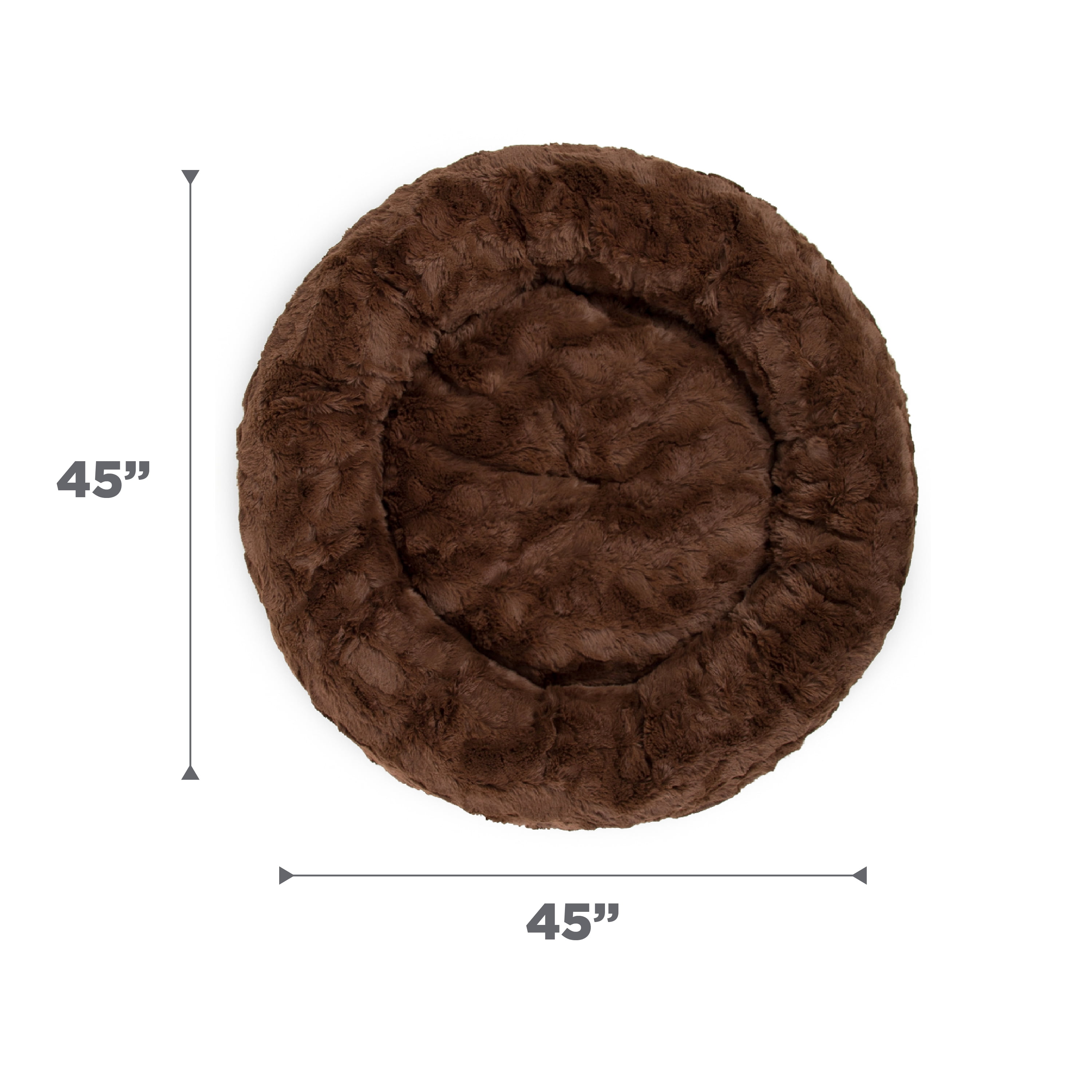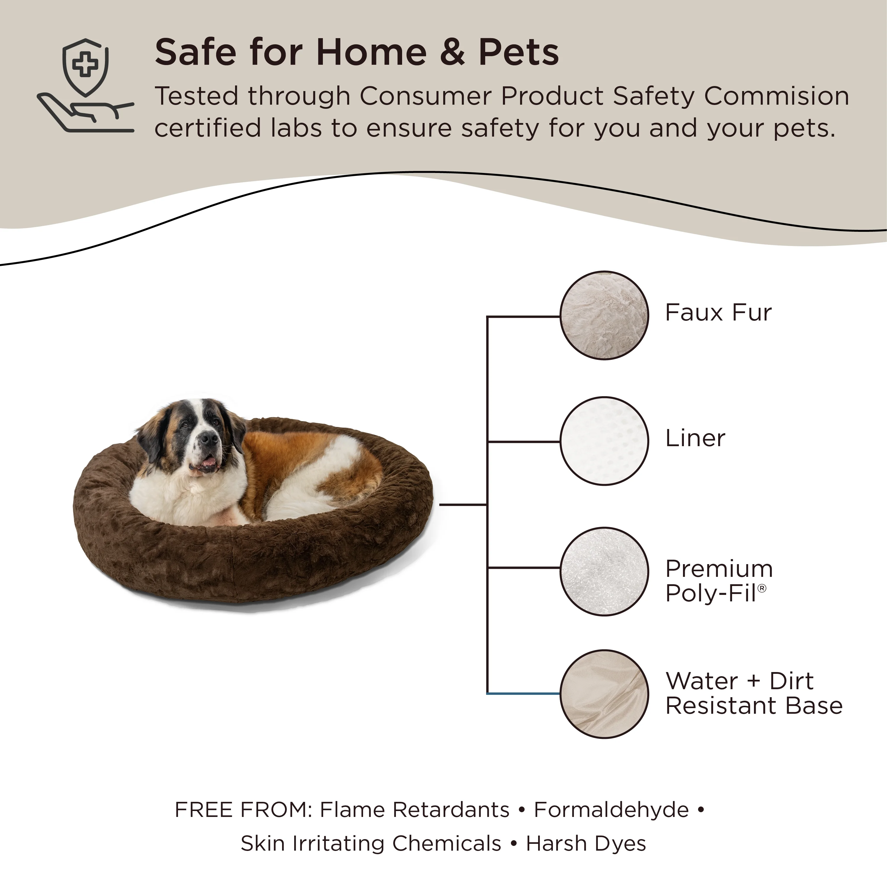 DONUT PET BED; 45 in round dog bed for pets up to 150 lbs; this includes breeds such as Bernese Mountain Dog, Saint Bernard, Newfoundland, Bullmastiff, etc CALMING COMFORT DESIGN; the bed’s round shape, 9 in tall bolster, and soft self-warming faux fur make this the perfect bed for cuddling up and burrowing, helping to calm dog anxiety and provide a sense of security while your pet sleeps LOFTY AND SUPPORTIVE; filled and with premium high loft and high density polyfill for long-lasting support and comfort SAFE FOR HOME AND PETS; made with materials that are free from harsh dyes, skin irritating chemicals, formaldehyde, and flame retardants MACHINE WASHABLE BED SHELL; use zippers to remove interior fill; machine wash bed shell only; please see our pro tips and special care instructions for more details