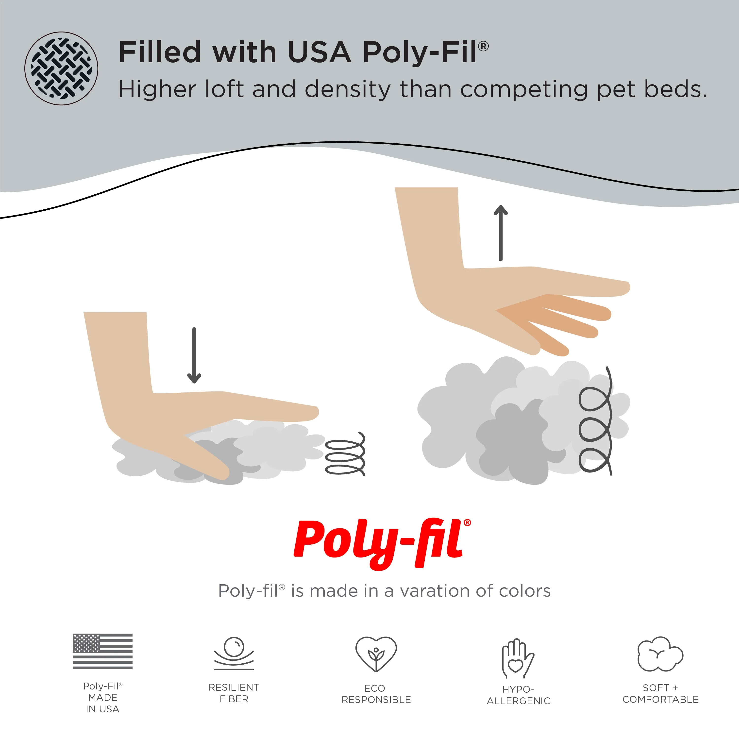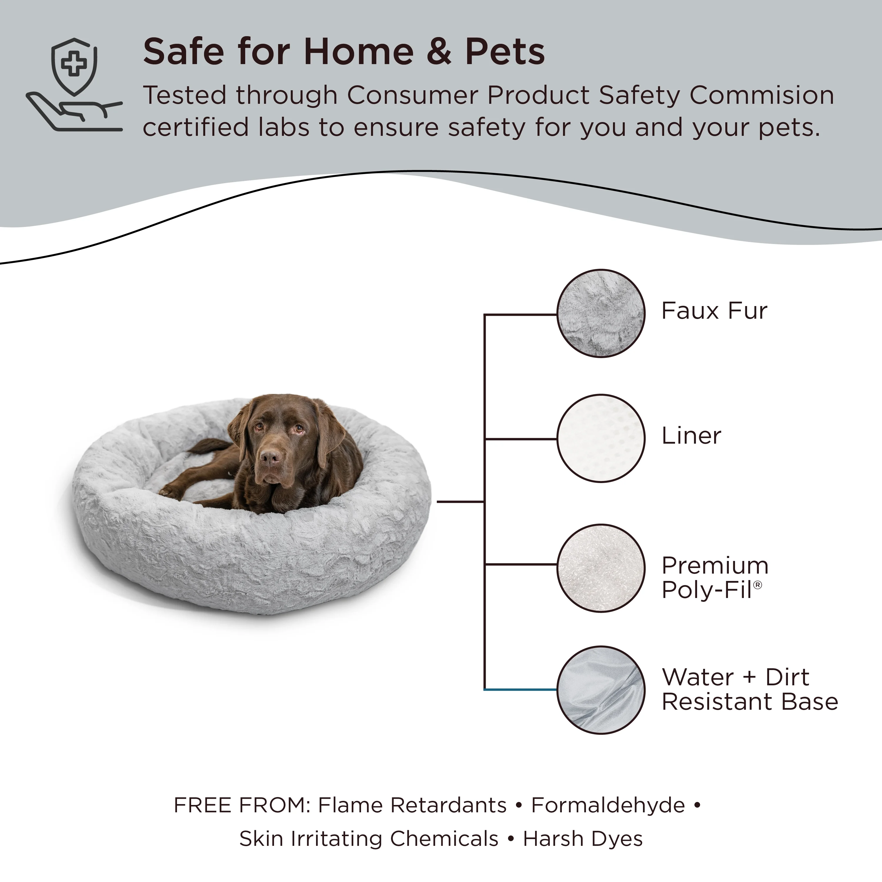 DONUT PET BED; 36 in round dog bed for pets up to 100 lbs; this includes breeds such as Australian Shepherd, Siberian Husky, Border Collie, Labrador Retriever, Golden Retriever, German Shepherd, Boxer, Poodle, Dalmatian, etc CALMING COMFORT DESIGN; the bed’s round shape, 9 in tall bolster, and soft self-warming faux fur make this the perfect bed for cuddling up and burrowing, helping to calm dog anxiety and provide a sense of security while your pet sleeps LOFTY AND SUPPORTIVE; filled and with premium high loft and high density polyfill for long-lasting support and comfort SAFE FOR HOME AND PETS; made with materials that are free from harsh dyes, skin irritating chemicals, formaldehyde, and flame retardants MACHINE WASHABLE BED SHELL; use zippers to remove interior fill; machine wash bed shell only; please see our pro tips and special care instructions for more details