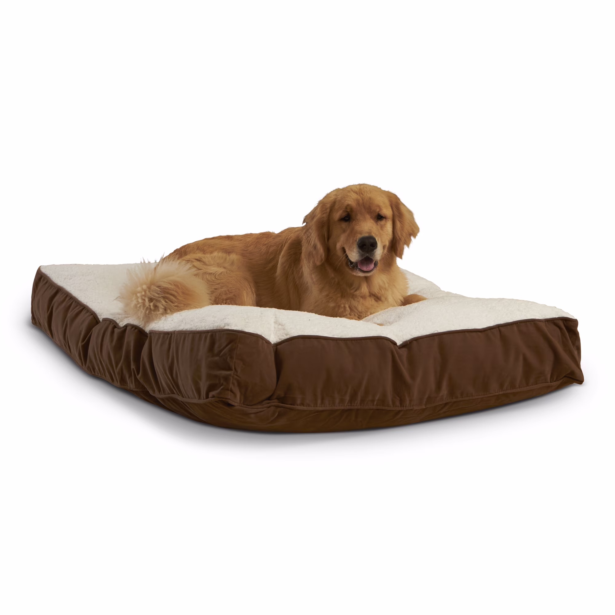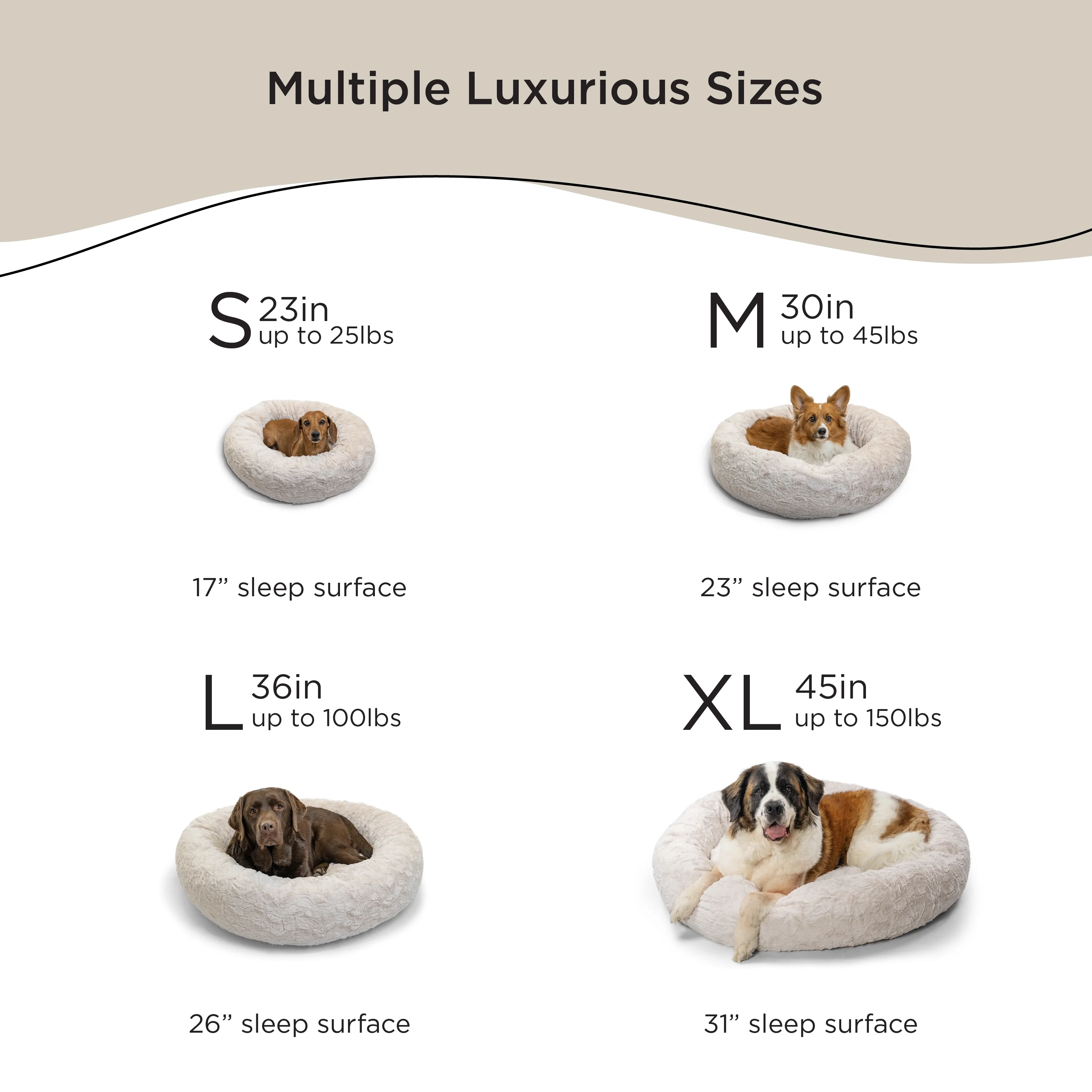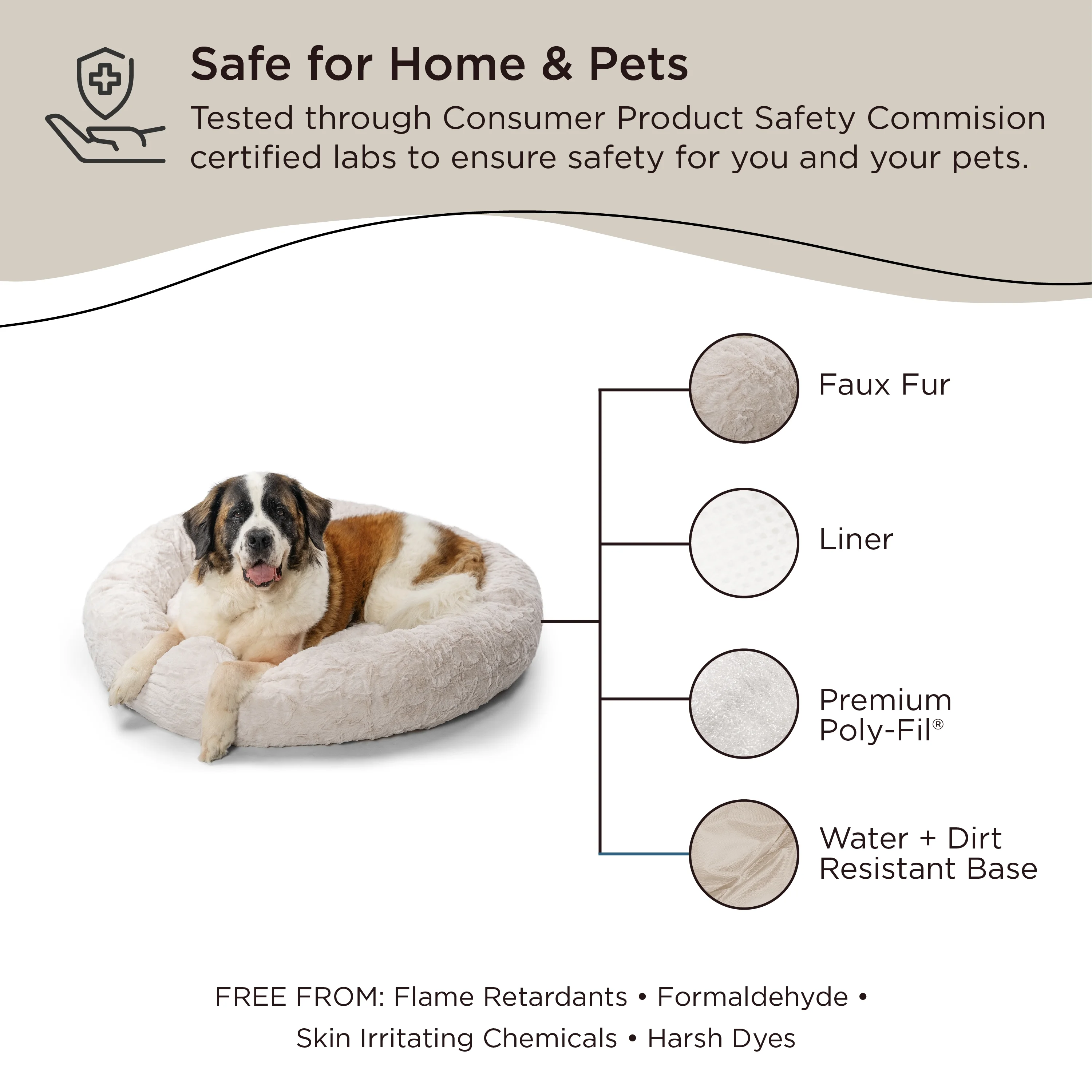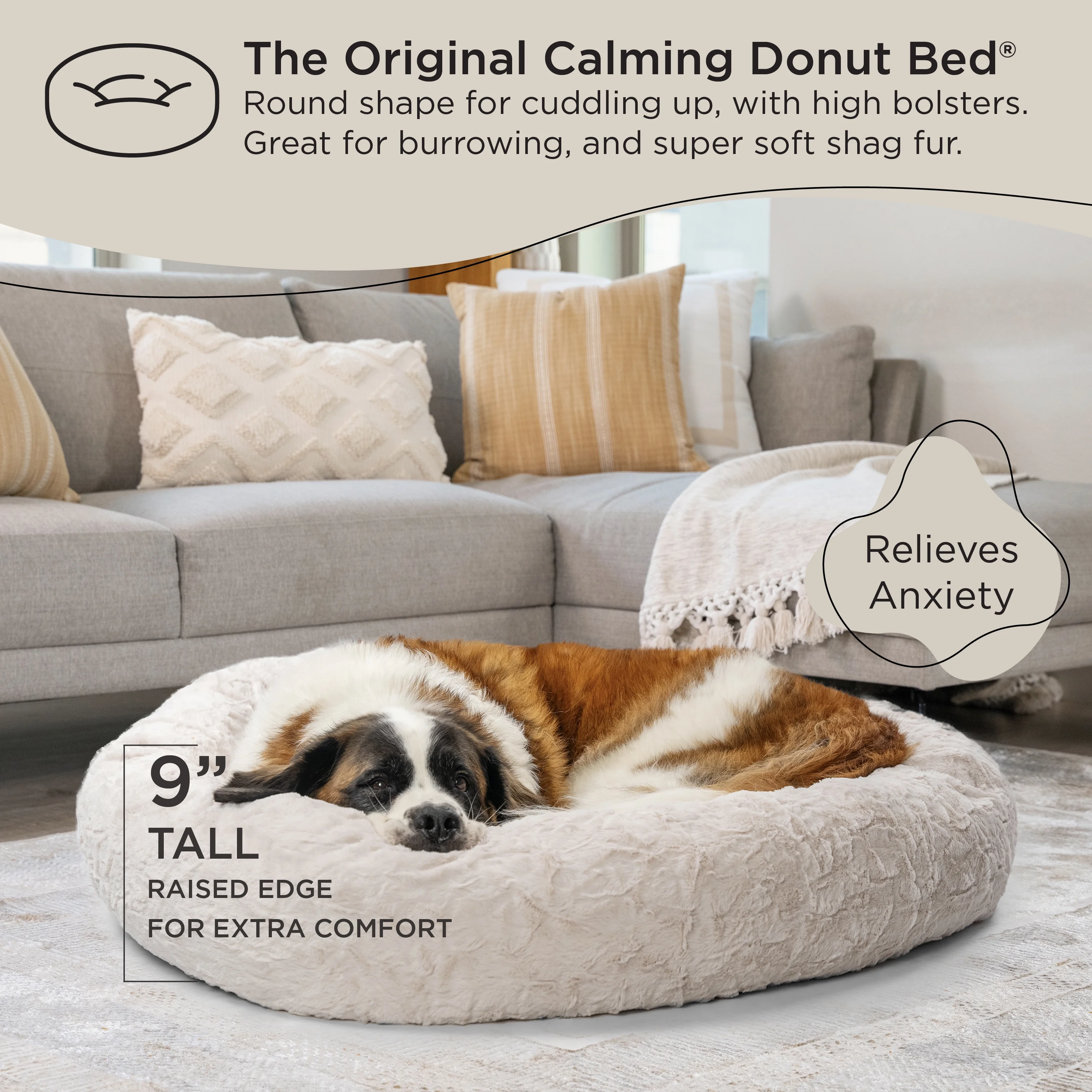 DONUT PET BED; 45 in round dog bed for pets up to 150 lbs; this includes breeds such as Bernese Mountain Dog, Saint Bernard, Newfoundland, Bullmastiff, etc CALMING COMFORT DESIGN; the bed’s round shape, 9 in tall bolster, and soft self-warming faux fur make this the perfect bed for cuddling up and burrowing, helping to calm dog anxiety and provide a sense of security while your pet sleeps LOFTY AND SUPPORTIVE; filled and with premium high loft and high density polyfill for long-lasting support and comfort SAFE FOR HOME AND PETS; made with materials that are free from harsh dyes, skin irritating chemicals, formaldehyde, and flame retardants MACHINE WASHABLE BED SHELL; use zippers to remove interior fill; machine wash bed shell only; please see our pro tips and special care instructions for more details