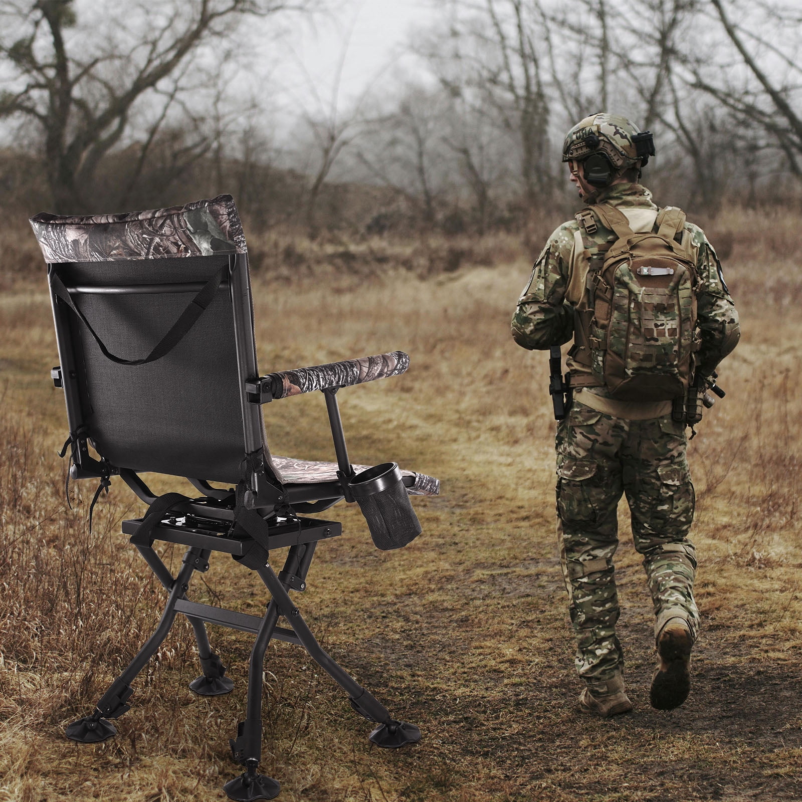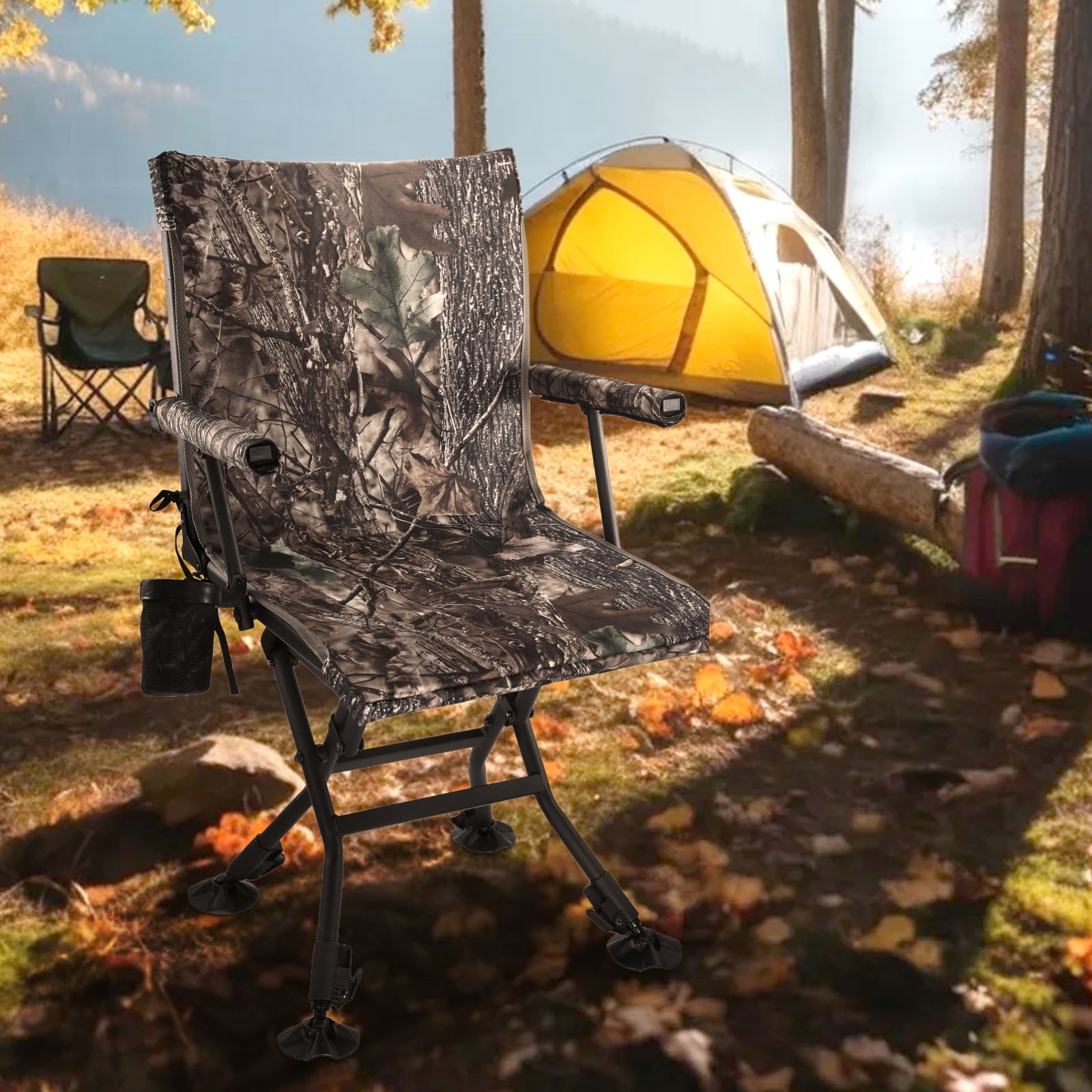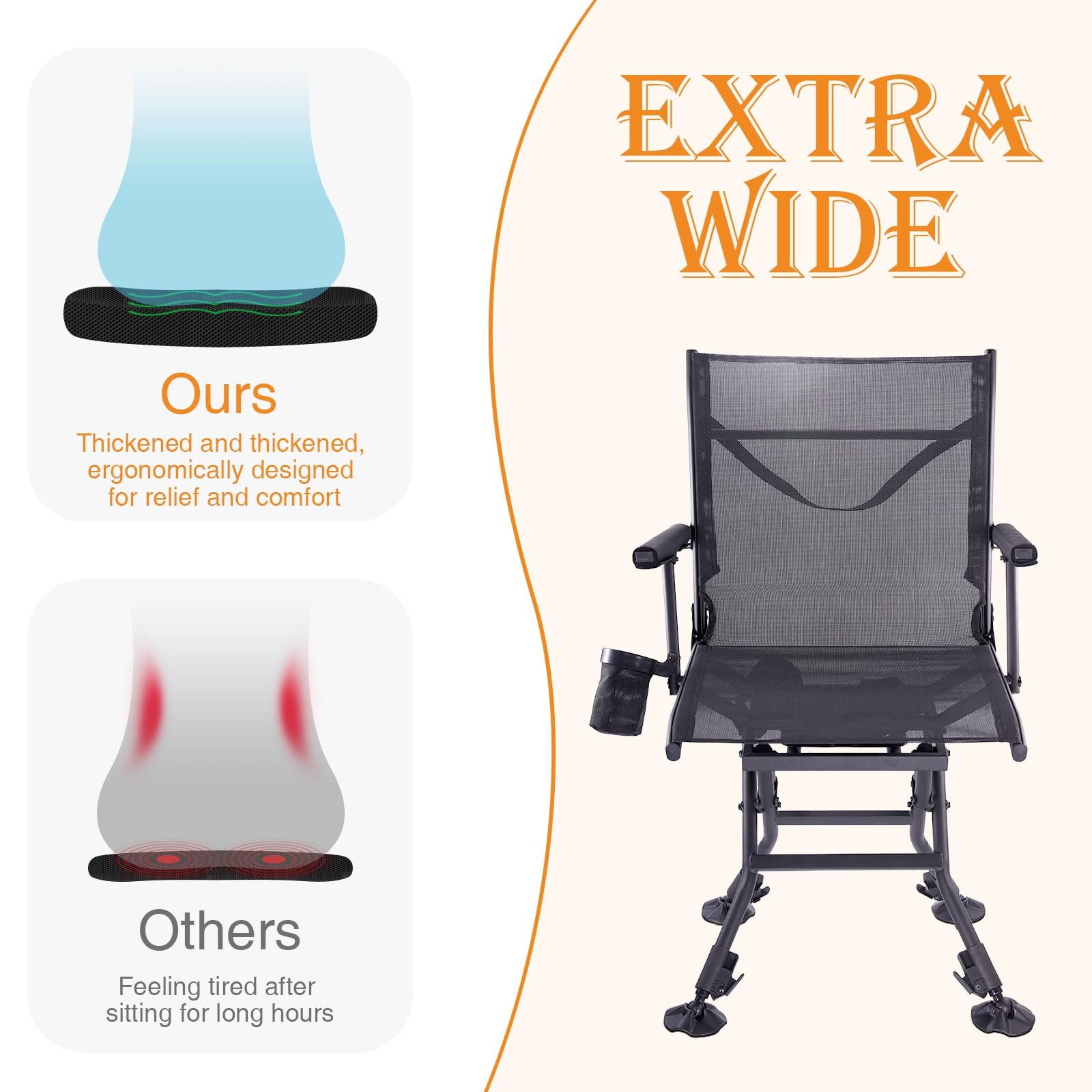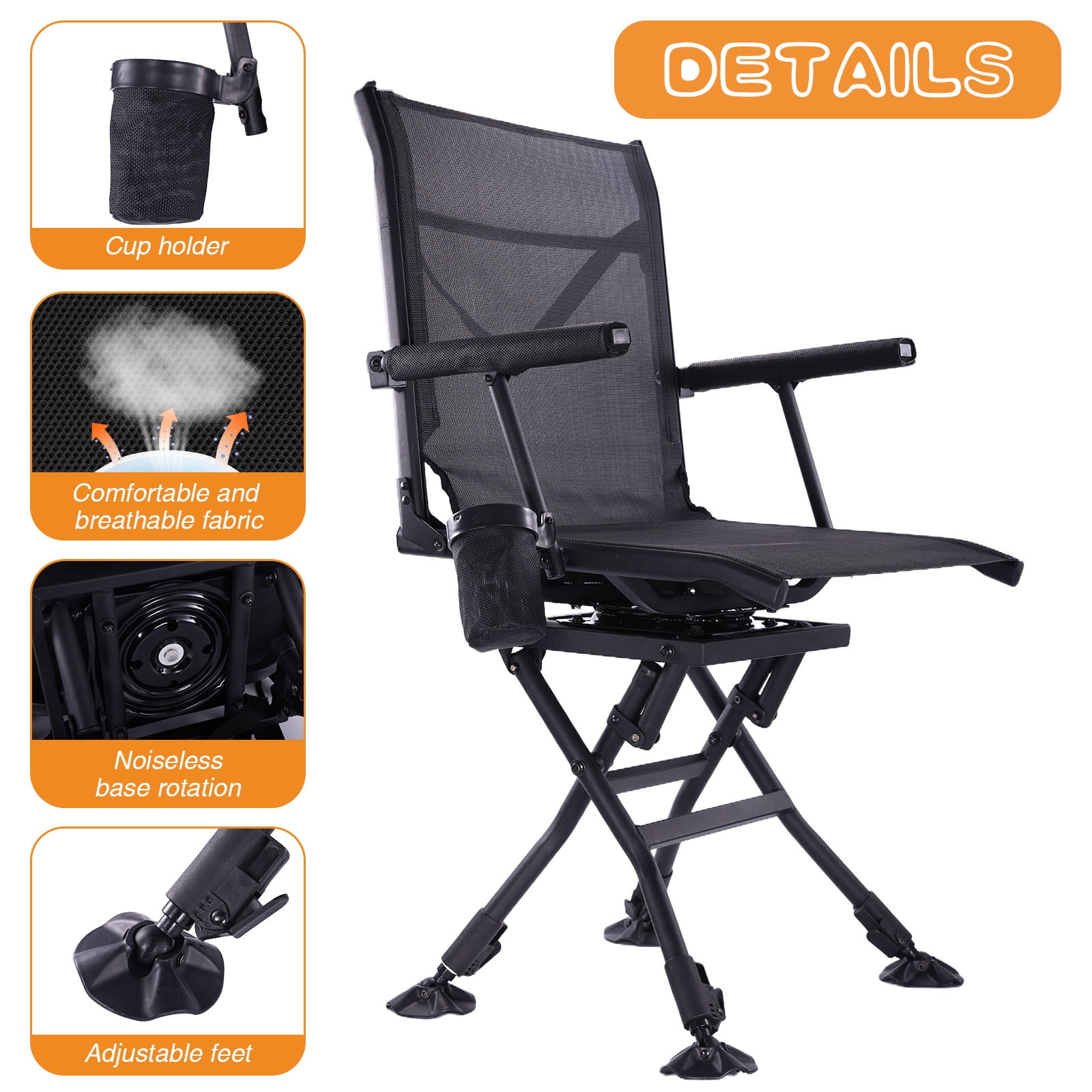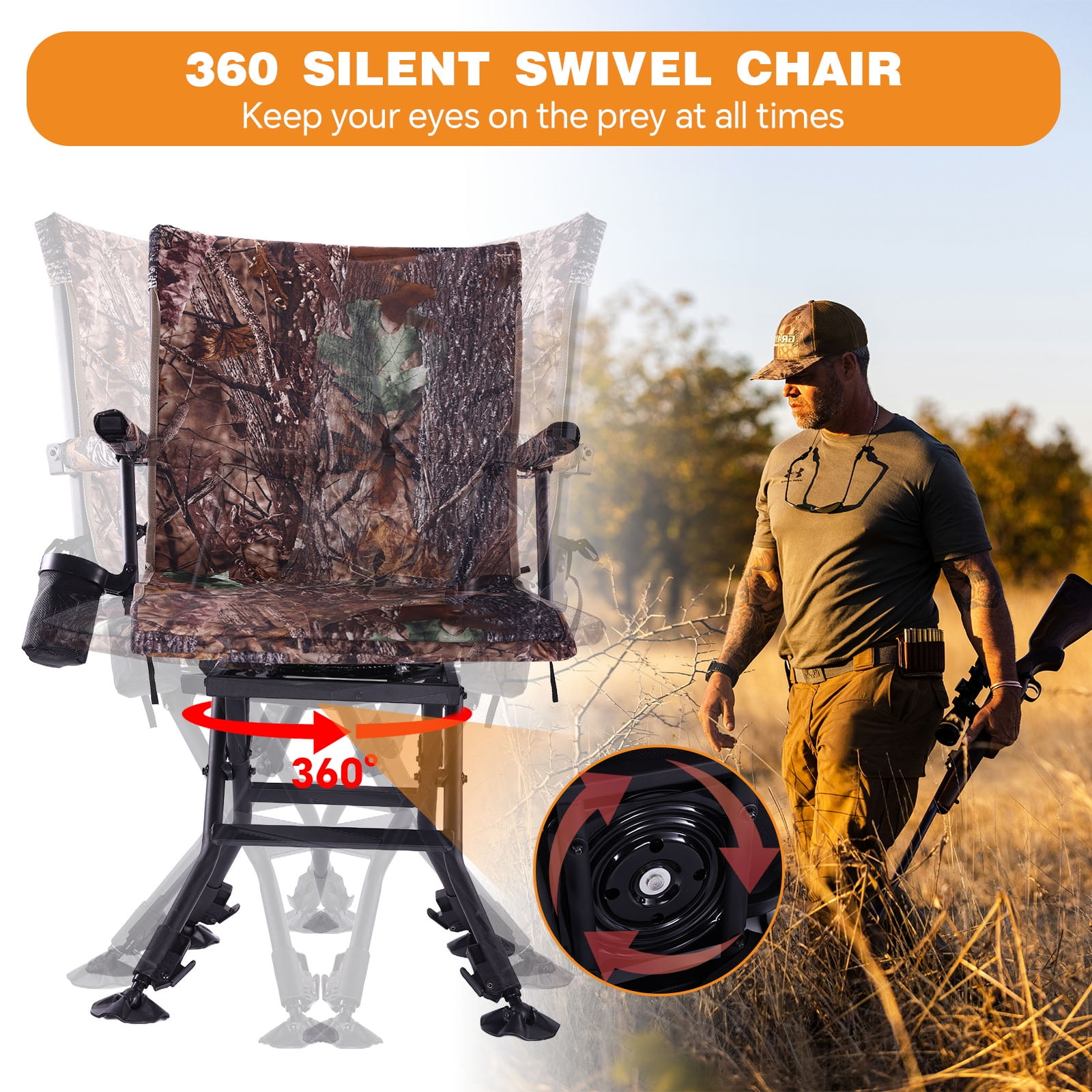 Item Features: Extra Wide Comfort: Unlike other 17.5″ Wide hunting chairs, our chair offers an extra-wide(20″ in width and 17.5″ in depth) seat to provide ample space and comfort during long hours in the field. You’ll appreciate the additional room, making your hunting experience more enjoyable. Interchangeable Fabric Cover: Easily switch between a black mesh and camo fabric cover to blend seamlessly into your environment. The camo cover is perfect for blending into natural surroundings, while the black mesh is ideal for warmer weather and increased breathability. No Assembly Required: Enjoy the convenience of our one-piece design that requires no assembly. Simply unfold and use, making it perfect for quickly changing hunting spots without the hassle of setup and breakdown. Built-In Cup Holder: Keep your beverage close at hand with the built-in cup holder. Stay hydrated and maintain your focus without the need to leave your seat. Quiet Operation: Designed for silence, our chair ensures you won’t give away your position with squeaky noises. Move smoothly and quietly as you swivel, keeping your presence undetected by your target.