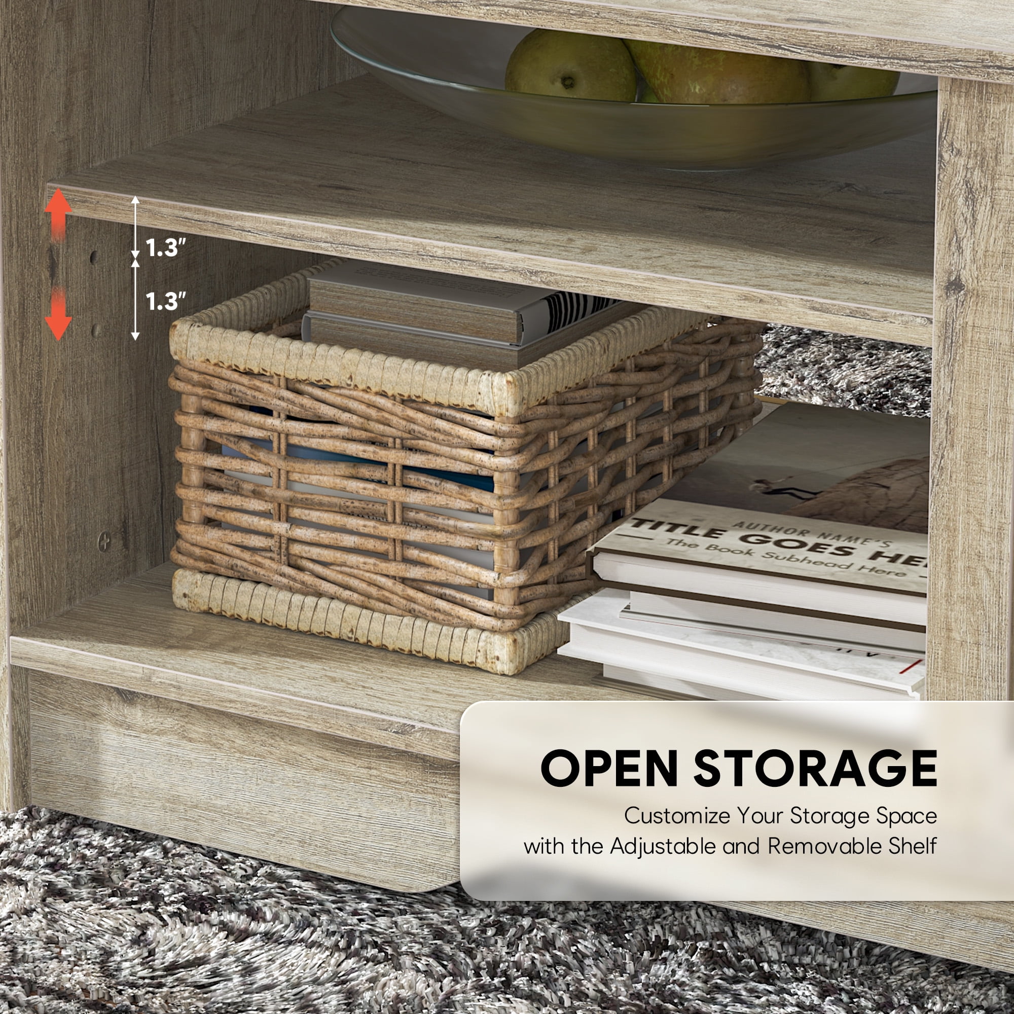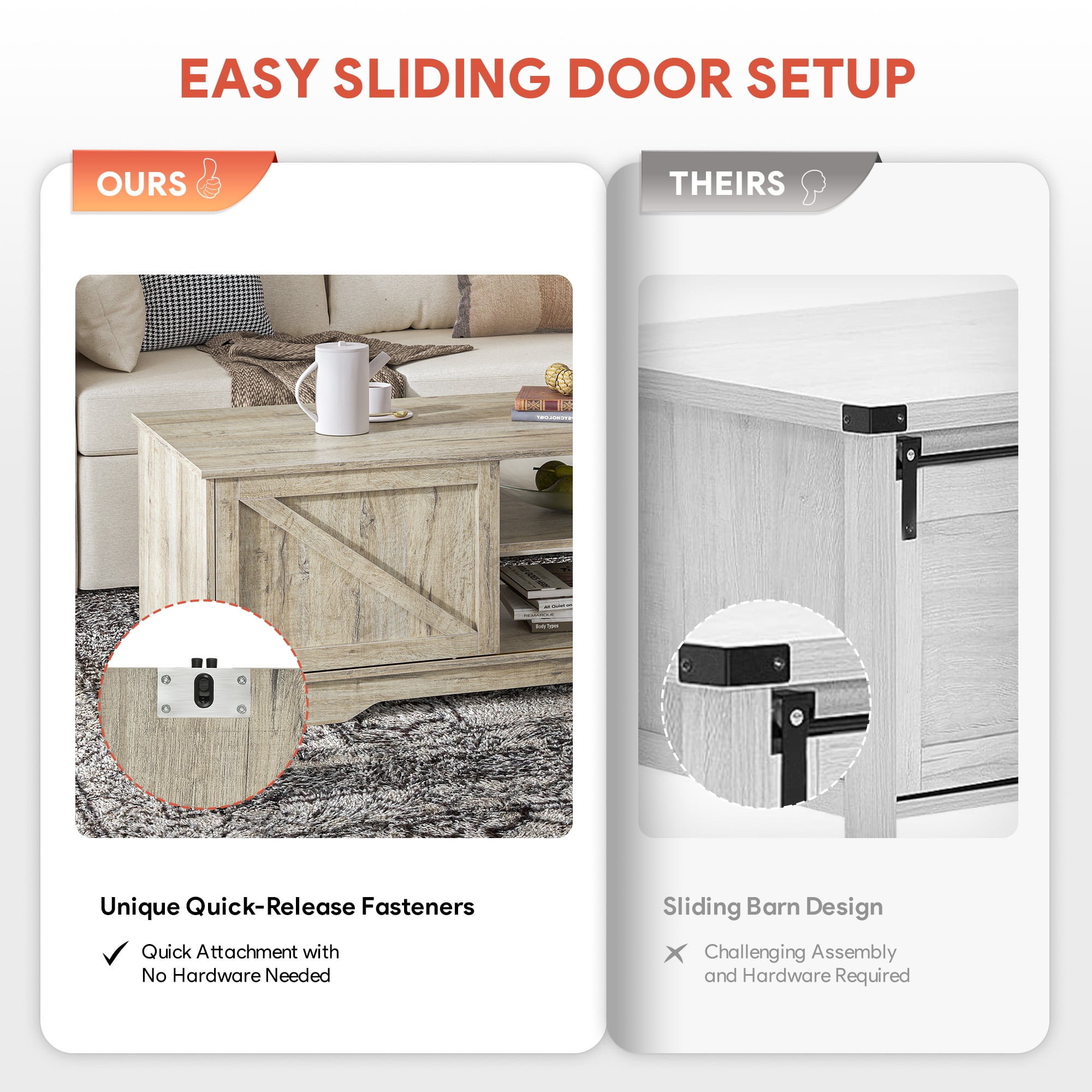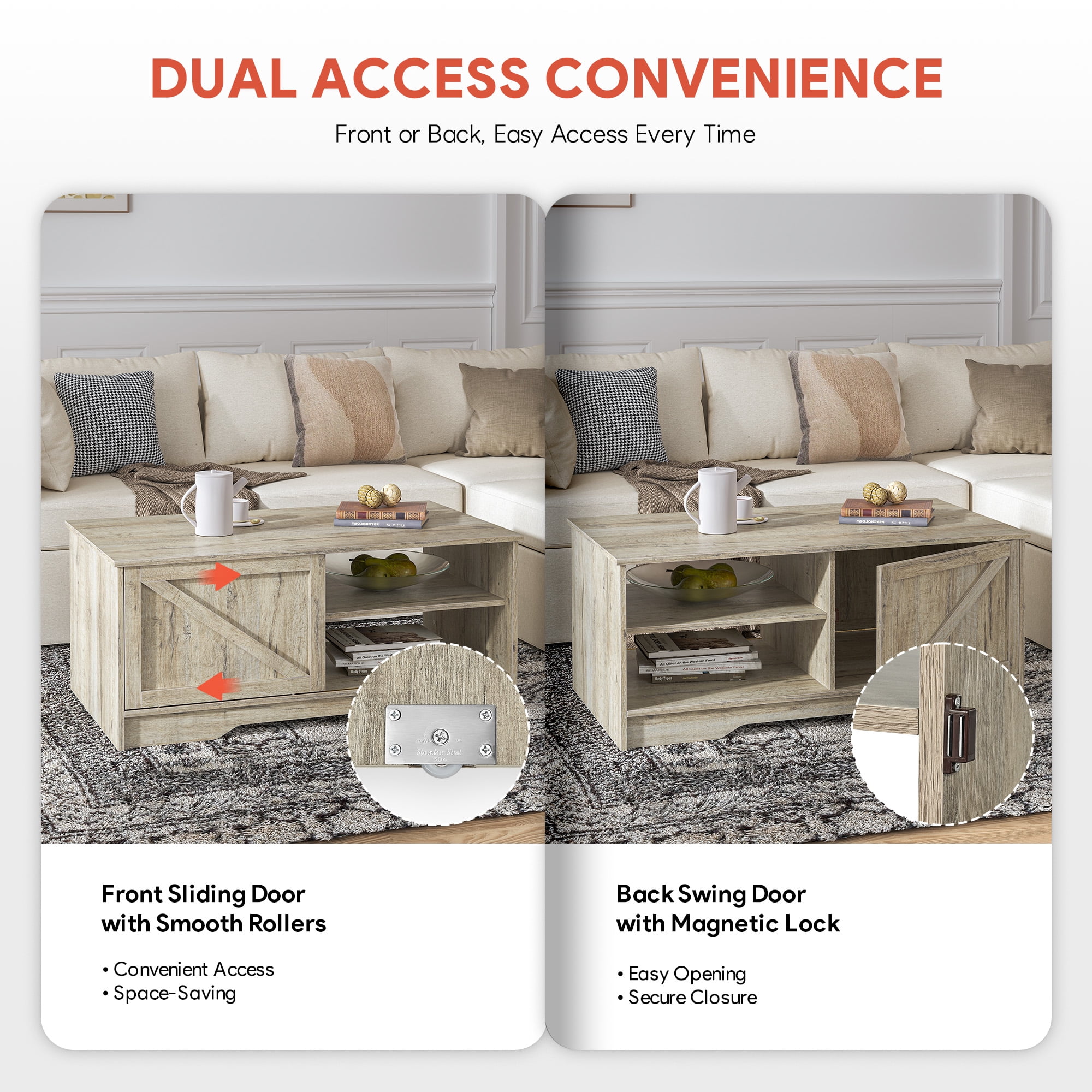 Features Effortless Retro Elegance: This farmhouse coffee table from effortlessly becomes the centerpiece of your room with its captivating blend of rustic charm and practical functionality, infusing a cozy, retro vibe into any interior style, from modern to traditional and eclectic decor. Access from All Angles: This coffee table with storage features a sliding door at the front and a swing door at the back, ensuring easy access to stored items from any angle. It keeps belongings within reach while maintaining a sleek appearance. Ample Storage Solution: Maximize your living space’s organization potential with this coffee table. With a spacious 42×23.6 in. tabletop, a hidden cabinet, and open shelves, it is perfect for both showcasing decor and keeping everyday essentials neatly organized. Easy Sliding Door Setup: Our unique sliding door features quick-release fasteners for easy attachment to the table and smooth rollers for effortless opening and closing. Installation is much simpler than traditional barn doors, as no tools or hardware are needed. Sturdy and Stable Design: Made of thickened MDF with MFC veneer, our coffee table with sliding door is odor-free and wear-resistant, capable of safely supporting weights up to 200 lbs. Its widened bases ensure enhanced stability, preventing any wobbling or shaking. Infuse your living space with the timeless allure of this farmhouse coffee table. Inspired by rustic farmhouse designs, our coffee table with storage seamlessly blends vintage charm with modern practicality. Whether you’re aiming for a cozy farmhouse vibe or a sleek contemporary look, this versatile piece is sure to enhance the ambiance of your room. But it’s not just about looks. With a spacious 42×23.6 inch tabletop and a hidden cabinet, our wood coffee table offers ample storage solutions to keep your space organized and clutter-free while maintaining a sleek and streamlined design. Plus, the sliding door at the front and the swing door at the back ensure easy access to your stored items, whether you’re reaching for your favorite book or stashing away essentials. Elevate your home’s style and enjoy seamless organization with this beautifully crafted farmhouse coffee table with sliding door. Specifications Material: MDF, MFC Veneer Color: Light Rustic Oak Overall Dimensions: 42 x 23.6 x 18 in. (106x60x45.7 cm) Total Capacity: 200 lb. (90.7 kg) Shelf Capacity: 44 lb. (20 kg) Shelf Adjustable Range: 1.3 in. (32 mm) Waterproof: Yes Wear Resistance: Yes Weight: 70.5 lb. (32 kg) Package List 1x Coffee Table 1x Set of Accessories 1x Instructions