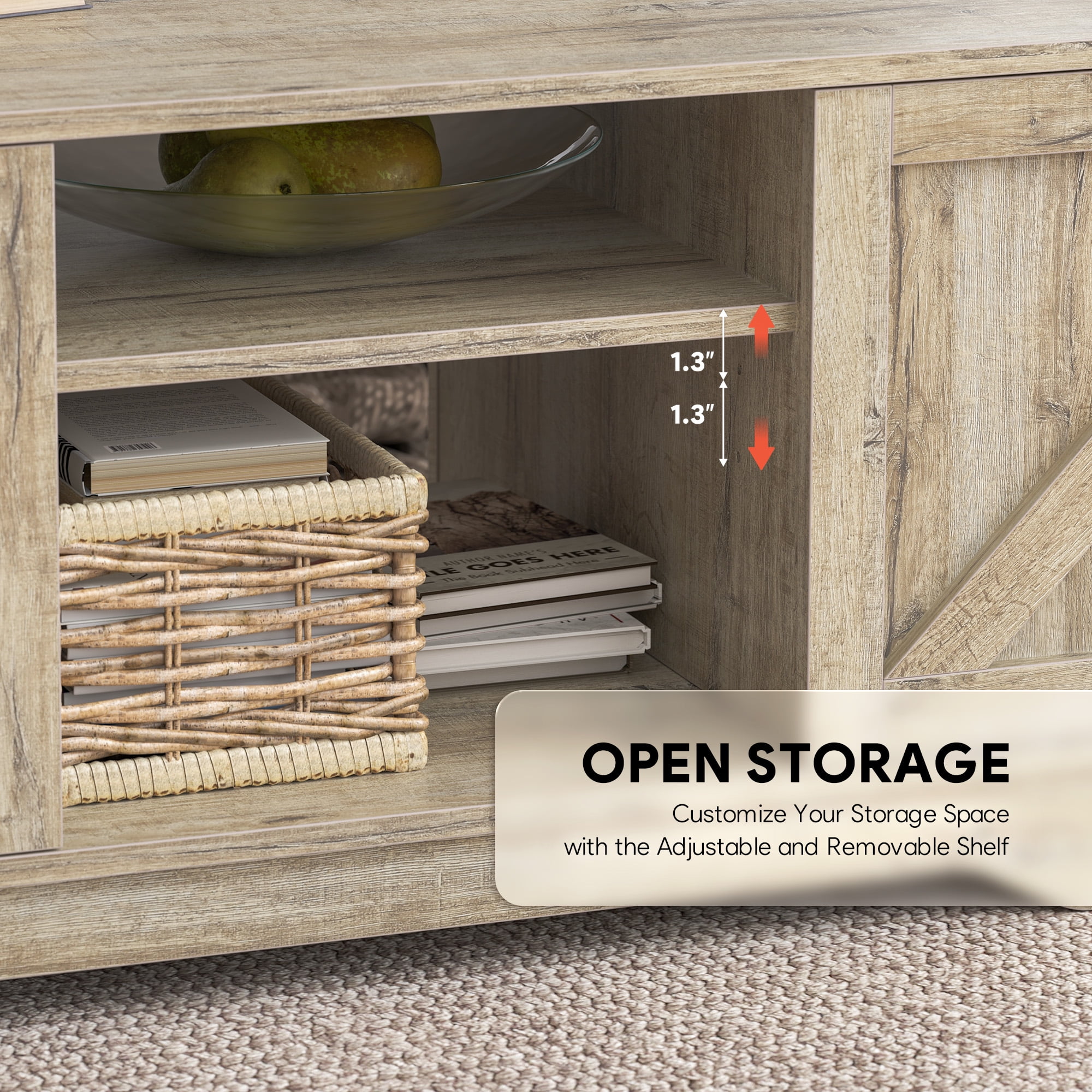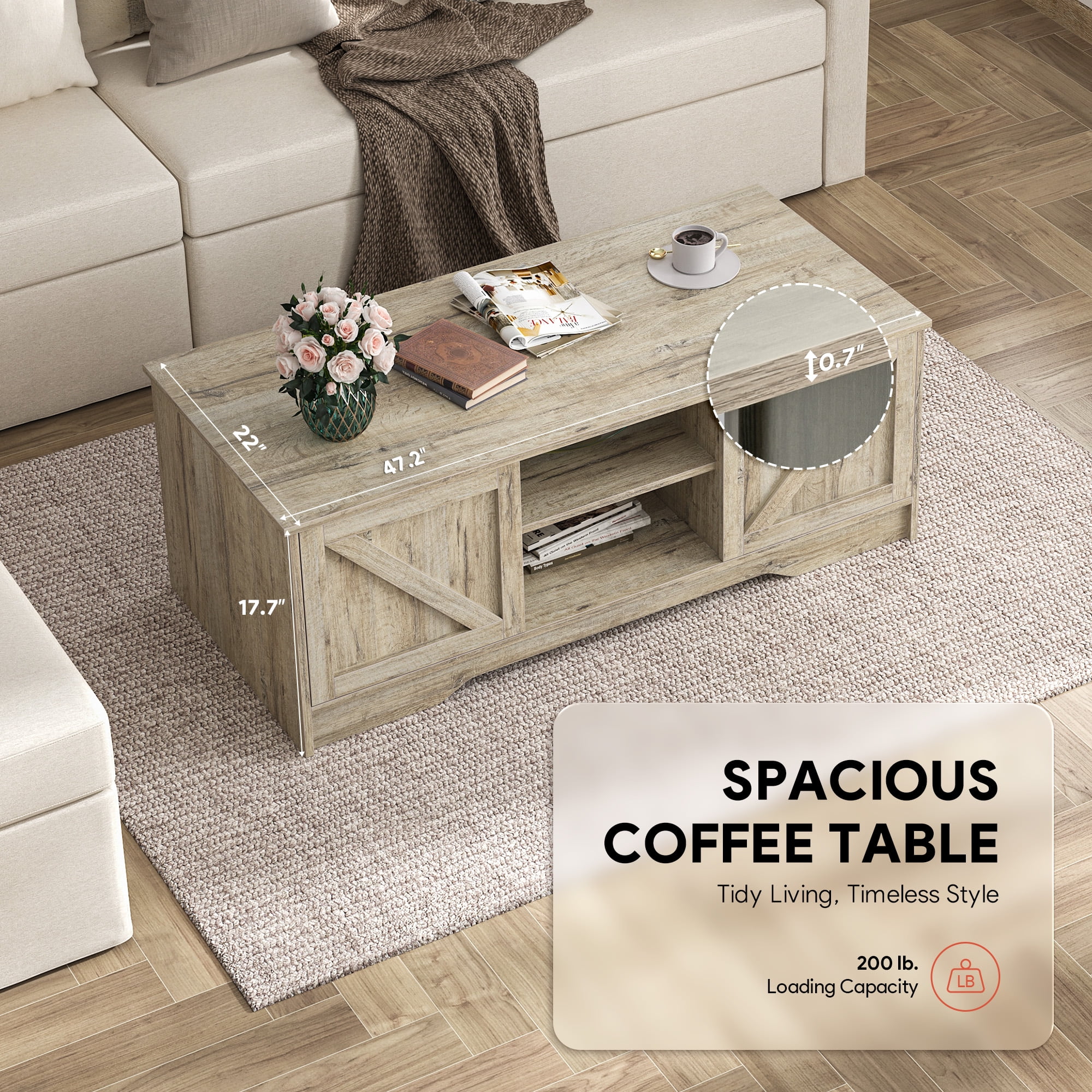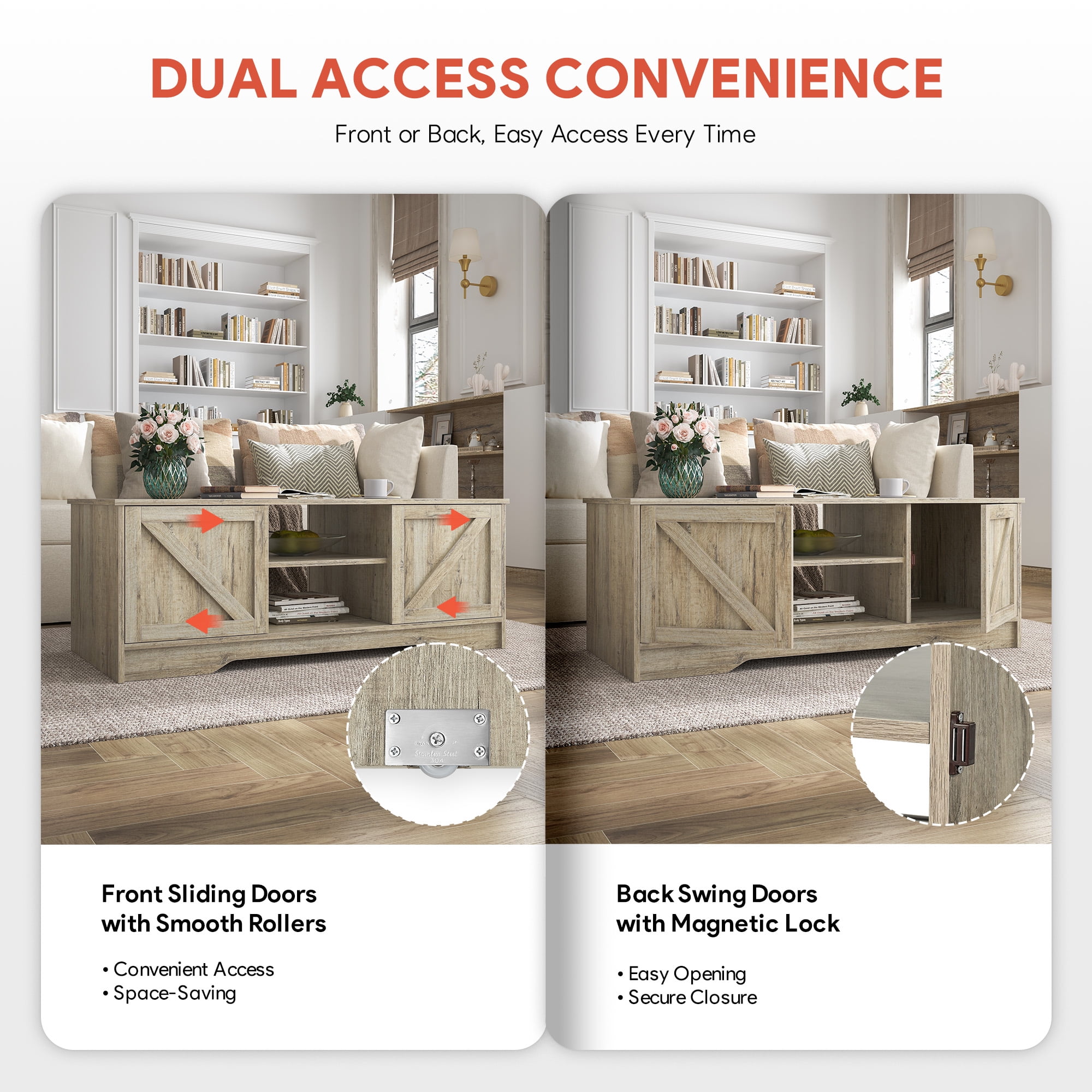 Bestco 47″ Farmhouse Coffee Table with Sliding Doors Rustic Center Table Light Rustic Oak