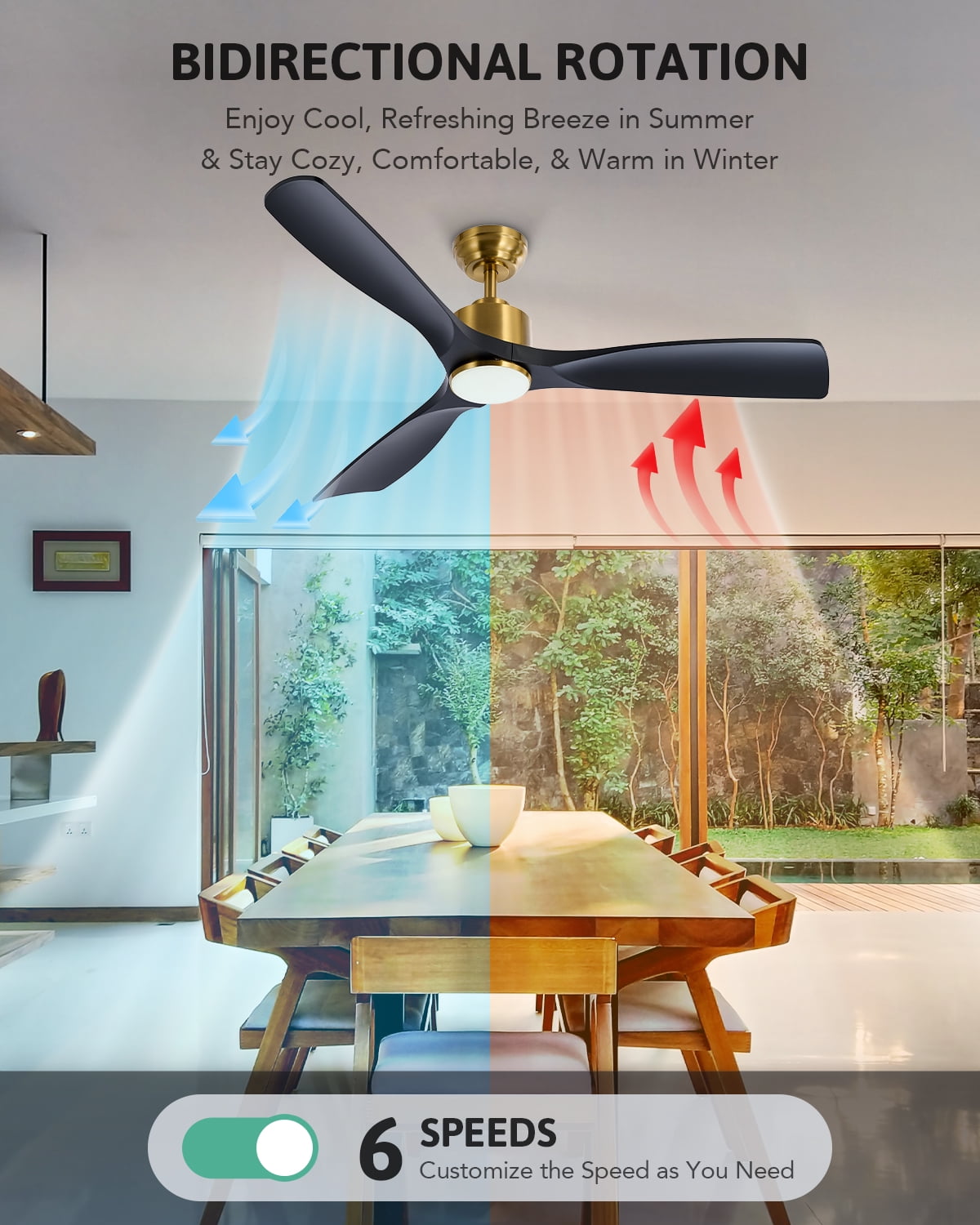 Reversible airflow cools in summer and helps circulate heat in winter Set up auto shutoff times after 1, 4, or 8 hours for optimal energy efficiency Dimmable LED provides customizable lighting with 3 color temperatures