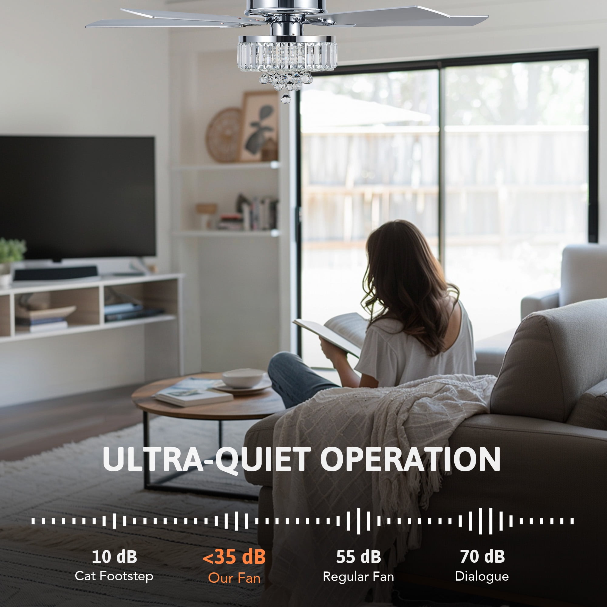 Transform your home with this 52 inch crystal ceiling fan with lights and remote—not only does it provide a refreshing breeze, but it also bathes your space in a luxurious glow. The intricate crystal prisms and beads reflect light beautifully, creating a captivating ambiance that elevates any decor. Powered by a quiet reversible DC motor, the five dual finished blades rotate in either direction to keep your living room, bedroom, or covered patio cool in summer and warm in winter. Its versatile design ensures easy mounting, even on ceilings with a 10° slope. With six fan speeds at your fingertips, you can effortlessly find your perfect comfort level, whether working, reading, or sleeping—all managed conveniently with the included remote control. Claim your fan today and let your home reflect your exquisite taste. Features 【Modern Luxurious Style】: This 52″ crystal ceiling fan combines elegance with practicality, offering both solid air circulation and a luxurious touch. The stunning lights create a captivating ambiance, perfect for living rooms, dining areas, and more 【Custom Comfort】: Our crystal ceiling fan with remote offers 6 fan speeds and 4 timer settings (1/2/4/8 hours) for tailored comfort. Control the fan and light independantly, and easily switch bulbs rated up to 40W in the E12 sockets to match your room’s aesthetic 【Noise-Free & Reversible DC Motor】: This ceiling fan operates with a quiet DC motor that runs at just 35 dB and rotates in both directions to provide cooling airflow in summer and warm airflow in winter 【Smart Memory Function】: Designed for ease of use, our ceiling fan memorizes your favorite settings after operating for at least 10 seconds and automatically returns to those preferences when activated via remote 【Personalized Installation】: Our modern ceiling fan with light comes with 2 downrods (5″ and 10″) to fit high or low ceilings with an incline of up to 10°. The silver and light gray blades allow you to customize your fan’s appearance to suit your decor Specifications Material: Copper, Metal, Aluminum, MDF, Crystal Color: Chrome, Silver, Light Gray Blade Span: 52 in. (132 cm) Overall Height: 21.3-26.3 in. (54-66.7 cm) Blade to Ceiling Distance: 11-16 in. (28-40.7 cm) Canopy Diameter: 6 in. (15 cm) Installation Type: Downrod Downrod Lengths: 5 & 10 in. (12.5 & 25 cm) Maximum Slope Angle: 10° Timer Settings: 1, 2, 4, 8 hr. Fan Speeds: 6 Max. Noise Level: 35 dB Bulb Base: E12 Number of Bulbs: 3 (bulbs not incl.) Max. Wattage: 40W Net Weight: 20.7 lb. (9.4 kg) Package List 5 x Fan Blades 1 x Fan Motor 1 x Mounting Bracket 1 x Canopy 1 x Shade 1 x Light Kit 1 x Receiver 1 x Remote Control 1 x 5″ Downrod 1 x 10″ Downrod 1 x Coupling Cover 1 x Grommet 1 x Crystal Pendant Kit 1 x Hardware Package 1 x Gloves 1 x Instructions