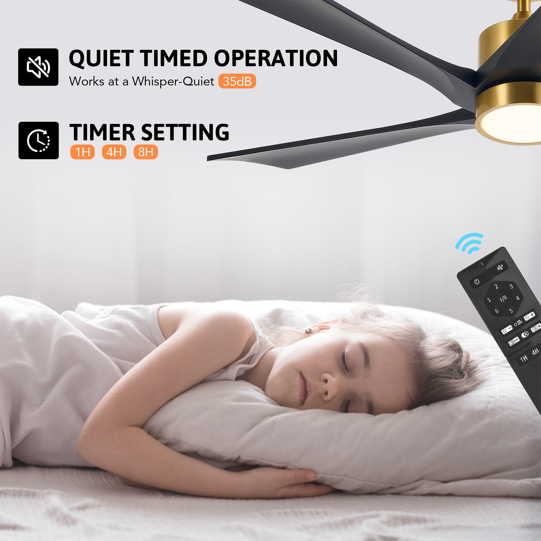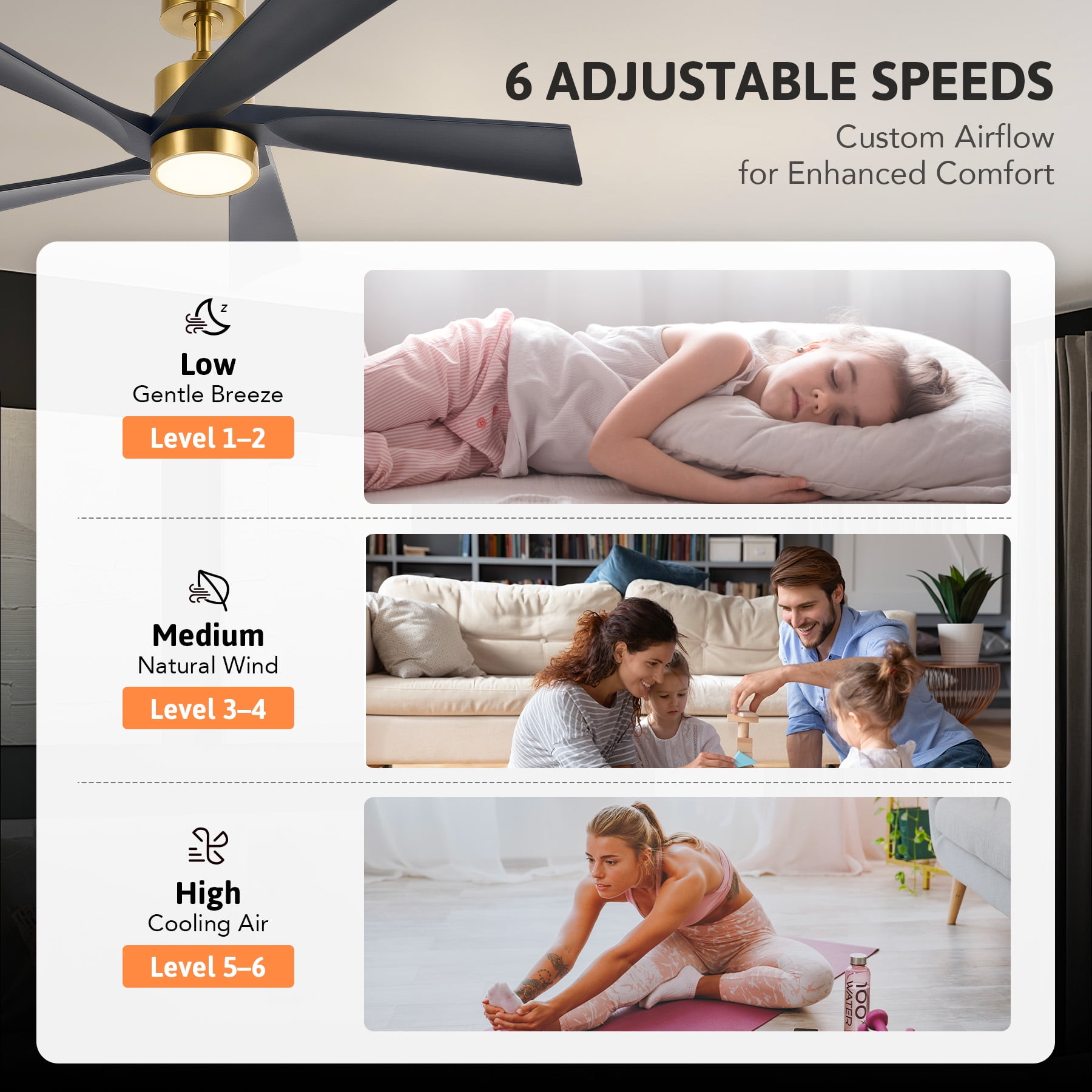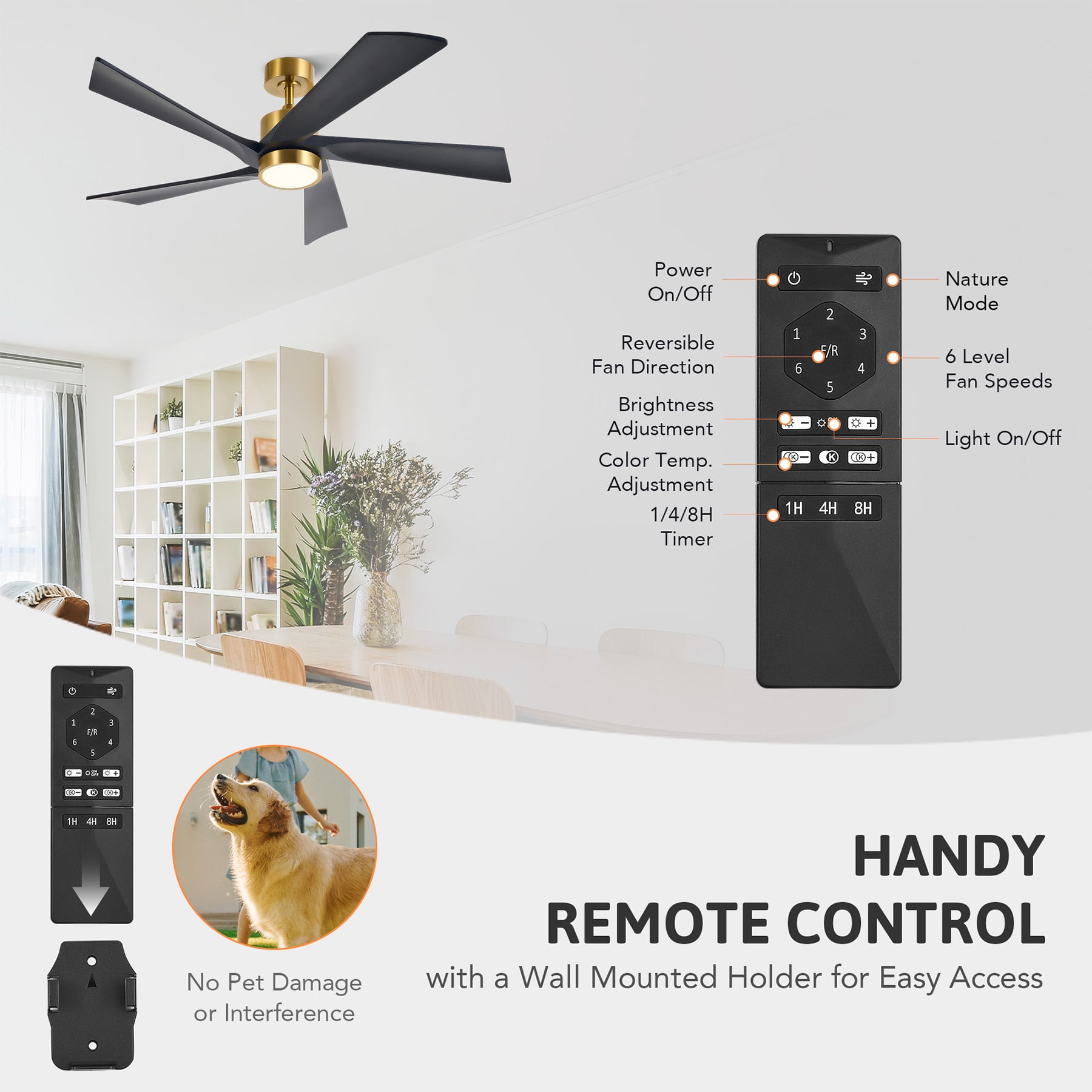 Stay cool in summer and warm in winter thanks to the reversible airflow Tailor your airflow and lighting with 6 fan speeds & 3000K-6500K CCT Safety cable and remote control are included for safe setup and handy use