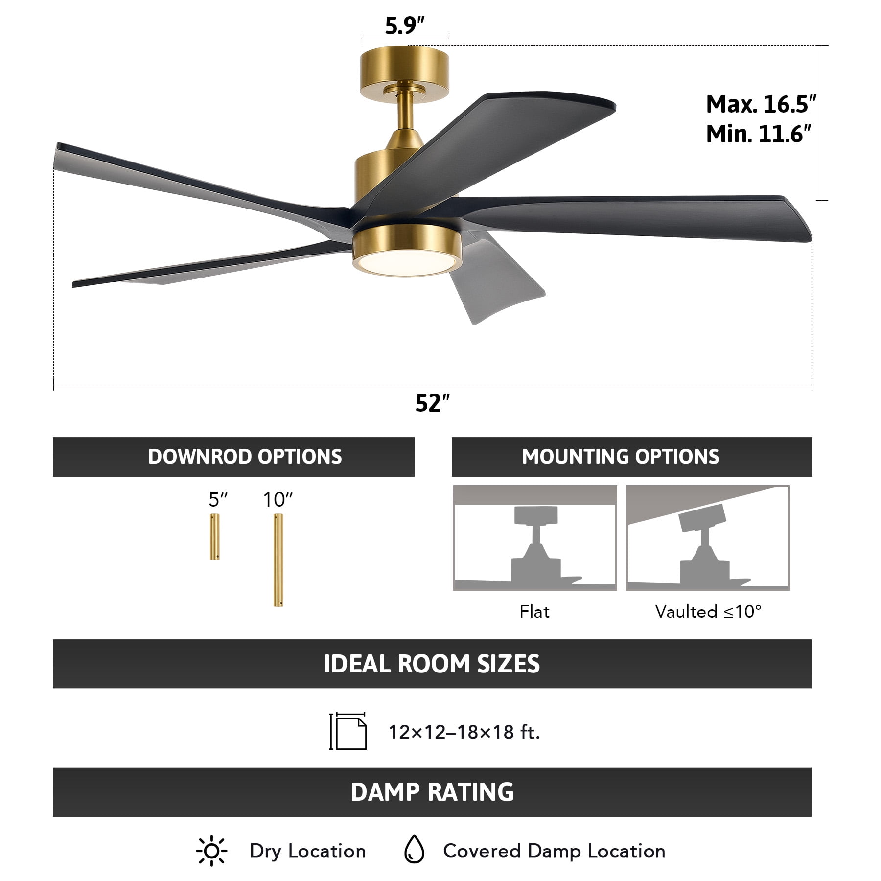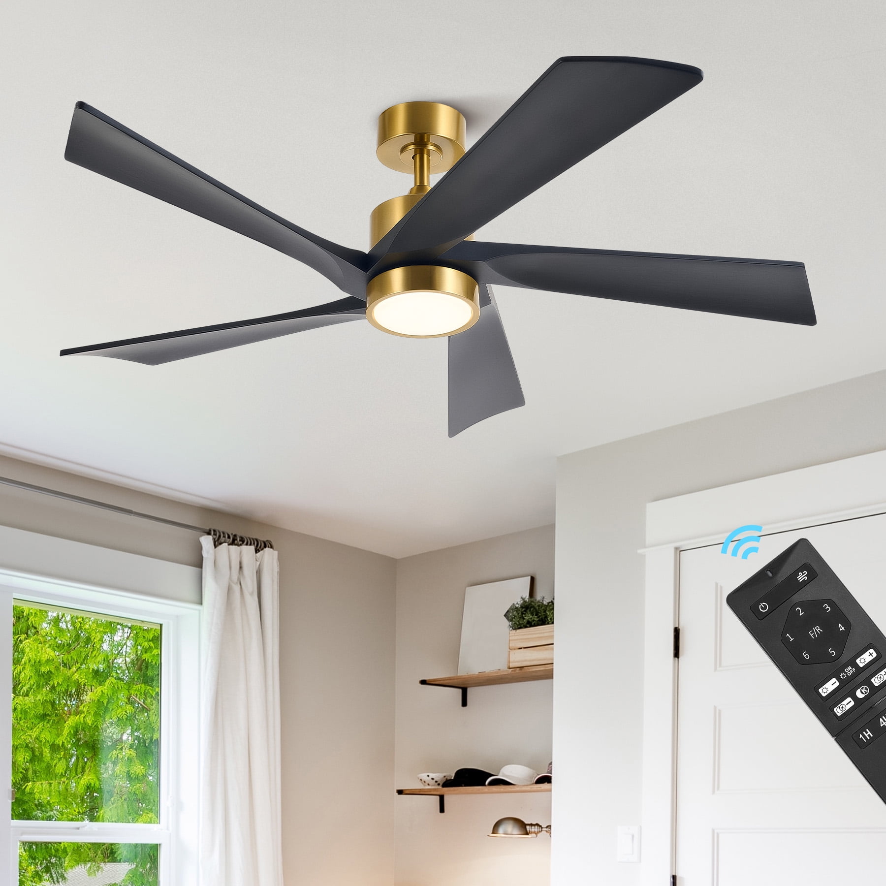 Ceiling Fan with Light: Bestco’s wood modern ceiling fan not only offers comfort but also prioritizes safety with an integrated safety cable. Ideal for various indoor settings including living rooms, bedrooms, offices, kitchens, farmhouses, and more, this highly energy-efficient 52 inch ceiling fan cuts power loss by up to 80% compared to traditional fans. Customize Your Comfort: This ceiling fan with remote allows you to adjust among 6 speeds, 3 timer settings (1/4/8 hr.), and color temperatures from 3000K to 6500K. Enjoy the flexibility of operating the fan and light separately according to your preference. Memory Function: With its memory function, our ceiling fan maintains your preferred settings for an uninterrupted experience. It stores light and fan speed settings after running for at least 10 seconds, and then effortlessly returns to those settings when activated via the remote. Quiet & Reversible DC Motor: This ceiling fan with remote control rotates in reversible directions to facilitate downward airflow in summer and upward airflow in winter, all at a mere 35 dB thanks to its high quality DC motor. Versatile Installation: Our modern ceiling fan with light comes with 5″ and 10″ downrods for different installations. You can also opt for a 10° angled mount using the tutorial video provided. Upgrade your comfort and lower your energy bills with Bestco’s ceiling fan with light. This 52-inch ceiling fan features 5 blades and is perfect for any space, whether it’s your cozy living room or your bustling office. Its adaptable design allows for easy mounting, even on ceilings with a 10° slope. With a CCT adjustable LED light and 6 fan speeds, you’re in control of your atmosphere. Whether you’re working, reading, or relaxing, find your ideal color temperature and fan speed with ease. Plus, manage everything conveniently with the included remote control. This ceiling fan also has a memory function for consistent performance, allowing you to stay cool in the summer and cozy up in the winter. Specifications Material: Copper, Metal, Aluminum, Wood, Acrylic Color: Matte Black Blade Material:Wood Blade Span: 52 in. (132 cm) Overall Height: 14.2-19.1 in. (36-48.5 cm) Blade to Ceiling Distance: 9-14 in. (29.5-42 cm) Canopy Diameter: 5.9 in. (15 cm) Installation Type: Downrod Downrod Lengths: 5 & 10 in. (12.5 & 25 cm) Maximum Slope Angle: 10° Timer Settings: 1, 4, 8 hr. Fan Speeds: 6 Max. Noise Level: 35 dB Integrated LED Wattage: 22W LED Color Temperature: 3000K to 6500K Net Weight: 13 lb. (5.9 kg) Package List 5x Fan Blades 1x Fan Motor 1x Mounting Bracket 1x Canopy 1x Shade 1x LED Light Kit 1x Receiver 1x Remote Control 1x 5″ Downrod 1x 10″ Downrod 1x Coupling Cover 1x Grommet 1x Safety Cable 1x Hardware Package 1x Instructions