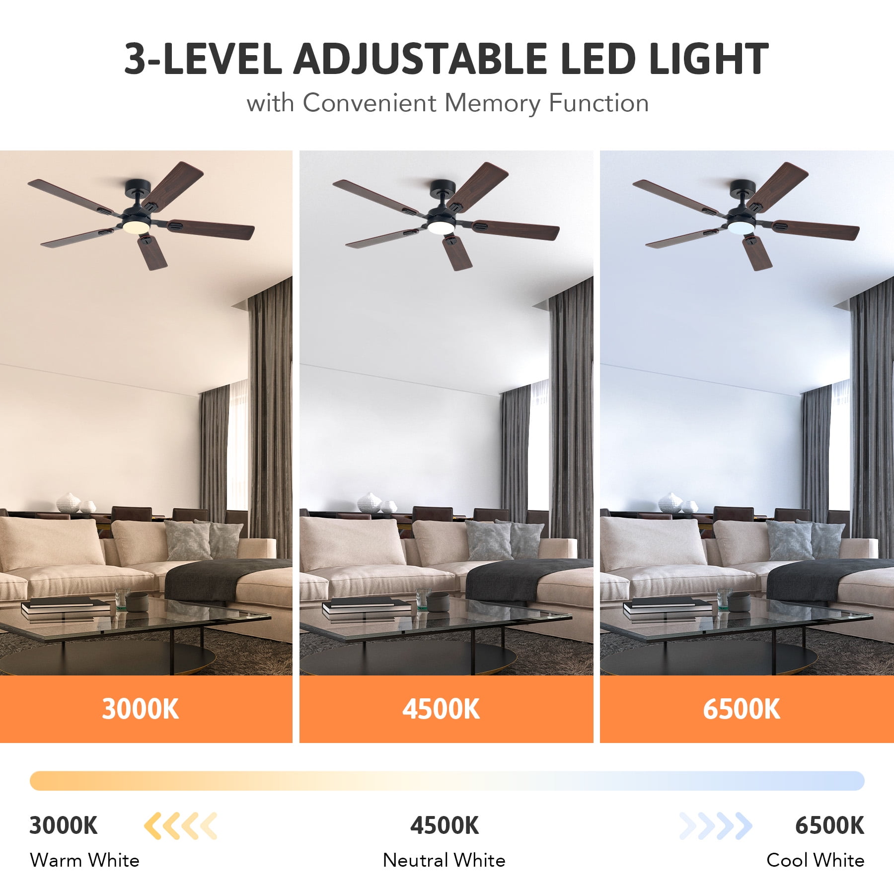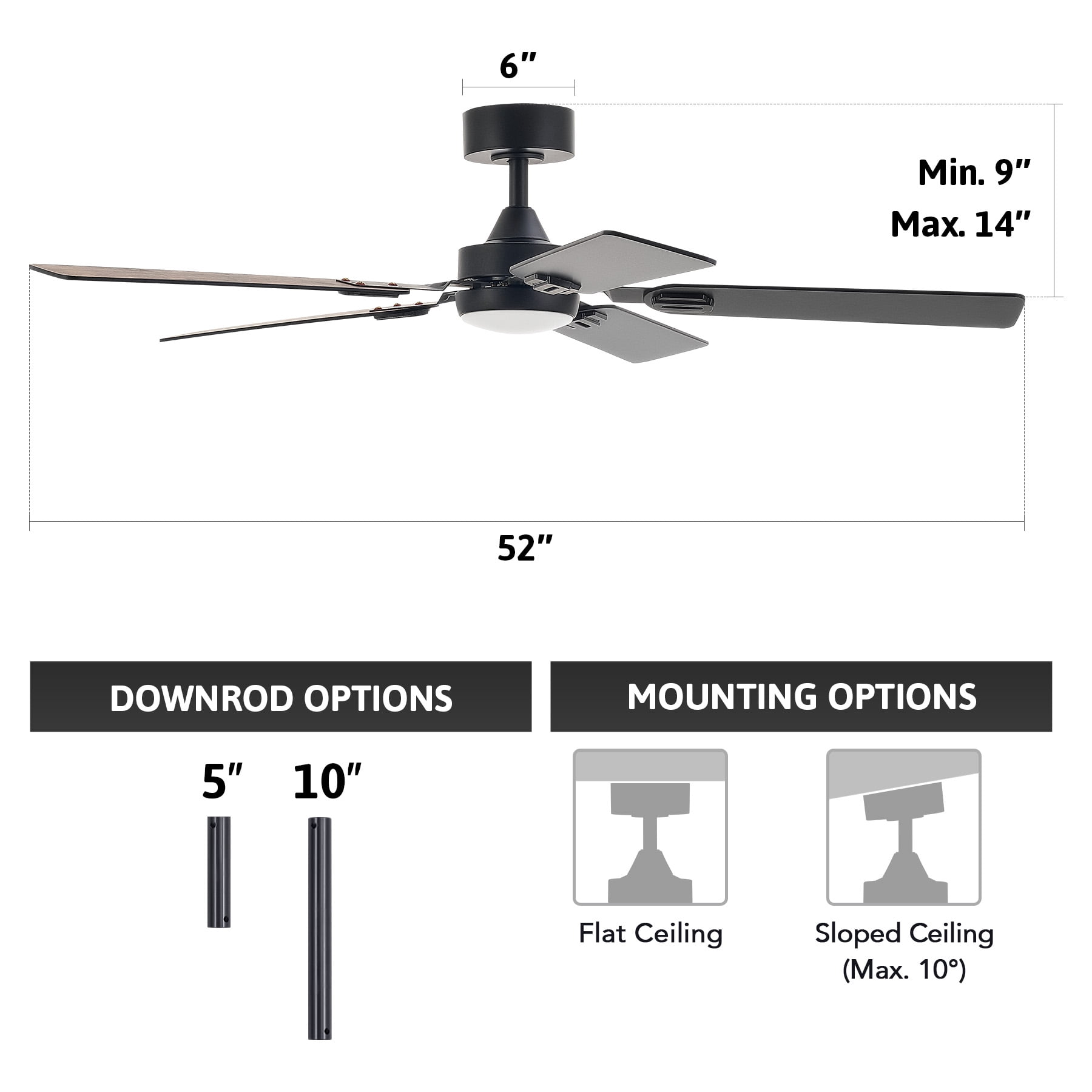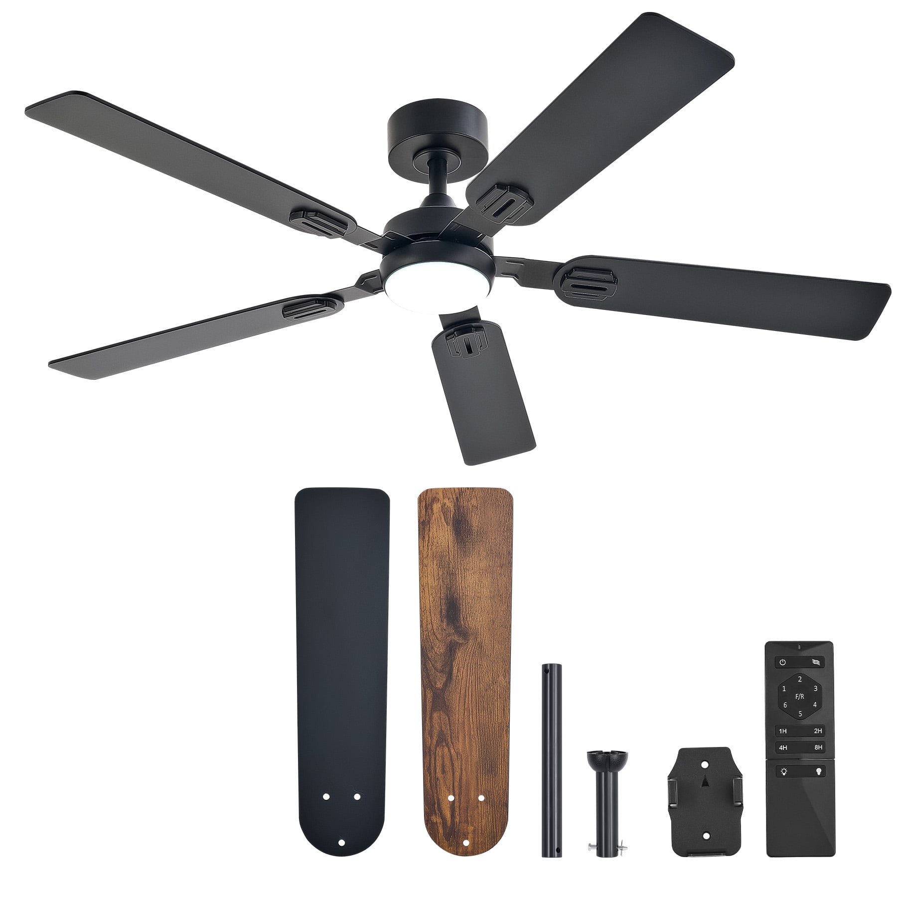 Upgrade your comfort and lower your energy bills with Bestco’s Ceiling Fan with Light. This 52-inch ceiling fan features 5 blades and is perfect for any space, whether it’s your cozy living room or your bustling office. Its adaptable design allows for easy mounting, even on ceilings with a 10° slope. With a 3 level adjustable LED light and 6 fan speeds, you’re in control of your atmosphere. Whether you’re working, reading, or relaxing, find your ideal brightness and fan speed with ease. Plus, manage everything conveniently with the included remote control. This ceiling fan also has a memory function for consistent performance, allowing you to stay cool in the summer and cozy up in the winter. Features 【Ceiling Fan with Light】: Bestco’s modern ceiling fan not only offers comfort but also prioritizes safety with an integrated safety cable. Ideal for various indoor settings including living rooms, bedrooms, offices, kitchens, farmhouses, and more, this energy-efficient 52 inch ceiling fan cuts power loss by up to 80% compared to traditional fans. 【Customize Your Comfort】: This ceiling fan with remote allows you to adjust among 6 speeds, 4 timer settings (1/2/4/8 hr.), and 3 color temperatures (3000K/4500K/6500K). Enjoy the flexibility of operating the fan and light separately according to your preference. 【Memory Function】: With its memory function, our ceiling fan maintains your preferred settings for an uninterrupted experience. It stores light and fan speed settings after running for at least 10 seconds, and then effortlessly returns to those settings when activated via the remote. 【Quiet & Reversible DC Motor】: This ceiling fan with remote control rotates in reversible directions to facilitate downward airflow in summer and upward airflow in winter, all at a mere 35 dB thanks to its quality DC motor. 【Versatile Installation】: Our modern ceiling fan with light comes with 2 downrods (5″and 10″) to fit high or low ceilings with an incline of up to 10°. The black and rustic brown blades allow you to customize your fan’s appearance to complement your decor. Specifications Material: Copper, Metal, Aluminum, MDF, Acrylic Color: Matte Black, Rustic Brown Blade Span: 52 in. (132 cm) Overall Height: 11.85-16.85 in. (30.1-42.8 cm) Blade to Ceiling Distance: 9-14 in. (23.1-35.8 cm) Canopy Diameter: 5.9 in. (15 cm) Installation Type: Downrod Downrod Lengths: 5 & 10 in. (12.5 & 25 cm) Maximum Slope Angle: 10° Timer Settings: 1, 2, 4, 8 hr. Fan Speeds: 6 Max. Noise Level: 35 dB Integrated LED Wattage: 20W LED Color Temperature: 3000K/4500K/6500K Applicable Room Size: 269 sq. ft. (25 m2) Net Weight: 12.8 lb. (5.8 kg) Package List 5 x Fan Blades 1 x Fan Motor 1 x Mounting Bracket 1 x Canopy 1 x Shade 1 x LED Light Kit 1 x Receiver 1 x Remote Control 1 x 5 in Downrod 1 x 10 in Downrod 1 x Coupling Cover 1 x Grommet 1 x Safety Cable 1 x Hardware Package 1 x Instructions