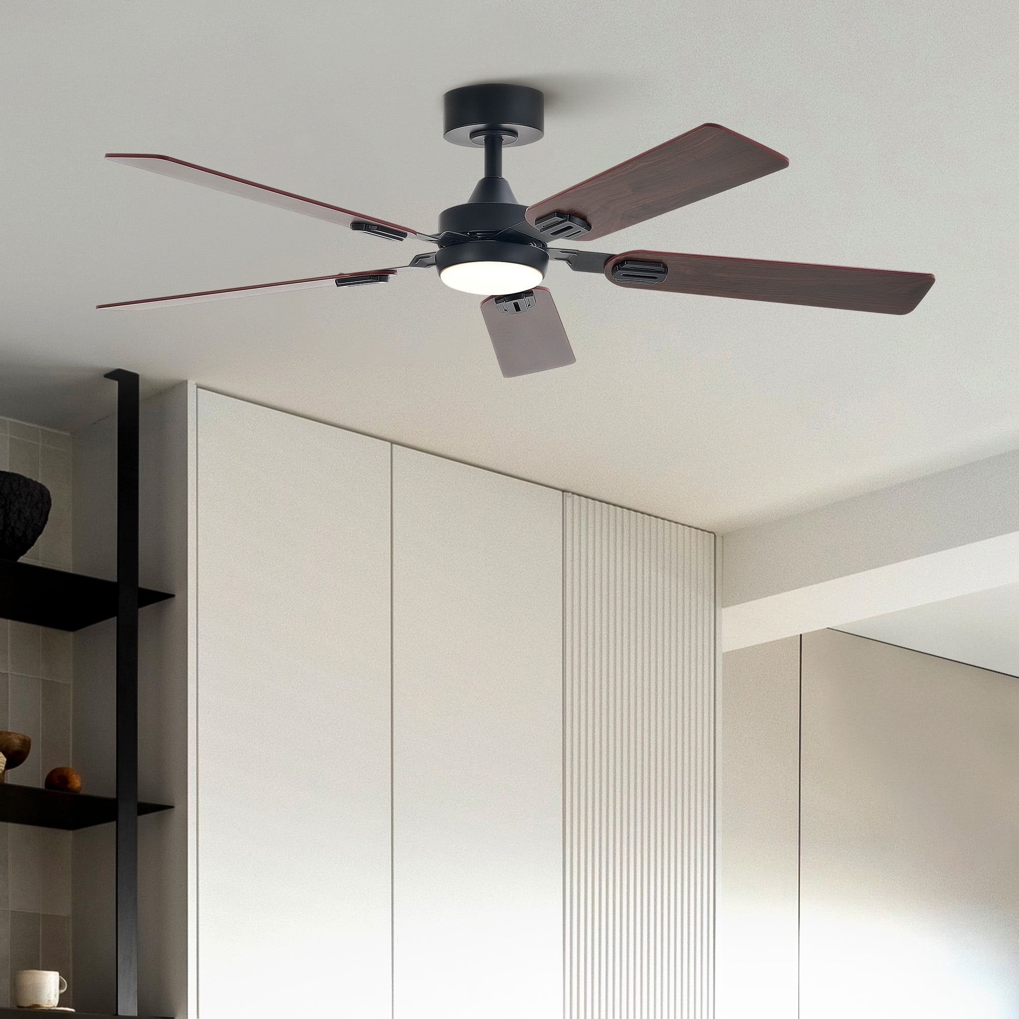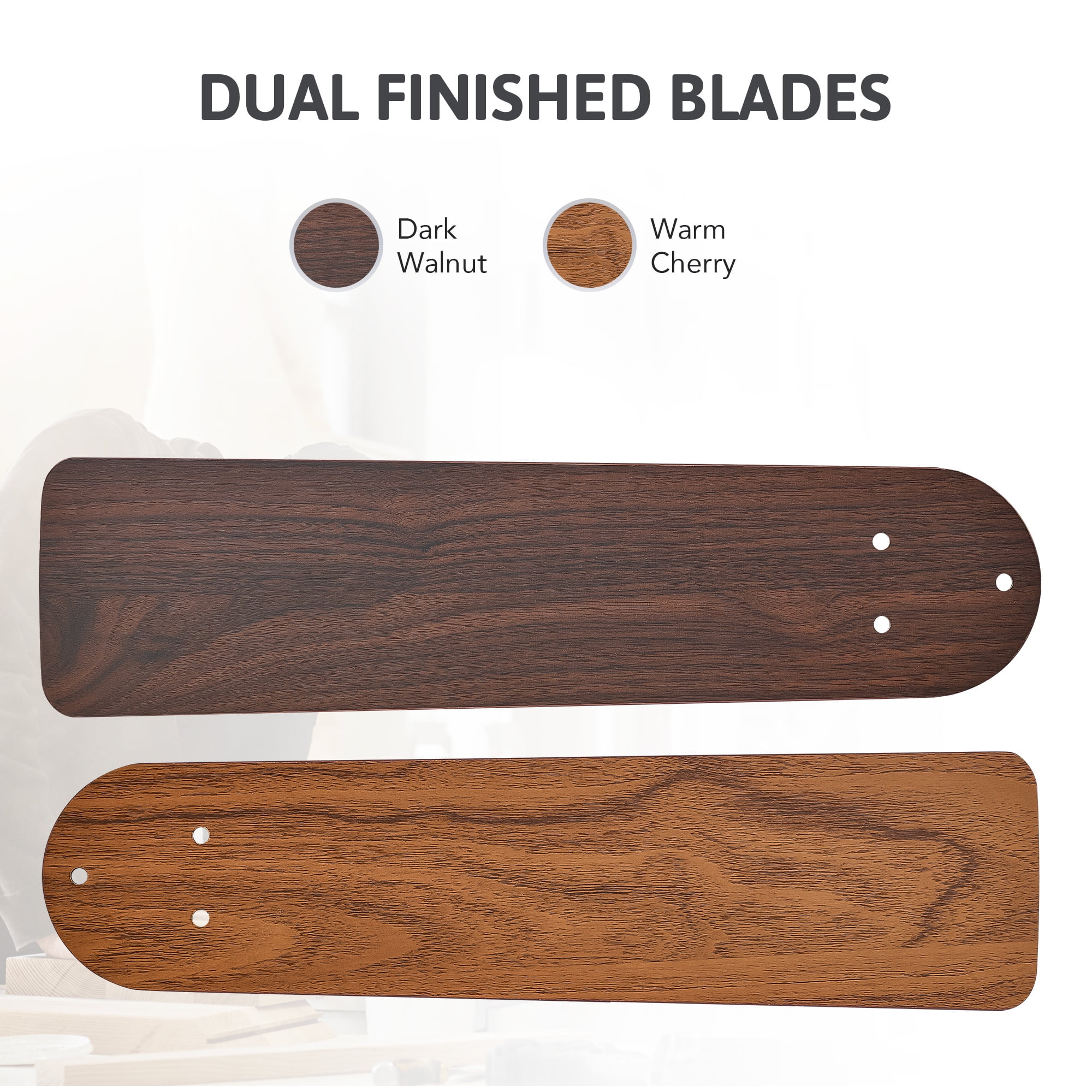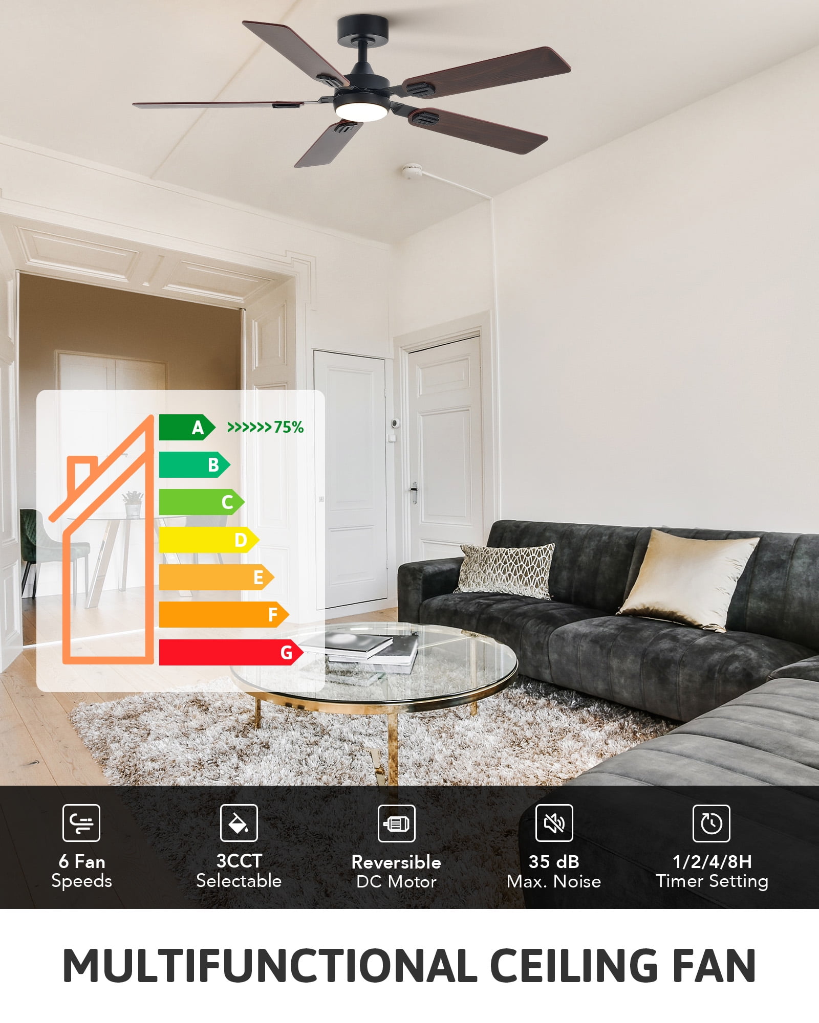Upgrade your comfort and lower your energy bills with Bestco’s Ceiling Fan with Light. This 52-inch ceiling fan features 5 blades and is perfect for any space, whether it’s your cozy living room or your bustling office. Its adaptable design allows for easy mounting, even on ceilings with a 10° slope. With a 3 level adjustable LED light and 6 fan speeds, you’re in control of your atmosphere. Whether you’re working, reading, or relaxing, find your ideal brightness and fan speed with ease. Plus, manage everything conveniently with the included remote control. This ceiling fan also has a memory function for consistent performance, allowing you to stay cool in the summer and cozy up in the winter. Features 【Ceiling Fan with Light】: Bestco’s modern ceiling fan not only offers comfort but also prioritizes safety with an integrated safety cable. Ideal for various indoor settings including living rooms, bedrooms, offices, kitchens, farmhouses, and more, this energy-efficient 52 inch ceiling fan cuts power loss by up to 80% compared to traditional fans. 【Customize Your Comfort】: This ceiling fan with remote allows you to adjust among 6 speeds, 4 timer settings (1/2/4/8 hr.), and 3 color temperatures (3000K/4500K/6500K). Enjoy the flexibility of operating the fan and light separately according to your preference. 【Memory Function】: With its memory function, our ceiling fan maintains your preferred settings for an uninterrupted experience. It stores light and fan speed settings after running for at least 10 seconds, and then effortlessly returns to those settings when activated via the remote. 【Quiet & Reversible DC Motor】: This ceiling fan with remote control rotates in reversible directions to facilitate downward airflow in summer and upward airflow in winter, all at a mere 35 dB thanks to its quality DC motor. 【Versatile Installation】: Our modern ceiling fan with light comes with 2 downrods (5″and 10″) to fit high or low ceilings with an incline of up to 10°. The black and rustic brown blades allow you to customize your fan’s appearance to complement your decor. Specifications Material: Copper, Metal, Aluminum, MDF, Acrylic Color: Walnut, Cherry Blade Span: 52 in. (132 cm) Overall Height: 11.85-16.85 in. (30.1-42.8 cm) Blade to Ceiling Distance: 9-14 in. (23.1-35.8 cm) Canopy Diameter: 5.9 in. (15 cm) Installation Type: Downrod Downrod Lengths: 5 & 10 in. (12.5 & 25 cm) Maximum Slope Angle: 10° Timer Settings: 1, 2, 4, 8 hr. Fan Speeds: 6 Max. Noise Level: 35 dB Integrated LED Wattage: 20W LED Color Temperature: 3000K/4500K/6500K Applicable Room Size: 269 sq. ft. (25 m2) Net Weight: 12.8 lb. (5.8 kg) Package List 5 x Fan Blades 1 x Fan Motor 1 x Mounting Bracket 1 x Canopy 1 x Shade 1 x LED Light Kit 1 x Receiver 1 x Remote Control 1 x 5 in Downrod 1 x 10 in Downrod 1 x Coupling Cover 1 x Grommet 1 x Safety Cable 1 x Hardware Package 1 x Instructions