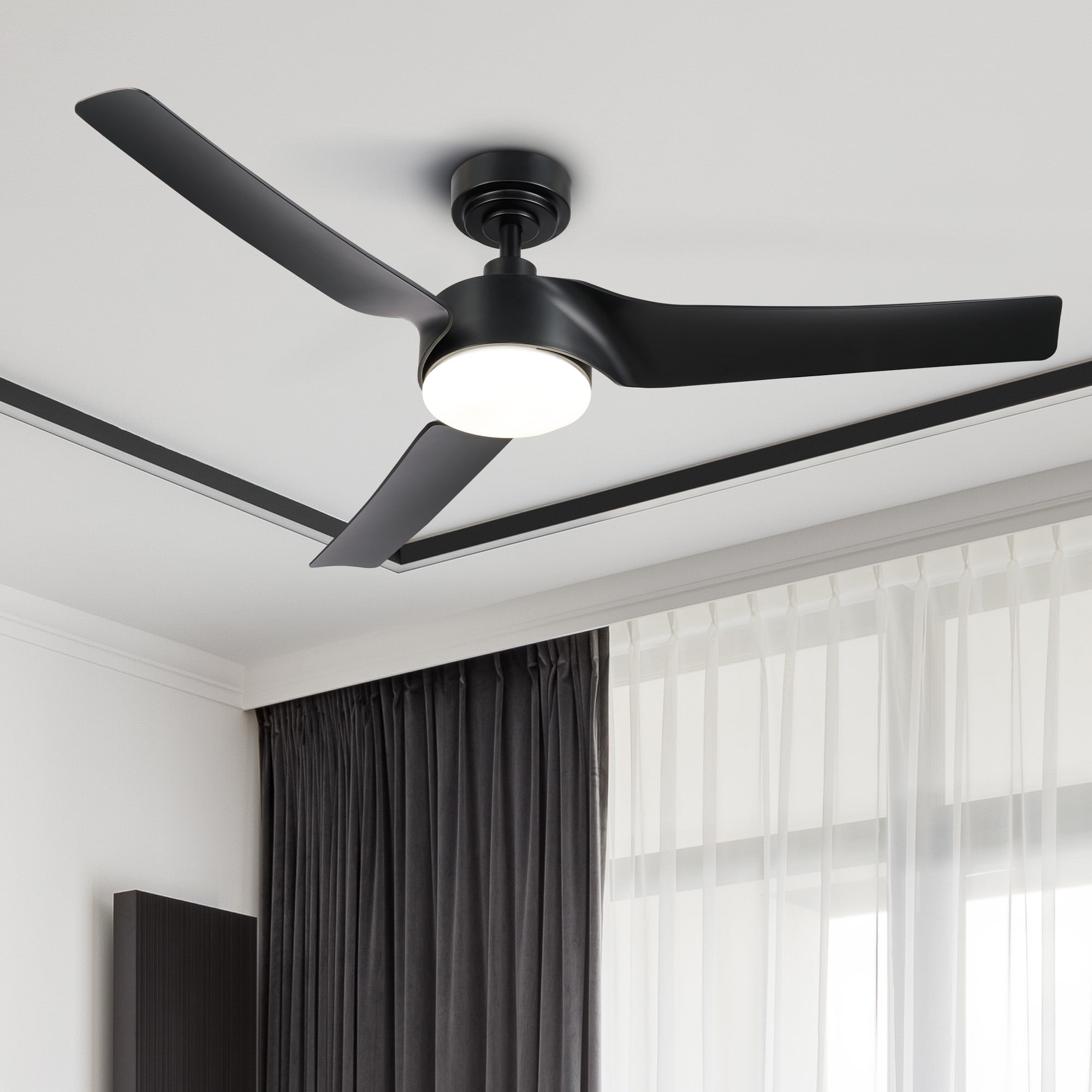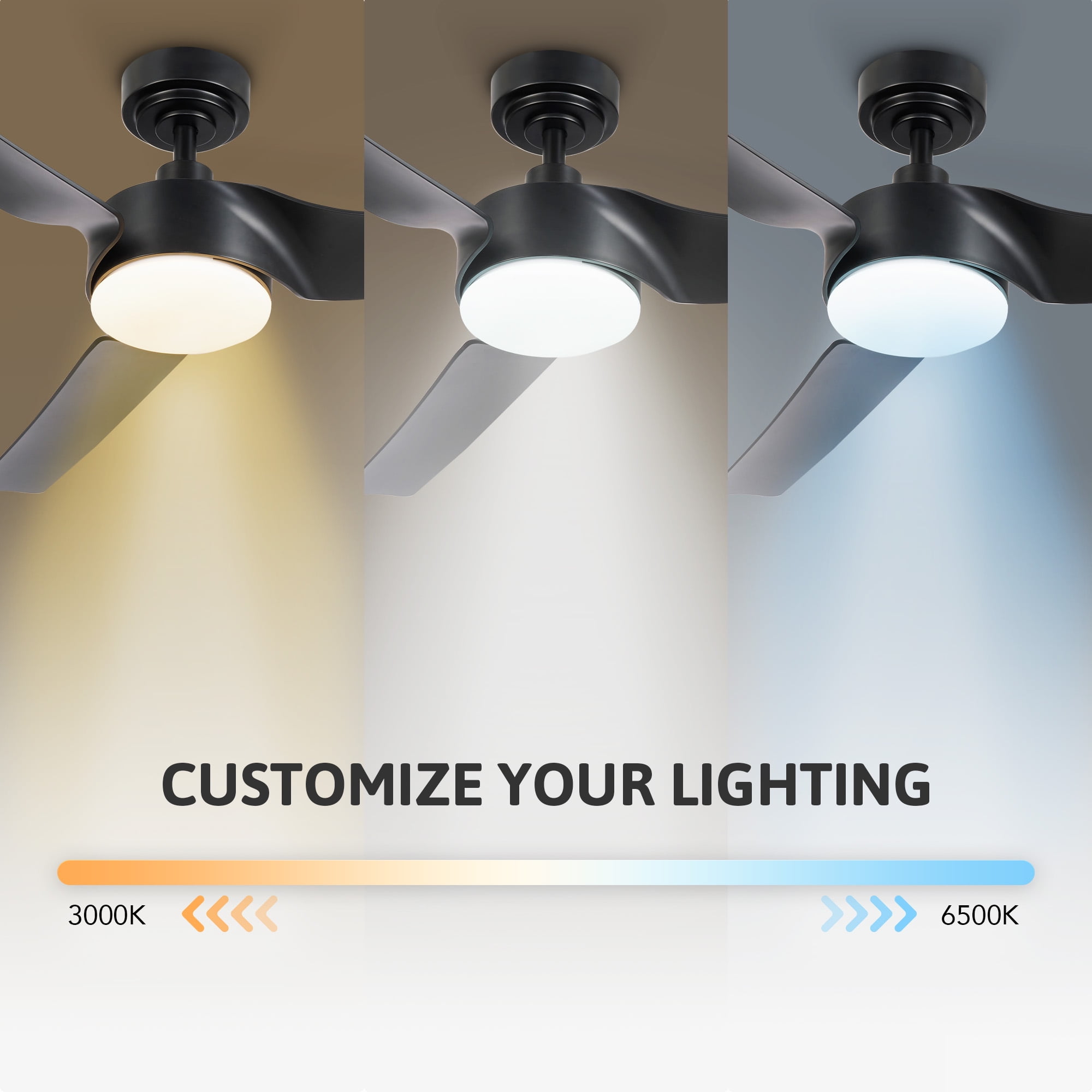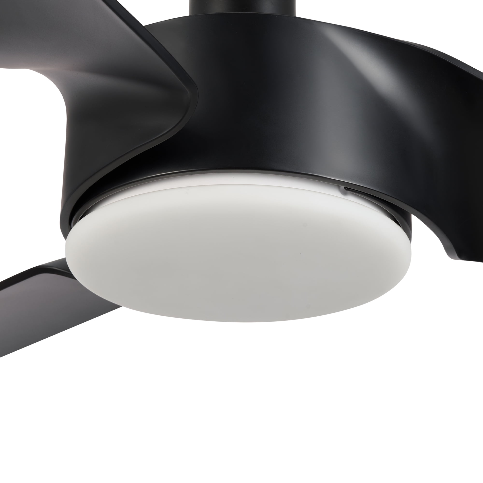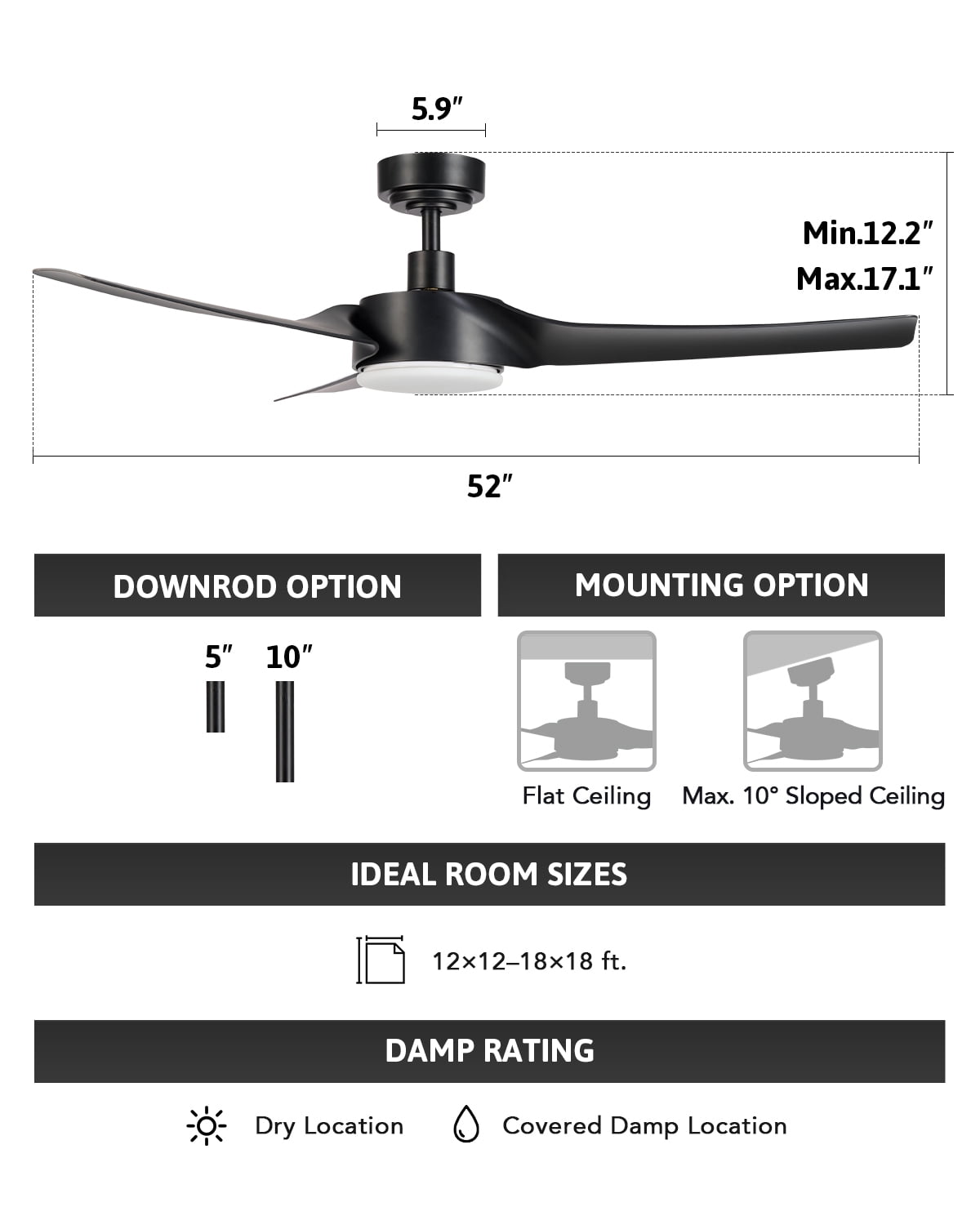 Description Stay cool and connected! Our smart ceiling fan with light marries stylish design with advanced technology to let you effortlessly adjust it with a single tap on the provided remote, your phone app, or via Alexa or Google voice commands. This 52″” semi flush mount modern fandelier with 3 propeller shaped blades in matte black finish compliments any room decor from industrial farmhouse to contemporary minimalist, adding a sophisticated touch to your bedroom, living room, covered patio, and any other spaces. The dimmable light kit with built-in memory function provides adjustable color temperatures and brightness, perfect for work, reading, or entertainment. The quiet reversible DC motor offers 6 fan speeds and 4 preset modes for year round comfort. Features 【MART CEILING FAN】: Our smart ceiling fan with light and remote is compatible with smartphone app control, Alexa and Google voice control, and remote control for effortless adjustments from anywhere anytime 【YEAR ROUND COMFORT】: The powerful and whisper quiet DC motor is reversible to provide a cool breeze in summer and better warmth distribution in winter; the 6 speeds and 4 preset modes offer the custom comfort, while the 1, 4, & 8 hour timer keeps energy bills low without sacrificing convenience 【INFINITE LIGHTING】: The dimmable 23W LED light kit features independent and stepless adjustments over 3000 to 6500K color temperature and 1 to 100% brightness, offering endless lighting possibilities at your fingertips; the memory function saves and recalls your favorite settings with ease 【VERSATILE STYLE】: This 52″” semi flush mount modern fandelier and lighting fixture with 3 propeller-shaped ABS blades in a matte black finish compliments any home decor, elevating your bedroom, living room, kitchen, covered porch, patio, and other spaces 【EASY INSTALLATION】: The durable canopy and 5 and 10 inch downrods firmly hold flat or sloped ceilings high or low; and once your wiring is ready, our clear instructions guide you through a simple setup Specifications Material: Metal, ABS, Glass Finish: Matte Black Overall Diameter: 52 in. (132 cm) Overall Heights: 12.2, 17.1 in. (31, 43.5 cm) Ceiling to Blade Heights: 11.4, 16.3 in. (29, 41.5 cm) Shade Diameter: 7.9 in. (20 cm) Canopy Dimensions: 5.9 x 2.6 in. (15×6.5 cm) Downrod Diameter: 1.1 in. (2.7 cm) Downrod Heights: 5, 10 in. (12.7, 25.4 cm) Blades: 3 Fan Rotation: Clockwise & Counterclockwise Fan Speeds: 6 Preset Fan Modes: Natural, Fresh, Sleep, Smart Max. Airflow: 4074 cfm Timer Settings: 1/4/8 hr. LED Light Output: 5-23W Color Temperature: 3000-6500K Brightness: 1-100% Recommend Room Size: 12×12-18×18 ft. (3.6×3.6-5.5×5.5 m) Max. Slope: 10° Net Weight: 12.1 lb. (5.5 kg) Package List 1 x Smart Ceiling Fan with Light 2 x Downrods 1 x Remote Control 1 x Instructions