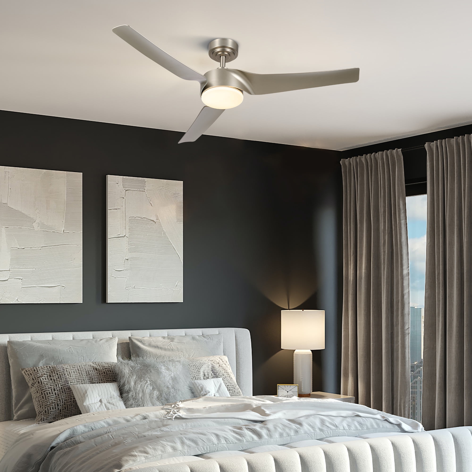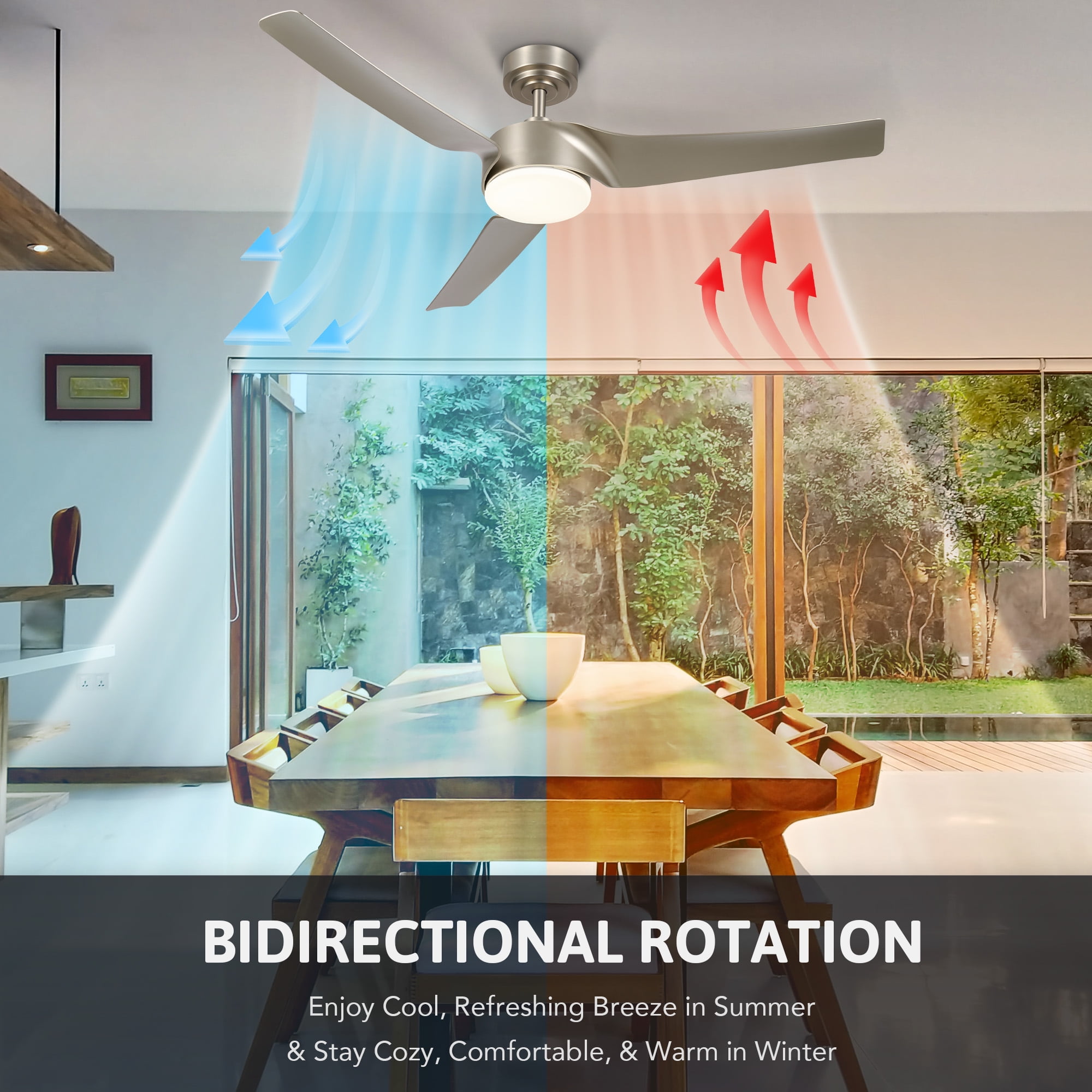 Stay cool and connected! This state-of-the-art smart ceiling fan marries stylish design with advanced technology to cater to all your home cooling and lighting needs. With compatibility for smartphone app control, Alexa and Google voice control, as well as a handy remote control, you can effortlessly adjust this lighting and ceiling fan fixture kit with a single tap on your device or via voice commands once the WIFI or Bluetooth gets connected to your phone. This 52″” semi flush mount modern fandelier with 3 propeller shaped blades in nickel finish compliments any room decor from industrial farmhouse to contemporary minimalist, adding a sophisticated touch to your bedroom, living room, covered patio, and any other spaces. The quiet reversible DC motor offers 6 fan speeds and 4 preset modes for year round comfort, while the 1, 4, 8 hour timer ensures energy efficient use. The 23W dimmable LED light kit boasts independent and stepless adjustments over a wide range of color temperatures (3000K-6500K) and brightness levels (1-100%) for custom lighting. Our indoor ceiling fan comes with 5″” and 10″” downrods to fit flat or sloped ceilings high or low. Order this smart ceiling fan with light and remote today and start enjoying the ultimate combination of style and technology! Features 【SMART CEILING FAN】: This smart ceiling fan with light and remote is compatible with smartphone app control, Alexa and Google voice control, and remote control for effortless adjustments from anywhere anytime. 【YEAR ROUND COMFORT】: The powerful and whisper quiet DC motor is reversible to provide a cool breeze in summer and better warmth distribution in winter; the 6 speeds and 4 preset modes offer the custom comfort, while the 1, 4, & 8 hour timer keeps energy bills low without sacrificing convenience. 【INFINITE LIGHTING】: The dimmable 23W LED light kit features independent and stepless adjustments over 3000 to 6500K color temperature and 1 to 100% brightness, offering endless lighting possibilities at your fingertips; the memory function saves and recalls your favorite settings with ease. 【VERSATILE STYLE】: This 52″” semi flush mount modern fandelier and lighting fixture with 3 propeller-shaped ABS blades in a nickel finish compliments any home decor, elevating your bedroom, living room, kitchen, covered porch, patio, and other spaces. 【EASY INSTALLATION】: The durable canopy and 5 and 10 inch downrods firmly hold flat or sloped ceilings high or low; and once your wiring is ready, our clear instructions guide you through a simple setup. Specification Material: Metal, ABS, Glass Finish: Nickel Overall Diameter: 52 in. (132 cm) Overall Heights: 12.2, 17.1 in. (31, 43.5 cm) Ceiling to Blade Heights: 11.4, 16.3 in. (29, 41.5 cm) Shade Diameter: 7.9 in. (20 cm) Canopy Dimensions: 5.9 x 2.6 in. (15×6.5 cm) Downrod Diameter: 1.1 in. (2.7 cm) Downrod Heights: 5, 10 in. (12.7, 25.4 cm) Blades: 3 Fan Rotation: Clockwise & Counterclockwise Fan Speeds: 6 Preset Fan Modes: Natural, Fresh, Sleep, Smart Max. Airflow: 4074 cfm Timer Settings: 1/4/8 hr. LED Light Output: 5-23W Color Temperature: 3000-6500K Brightness: 1-100% Recommend. Room Size: 12×12-18×18 ft. (3.6×3.6-5.5×5.5 m) Max. Slope: 10° Net Weight: 12.1 lb. (5.5 kg) Package List 1 x Smart Ceiling Fan with Light 2 x Downrods 1 x Remote Control 1 x Instructions