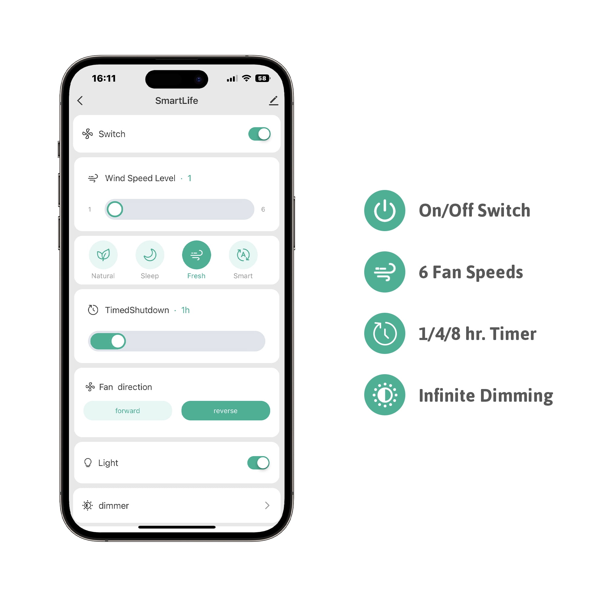 Adjust this smart ceiling fan on your app or via Alexa or Google voice commands Experience infinite lighting thanks to the dimmable light with built-in memory Toggle among the 6 fan speeds and 4 preset modes for maximum comfort Save on energy bills with the timer’s automatic power-off after 1, 4, or 8 hours Enjoy abundant air circulation with whisper quiet operation of the reversible motor
