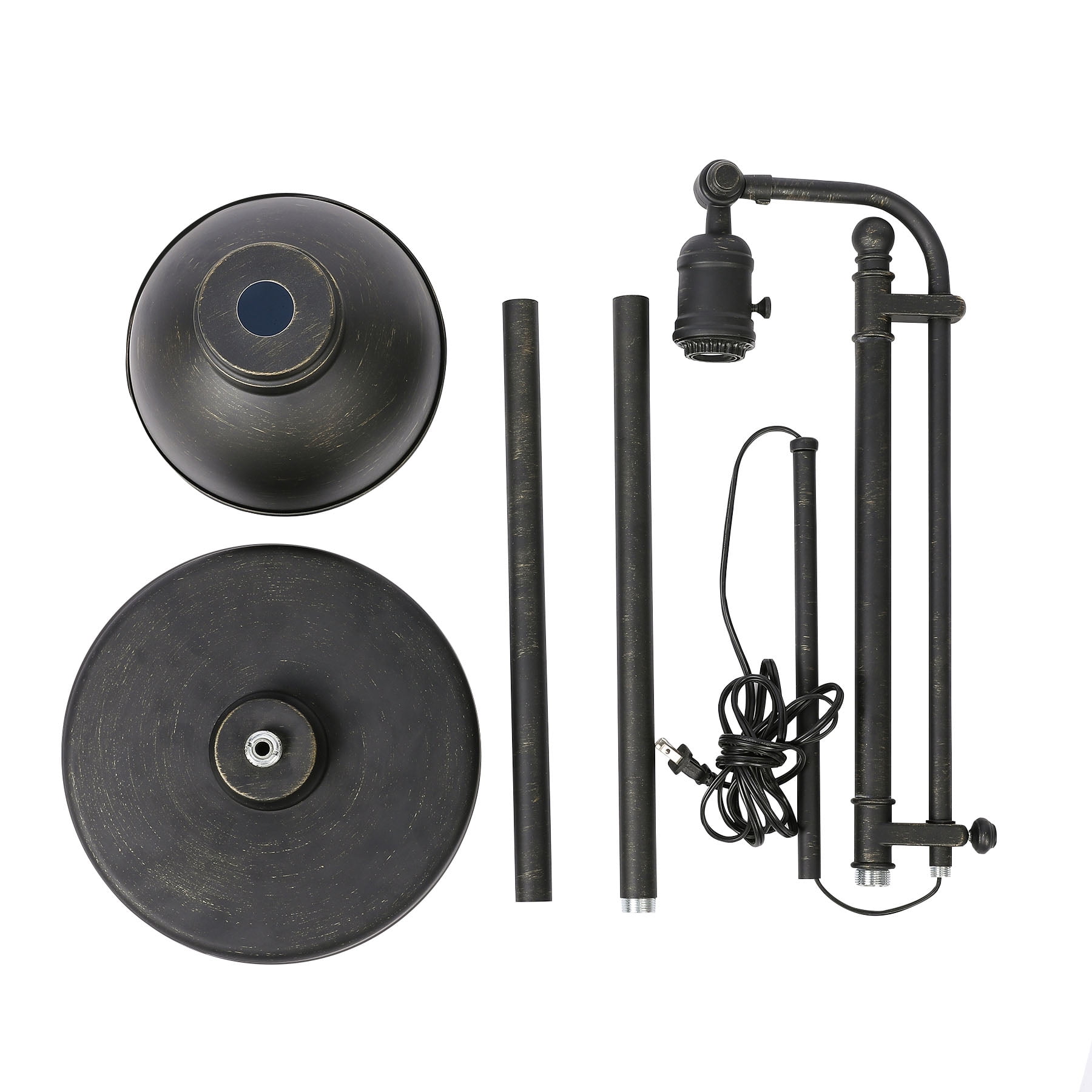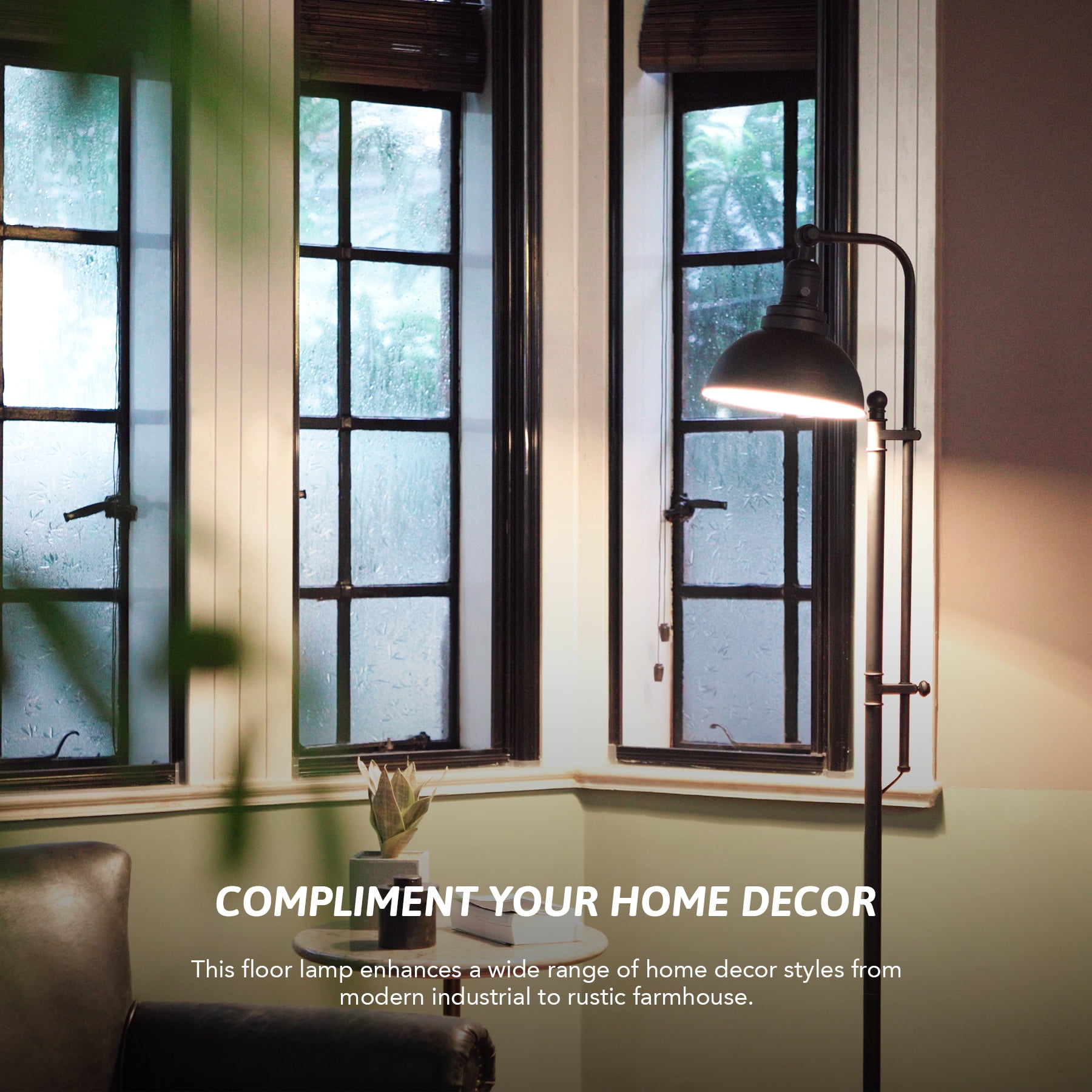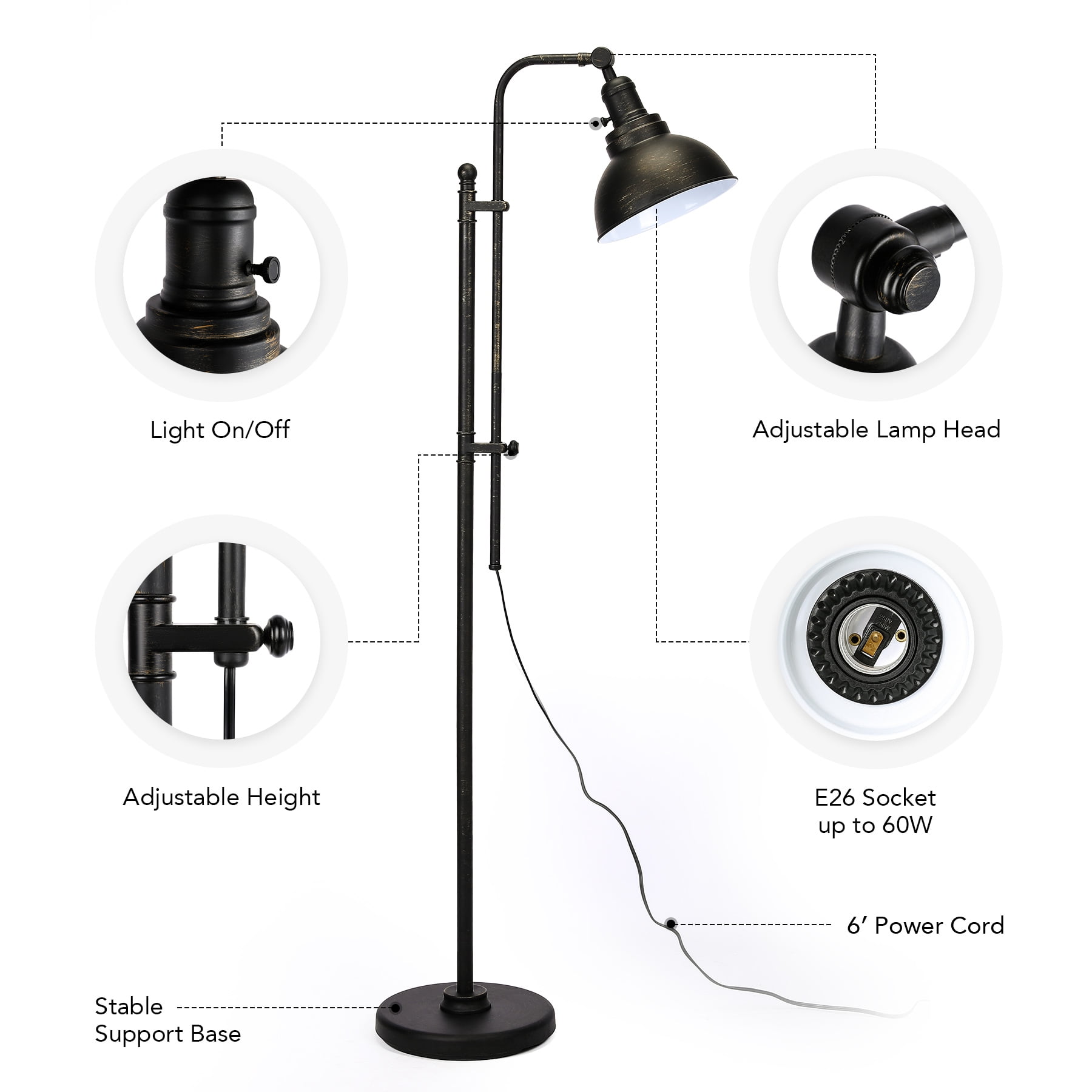 Light up your space with our floor lamp that effortlessly blends vintage charm with modern sophistication. Crafted from durable metal and finished in sleek nickel, this lamp is a standout piece that enhances any room. Enjoy exceptional versatility with its adjustable height from 54” to 65”. Perfectly fit it beside your sofa, in your reading nook, or wherever you need stylish lighting. The 180-degree adjustable head lets you set the ideal ambiance, whether you want a warm glow for relaxation or a focused beam for reading. Every detail, from the lamp shade to the base, is designed to enhance its vintage vibe. Get yours today! Features 【Timeless Vintage Charm】: Our floor lamp combines metal shades with a nickel finish, adding a touch of sophistication that enhances any interior, from chic modern to classic traditional 【Customizable Height】: Adjust the height of this metal floor lamp from 54” to 65” to perfectly fit any space, whether it’s next to your sofa, bed, or in a cozy reading nook 【Standard E26 Base】: Our floor lamp features an E26 base that supports any incandescent, LED, or CFL bulb up to 60W (bulbs not included). Plus, the 5.7 ft. power cable offers extra reach for placing your lamp 【Glow Anywhere】: With its 180-degree lamp head, this floor lamp casts a warm inviting glow or directs a focused beam, ideal for creating the perfect atmosphere in bedrooms, living rooms, and more 【Illuminate with Confidence】: Crafted from sturdy metal with a corrosion-resistant finish, our 65-inch standing lamp is designed to bring lasting brightness and enhance your living experience for years to come Specifications Material: Metal Color: Black Bulb Sockets: E26 Maximum Wattage: 60W Overall Height Range: 54-65 in. (137-165 cm) Base Dimensions: 11 x 3 in. (28×7.5 cm) Shade Dimensions: 9 x 5 in. (23×12.7 cm) Net Weight: 14 lb. (6.35 kg) Package List 1x Floor Lamp 1x Accessory Kit 1x Instructions