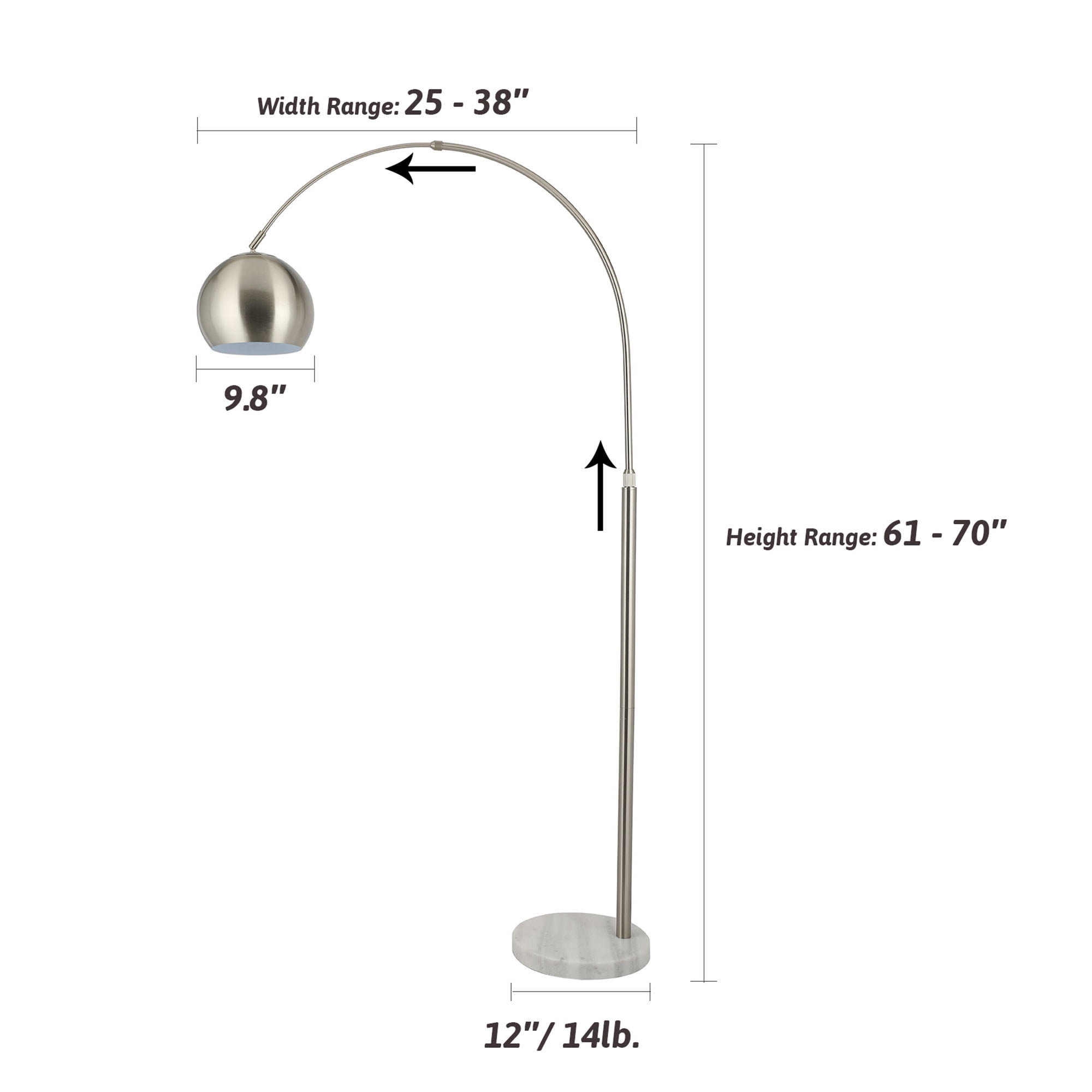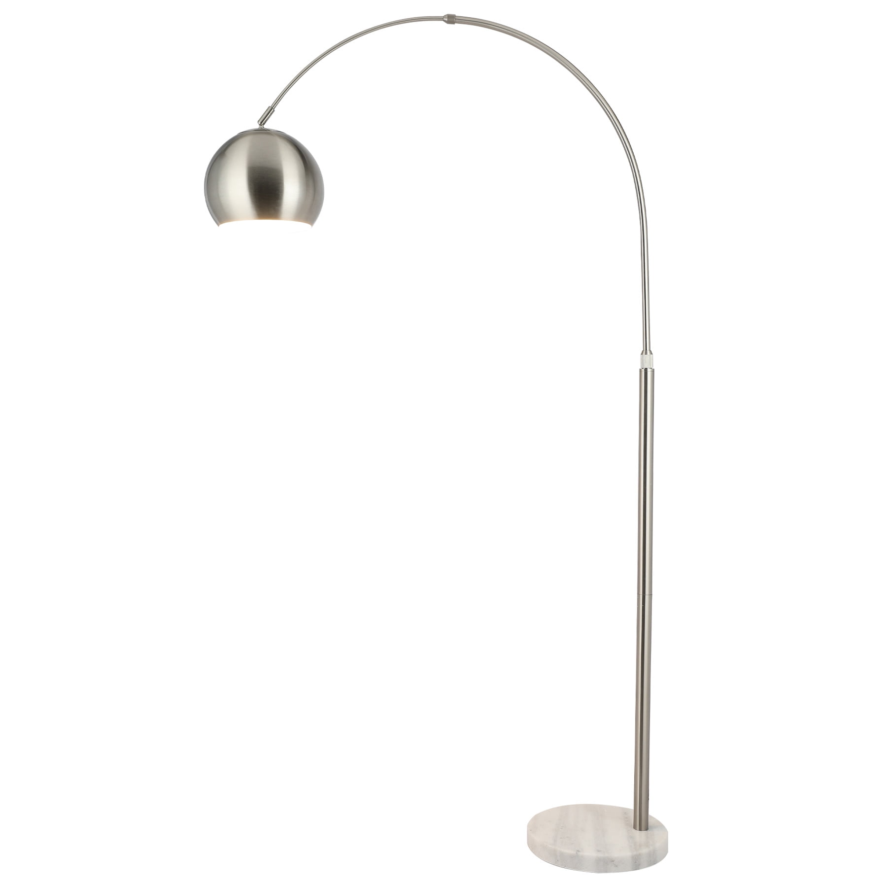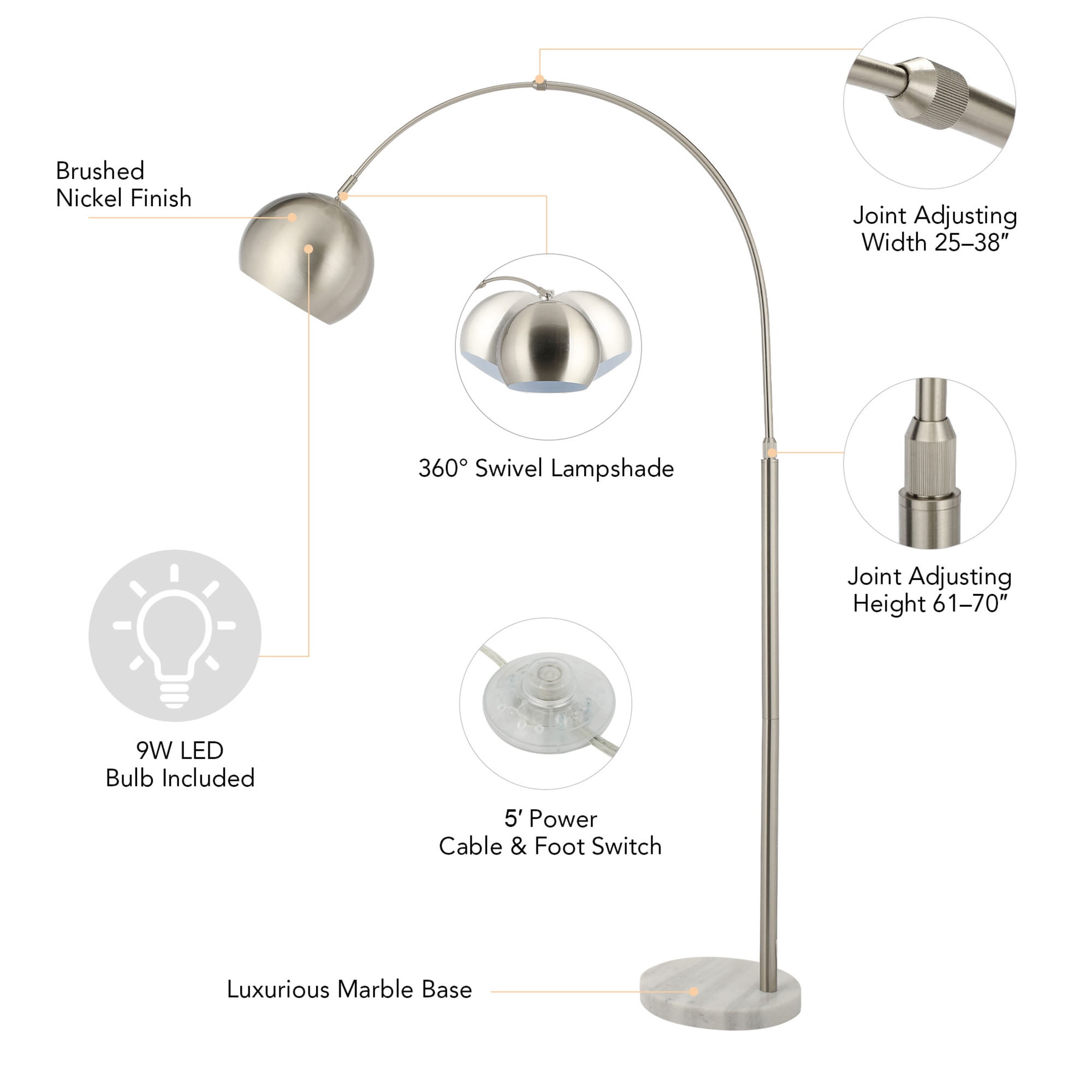 SOPHISTICATED CONTEMPORARY LAMP: The transitional combination of the brushed nickel finish with the classic marble base allows this floor lamp to pair its modern elegance with nearly any home decor STURDY MARBLE BASE: The authentic marble base weighs 19 pounds to support this slender arching lamp while occupying only a 1-foot circle of floor space, letting you fit this helpful room light into nearly any corner of your bedroom, living room, or office HIGHLY ADJUSTABLE: Our tall floor lamp can be easily adjusted from 61-70 inches in height and its hanging lamp shade can be adjusted up to 40 inches from the base, extending this flattering light wherever needed from your desk to bedside to over your favorite armchair COMPLEMENTARY LIGHT: An LED bulb comes included for over 20,000 hours of pleasing light; its 3000K color temperature and 800-lumen brightness make this curved standing lamp perfect for reading or entertaining SATISFACTION GUARANTEED: Order knowing that Bestco usual strong warranty and friendly 24/7 customer service ensure you’ll enjoy this graceful floor lamp for years to come! Description: Our sophisticated contemporary standing lamp stands 5’10” at full height and adds elegance to nearly any home or office decor from mid-century to minimalist to farmhouse thanks to its transitional melding of clean modern lines in brushed nickel with its sturdy and classic marble base. The 5-foot cord and small floorprint of the weighted 19-pound base allow this modern floor lamp to fit into nearly any corner of your bedroom, living room, or home office while the graceful and adjustable arcing shaft and rotatable lamp shade provide up to 100W of illumination wherever you need it. Unique and fashionable, this desk or bedside lamp is also eminently practical with its standard E26 socket and handy footswitch. Perfect for work or entertaining, the airy aesthetic of this slender room lamp is the accent light you’ve been looking for! Specifications: Materials: Metal, Marble Finish: Brushed Nickel Base: 11.8 x 1.4 in. (30×3.5 cm) Height: 61-70 in. (155-178 cm) Max. Shade Diameter: 9.8 in. (25 cm) Power Cord: 5 ft. Socket: E26 Max. Wattage: 100W Switch: Foot Net Weight: 19.1 lb. (8.66 kg) Certificate: ETL Package Includes 1 x Floor Lamp 1 x 9W LED Light Bulb 1 x User Manual