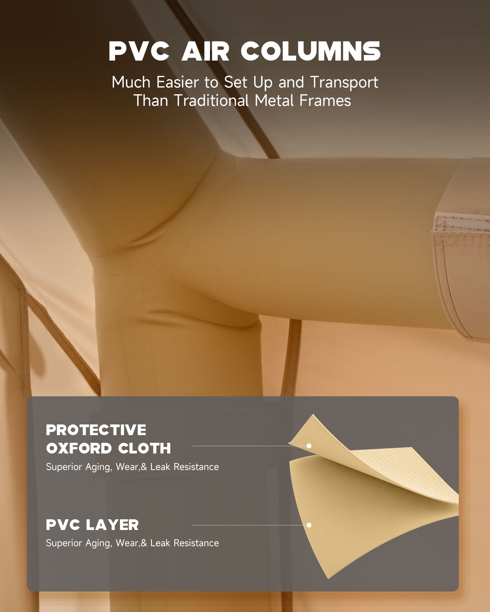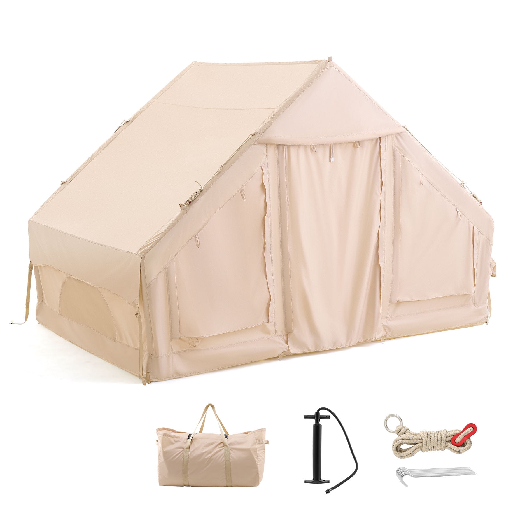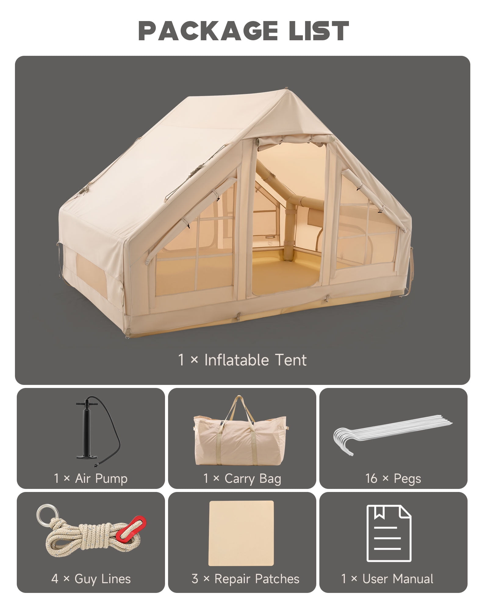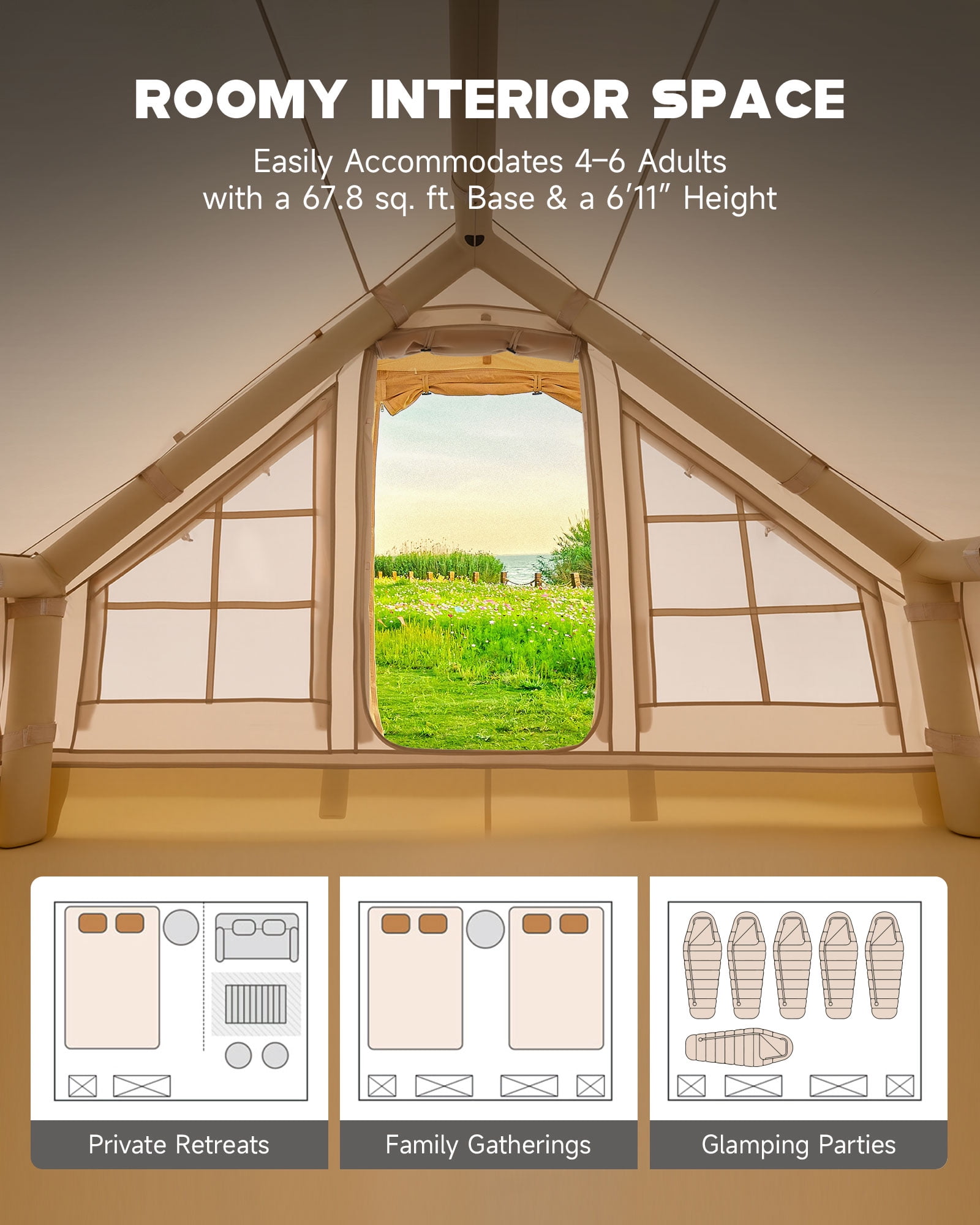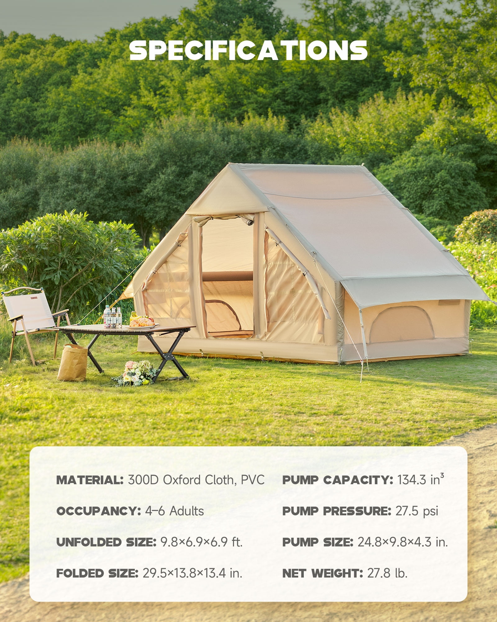 Get ready to embark on unforgettable outdoor adventures with our inflatable camping tent! Its spacious interior provides ample room for the whole family to relax and unwind after a day of adventure. Crafted from durable 300D Oxford fabric and reinforced PVC columns, this glamping tent is built to withstand the elements with ease. Tired of spending precious outdoor time struggling with tent poles? Our innovative inflatable design and included manual pump let you set up camp in minutes, so you can spend less time pitching and more time exploring. With its dual doors, screen window, and top skylight, you can enjoy optimal airflow while maintaining privacy. So why wait? Whether you’re camping, picnicking, grilling, or beach lounging, this tent is your ideal outdoor companion! Features 【Cozy Camping Trip】: This 9.8×6.9 ft. inflatable camping tent from Our comfortably accommodates 4 to 6 adults, providing the ultimate family retreat after a day of adventure. Whether you’re camping or enjoying a day at the beach, revel in effortless comfort and relaxation. 【Easier & Quicker Setup】: No more struggling with metal frames! You’ll have this air glamping tent ready in just 10 minutes thanks to its innovative inflatable design and included manual pump. Spend less time pitching and more time exploring. 【4-Season Camping Tent】: Our outdoor tent is made of 300D Oxford cloth, carefully sewn to provide excellent durability, stability, and sealing performance. With a PU3000mm+ waterproof rating, it ensures all-round protection against the elements. In case of heavy rain, we recommend using a canopy. 【All-Day Ventilation】: Stay comfortable day or night in our inflatable tent, featuring screen windows and dual doors to ensure optimal airflow while keeping pesky bugs away. Plus, enjoy stargazing and natural light from the top skylight of this inflatable house. 【Make Camping a Breeze】: Stay organized with our blow up tent featuring a storage pocket for essentials like phones, tissues, and more. The included carry bag allows for effortless transportation, making camping anywhere, anytime easier. Specifications Material: 300D Oxford Cloth & PVC Occupancy: 4 to 6 Adults Unfolded Size: 9.8 x 6.9 x 6.9 ft. (300x210x210 cm) Folded Size: 29.5 x 13.8 x 13.4 in. (75x35x34 cm) Pump Capacity: 134.3 in³ (2200 cm³) Pump Pressure: 27.5 psi (1.8 bar) Pump Size: 24.8 x 9.8 x 4.3 in. (63x25x11 cm) Net Weight: 27.8 lb. (12.6 kg) Package List 1x Inflatable Tent 1x Air Pump 1x Carry Bag 16x Pegs 4x Guy Lines 3x Repair Patches 1x Instructions