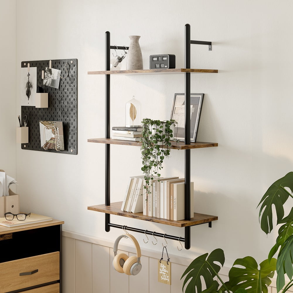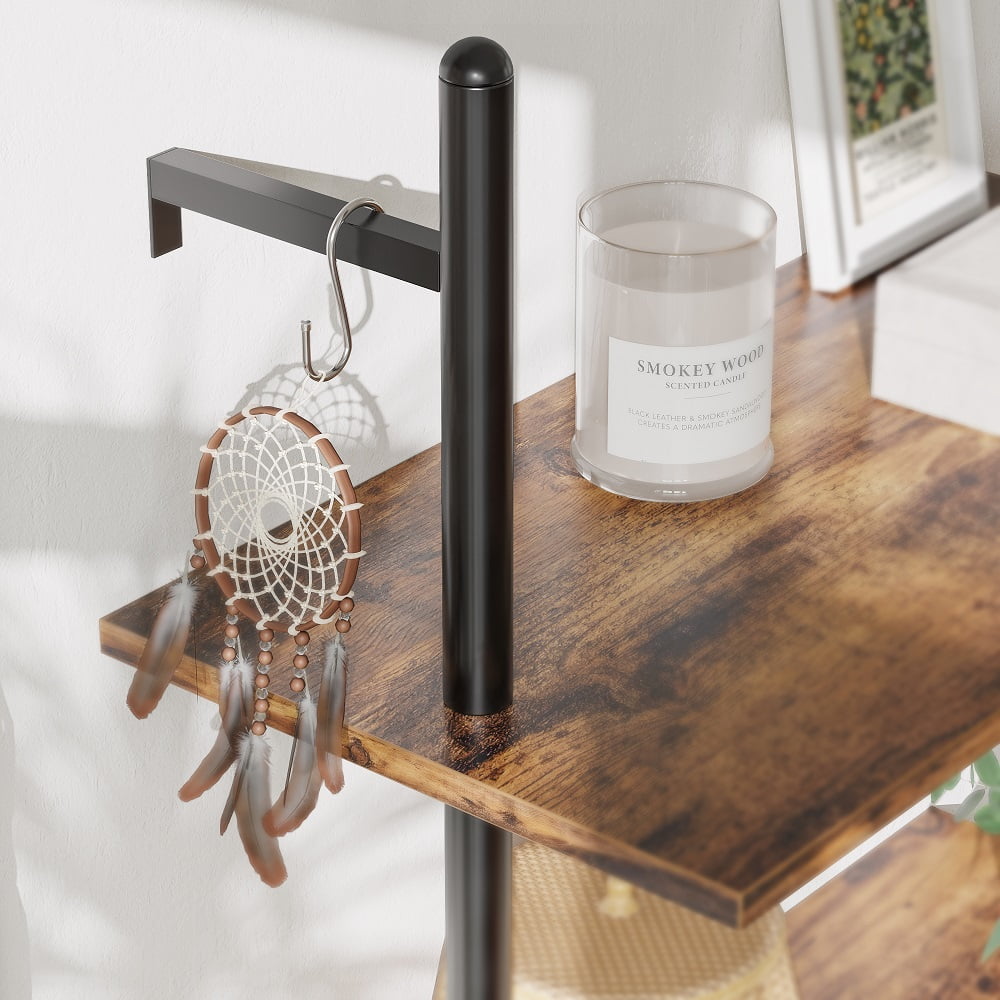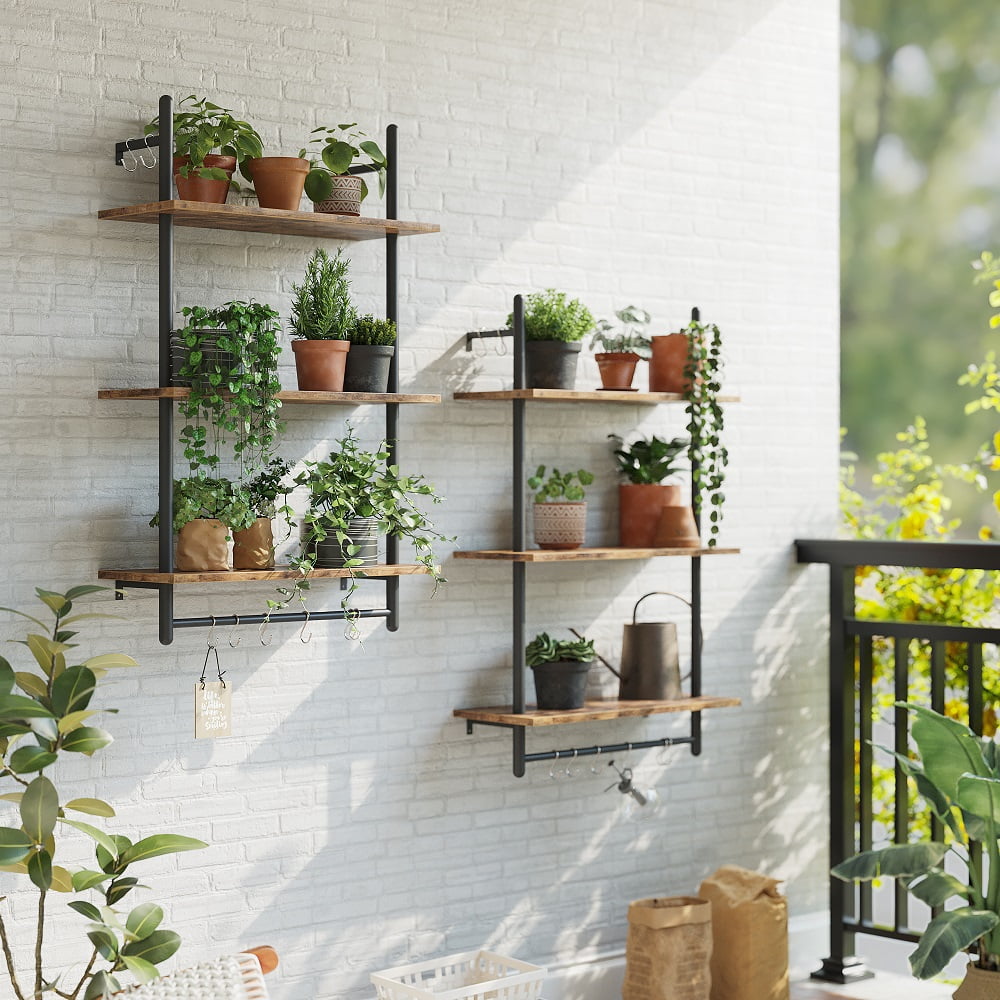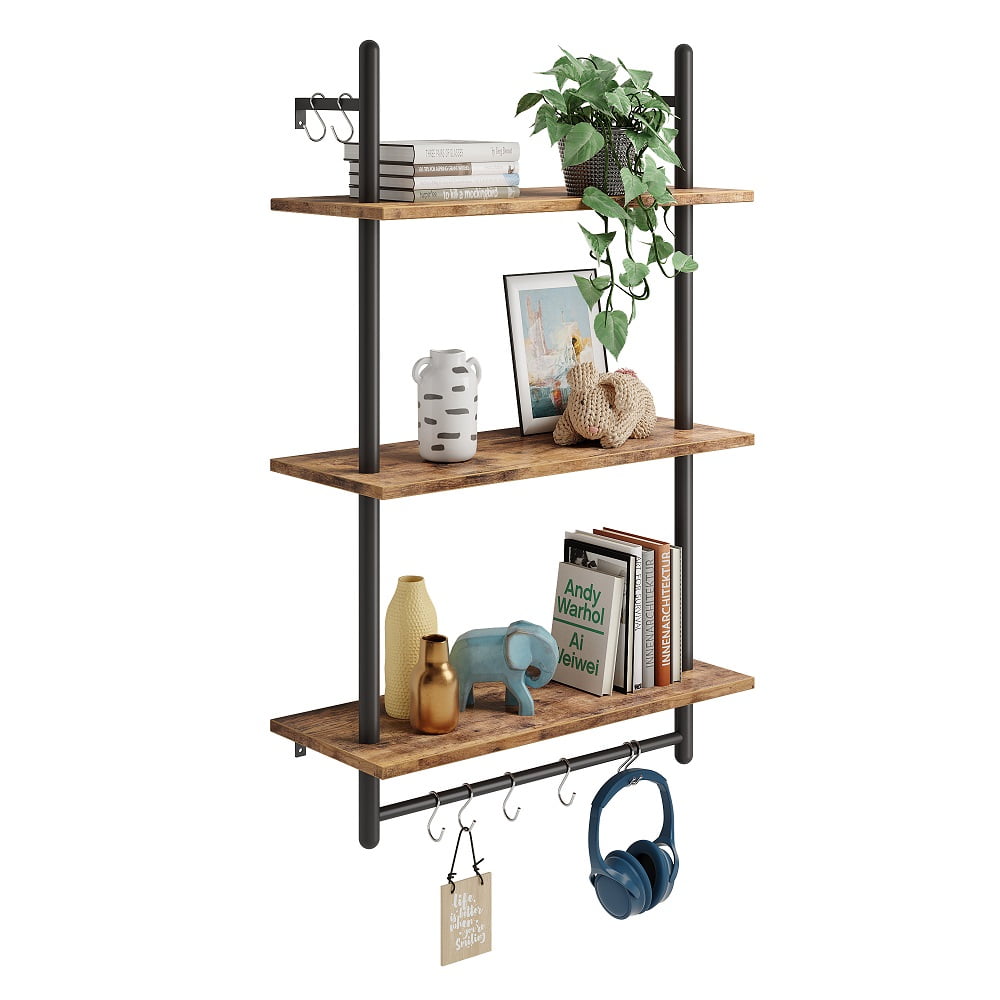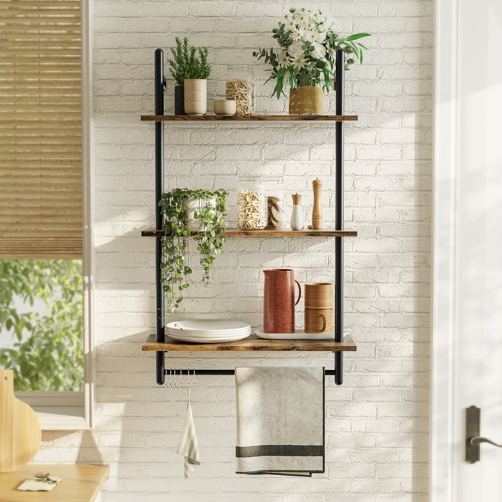 Features 3 Tier Shelves and 8 Hooks – Used as a Chaos terminator, the 3 tier wall shelves are suitable in the living room, dining room, kitchen, and bathroom. There is an extra rod underneath with 8 hooks, bringing more convenience to daily life. Wall Mounted Design – Make full use of space and add a industrial style to your room. The floating shelf will be stable on the wall once it’s fixed. Good Load Capacity – Each shelf can hold up to 20 pounds, offering a strong load-bearing capacity for long-lasting use. Warm tip: it’s better not to put too heavy things just in case. Waterproof and Easy to Clean – Not like other solid wood shelf, ours is made of P2 grade particle-board, which is waterproof for a long time use. Besides, the top is smooth enough to clean with a dry cloth. Easy to Assemble – One could put the ladder shelf together in 15-30 mins without the help of the manual. It’s better to find a partner to hold the shelf and another tighten 4 supports to the wall with a electric drill or hammer. Specifications Dimension: 9.4″L * 23.6″W * 37.8″H Material: CARB P2 Wood + Steel Frame Shelf Bearing: 20LBS for each shelf Package includes: 1 x Ladder Shelf, 8 Hooks, 1x Assemble Manual, 1 x Accessories.
