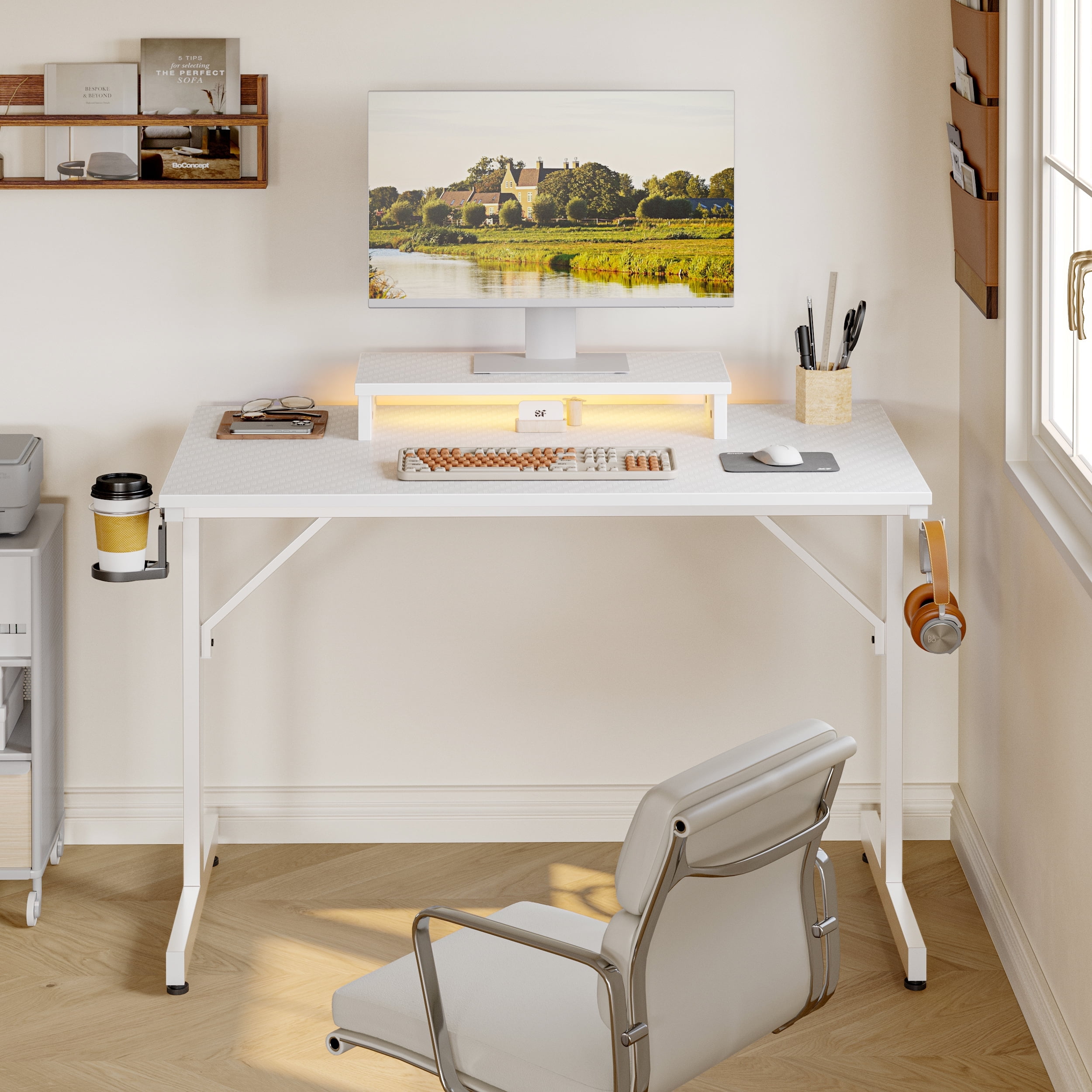 Bestier 42 inch LED Gaming Desk with Monitor Stand PC Computer Gamer Home Office Table in White 【RGB LED Lights】 Revolutionize your gaming ambiance with this 42-inch gaming computer desk, featuring vibrant LED lights with 7 distinct colors and 22 dynamic modes. This gaming desk with LED lights is designed to immerse you in a captivating gaming experience, making it a cornerstone for any gaming enthusiast looking for a visually stimulating gaming environment. 【Enhanced Gaming Convenience】 Designed for gaming enthusiasts, this PC gaming desk offers unmatched convenience with its removable monitor stand, headphone hook, and cup holder, optimizing your gaming space for efficiency and comfort. These features facilitate an organized and smooth gaming experience, making it an essential component of every gamer’s setup. 【Stable & Adjustable】 Equipped with adjustable foot pads, this gaming computer desk ensures stability on any surface, preventing any unwanted movement during intense gaming sessions. The adjustable feature accommodates uneven flooring, providing a secure and reliable gaming platform and peace of mind for passionate gamer. 【Durable & Sleek Design】: Crafted from superior carbon fiber, this gaming table combines durability with a sleek, modern aesthetic. The material is not only robust but also remarkably easy to clean, ensuring the desk maintains its elegant appearance over prolonged use, offering gamer a premium and stylish gaming environment. 【Efficient Assembly】 This PC desk promises a hassle-free and efficient assembly process, allowing gamer to quickly set up their ultimate gaming station and dive straight into the gaming world. The user-friendly design makes it an optimal choice for gaming enthusiasts looking for convenience and quality in their gaming setup. Color: Carbon Fiber White Material: Metal+Carbon Fiber Dimension: 41.97″(L) x 19.7″(W) x 33.2″(H) Maximum Load Weight: 100lbs