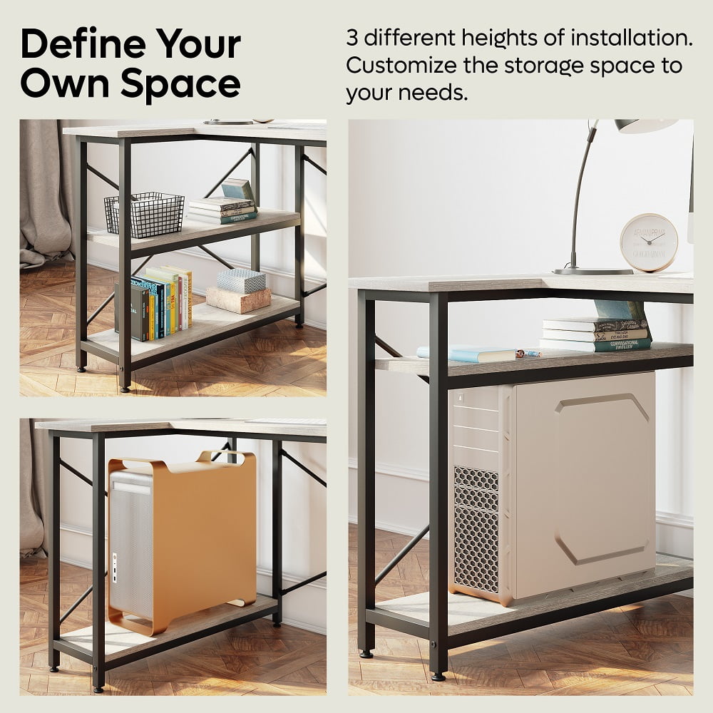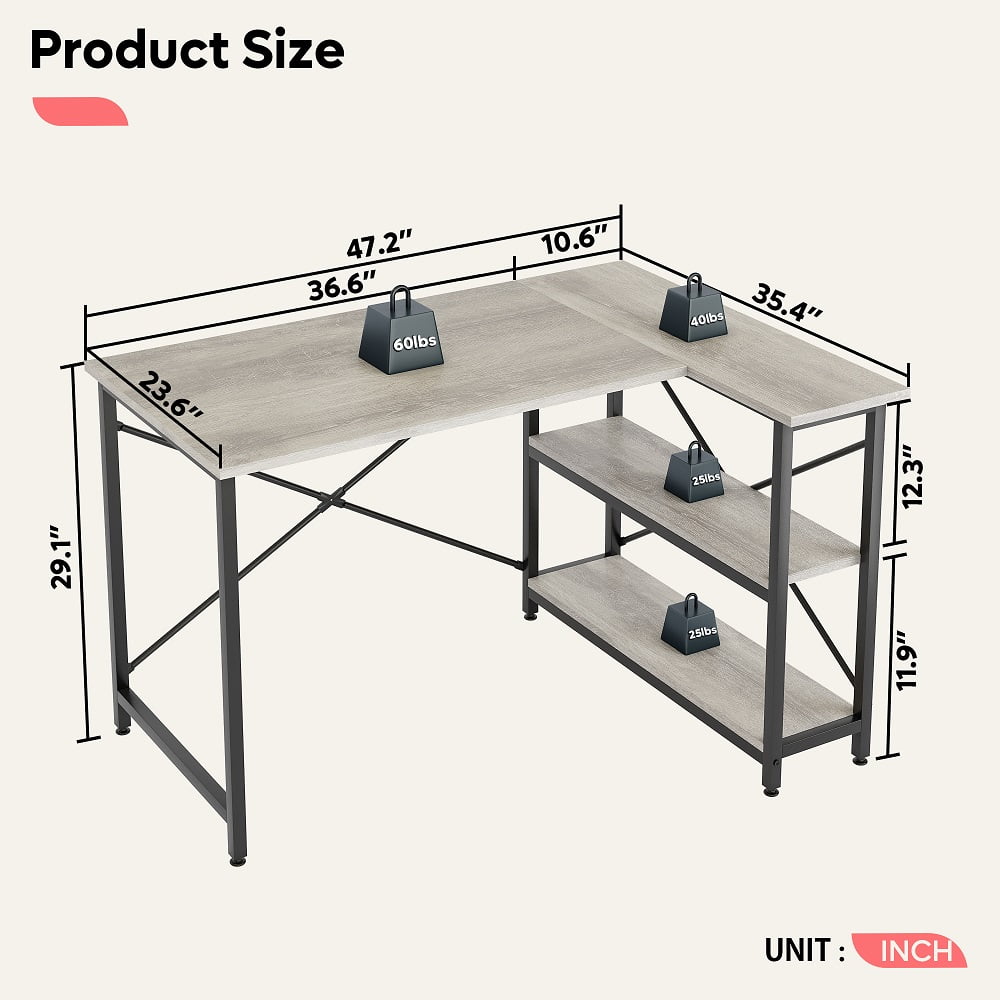 About this item Small L Shaped Design – Special L-shaped design makes this computer desk different from other desks, this one can offer more saving spaces, you can take full advantage of desk space and get files and books within reach. More importantly, the unique appearance makes your home office more lively. Reversible Storage Shelves – In order to facilitate the usage habits of each customer, this writing desk with shelves is designed to be installed in both the left and right directions, you can choose different installation directions according to your preference. Adjustable Shelves for Multiple Use – The height of the Storage Shelve under the desk can be customized to where you wanted, extra screw holes are pre-punched in advance, you can even remove them for your computer tower. P2 Class Board – Environmental-friendly P2 board meets the US CARB(California Air Resources Board) standards, not only can be waterproof, anti-scratching, more importantly, it is healthy to your family and pets, making you feel like in the forest. Assembling Tips: Each of our computer desks comes with the assembling instructions. Specification Dimension: 47″ L * 35″ W * 29″ H Material: CARB P2 Wood + Steel Frame Desktop Load Color: Wash Grey Tabletop Bearing: 60 LBS Storage shelf Load Bearing: 45/25 LBS Package includes: 1* computer desk 1* assemble manual