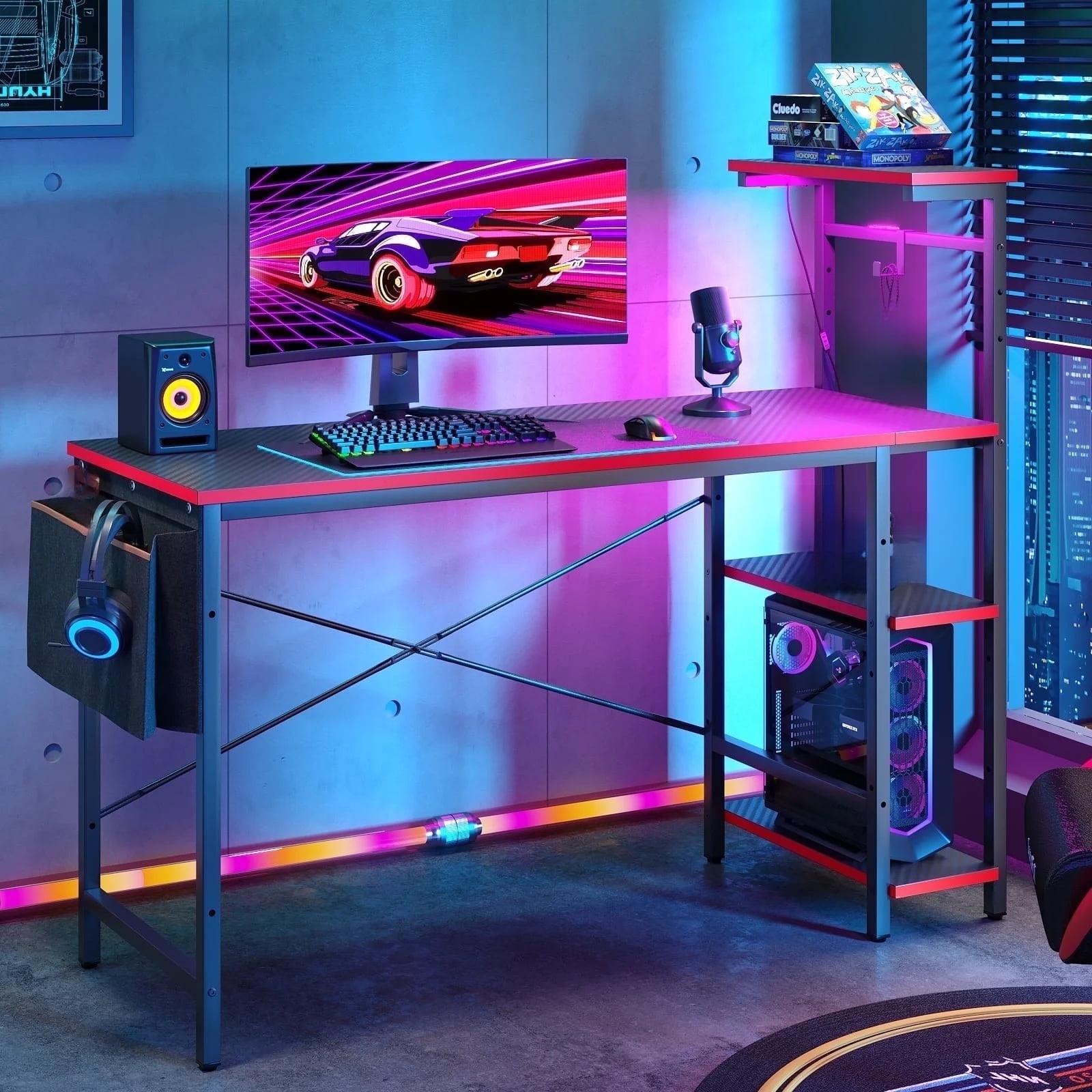 If you are looking for an excellent gaming desk, this 51.3 inch gaming desk is a good choice for you. A large gaming surface can hold a monitor and a laptop at the same time and 4 tier shelves offer plenty space for your necessities, such as files, books, and more. Its carbon fiber surface is comfortable to touch and easy to clean. Designed with X crossbar to ensure the stability of the computer desk. Comes with a headphone hook, a side storage bag and hooks to help keep your desk organized. The LED lights creates a fun and exciting atmosphere, you will completely immerse yourself in your gaming time. Do not miss this excellent gaming desk to be your best partner!