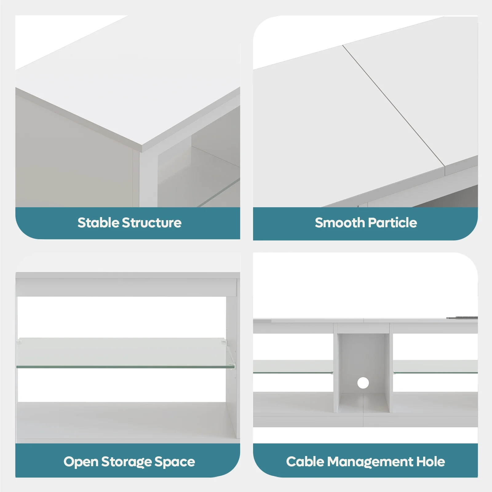 Sleek high-gloss surface adds a modern and sophisticated touch to your room, with an easy-clean surface that resists dust and stains for a lasting luxury aesthetic. Customize your space and ambiance with 22 dynamic LED lighting modes and 7 main colors, controlled by a wireless remote for an immersive viewing experience. Conveniently charge up to 6 devices simultaneously with 2 built-in USB ports and 4 AC outlets, perfect for your phone, WiFi router, gaming consoles, and more. Suitable for TVs ranging from 32 to 65 inches, with overall dimensions of 55.12″ W x 13.78″ D x 18.5″ H to fit your entertainment setup. Thoughtful cable management with a 3-layer wire organization system and rubber-gasket holes ensures a clean, organized look by hiding cables and simplifying device connections.