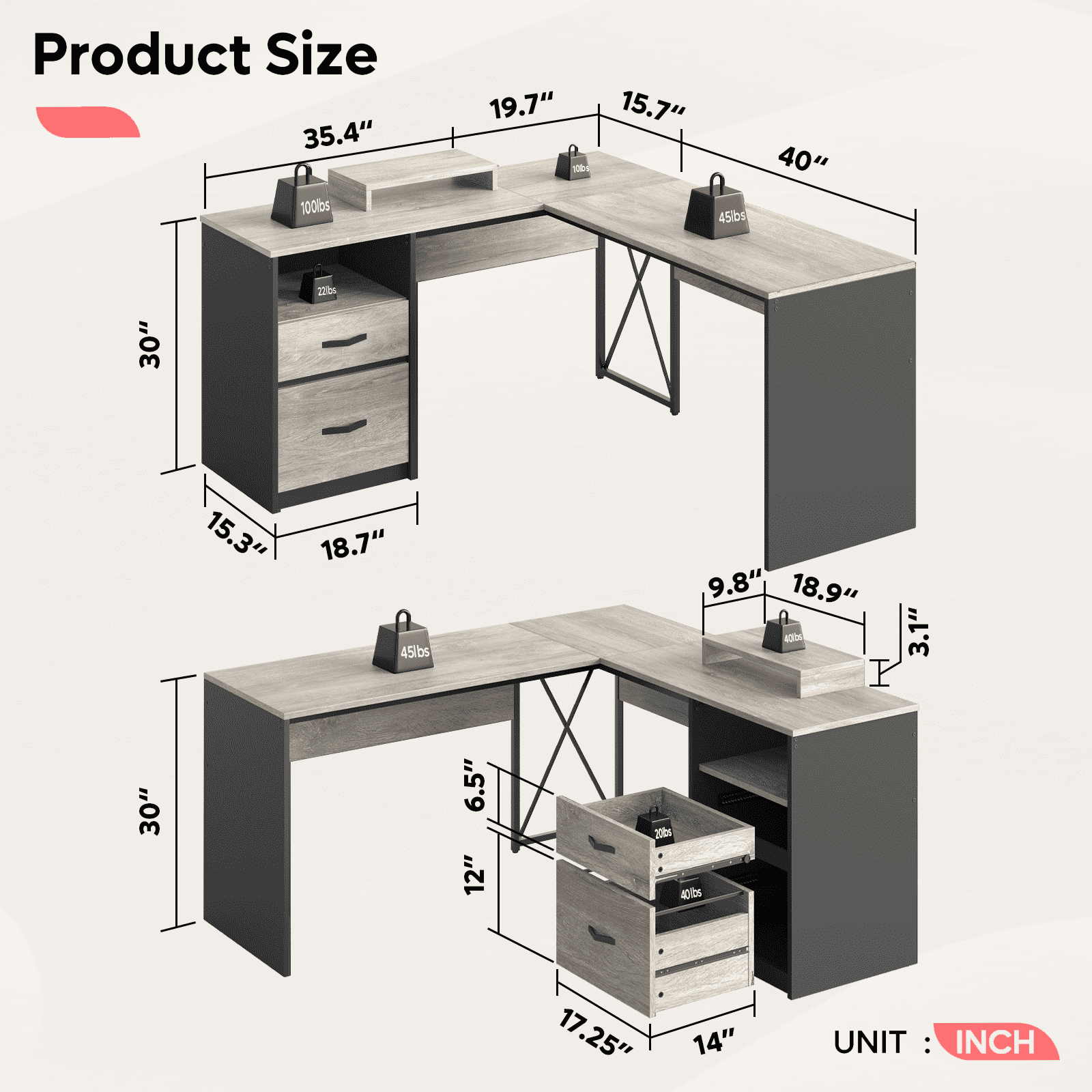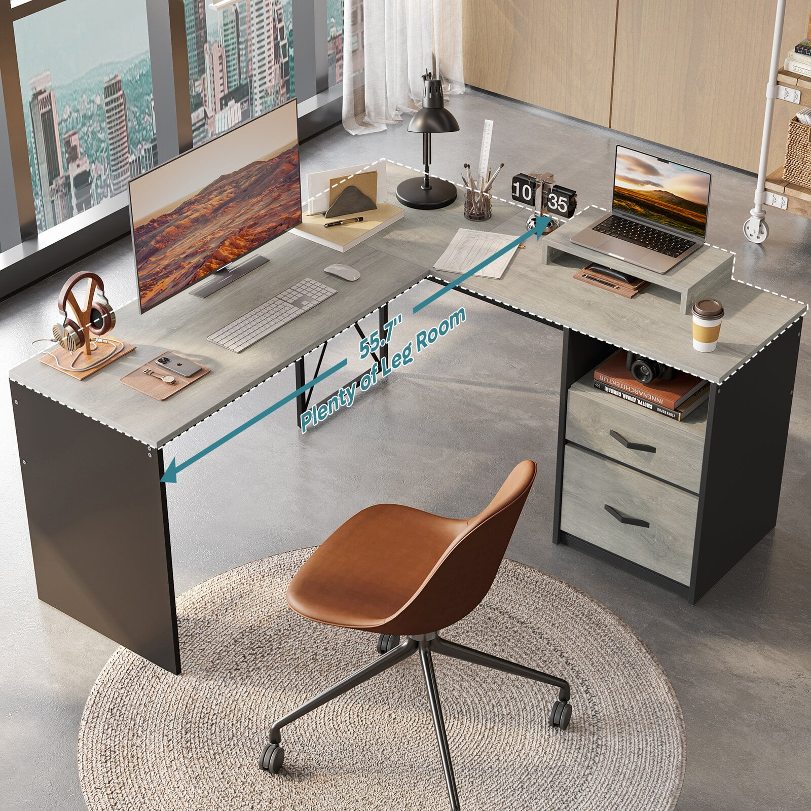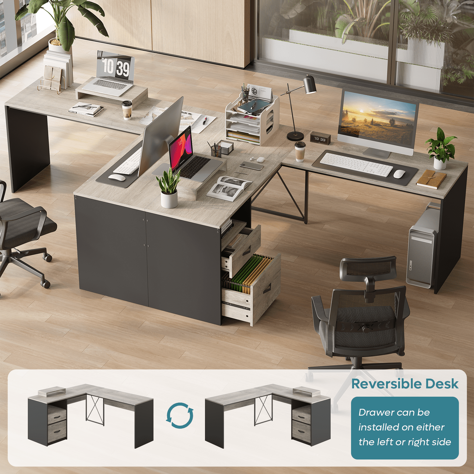 Features Reversible Design: This L-shaped desk, with a 55.7″L x 55.1″W desktop, offers ample space to accommodate two desktop computers and a notebook computer. Its open design ensures plenty of legroom for comfort. The drawers can be conveniently placed on either the left or right side, according to your preference. Versatile Storage: This computer desk comes equipped with a drawer, a file cabinet, and open storage shelves, offering substantial storage space. The file cabinet can accommodate letter, A4, and legal size files. Ergonomic Design:The movable monitor shelf conforms to the ergonomic structure, which effectively reduces the pressure on the back and neck for a more comfortable and productive work experience. Sturdy & Durable: This corner desk is constructed from high quality P2 particle board, offering high resistance to scratches and friction. The X-shaped crossbar frames ensure a stable structure. Additionally, the home office desk features a cable management to keep your wires neatly organized. Easy Assembly: This industrial desks comes with clear and detailed instructions and numbered parts for effortless assembly. If you encounter any issues or have any questions, please don’t hesitate to contact us for immediate assistance.