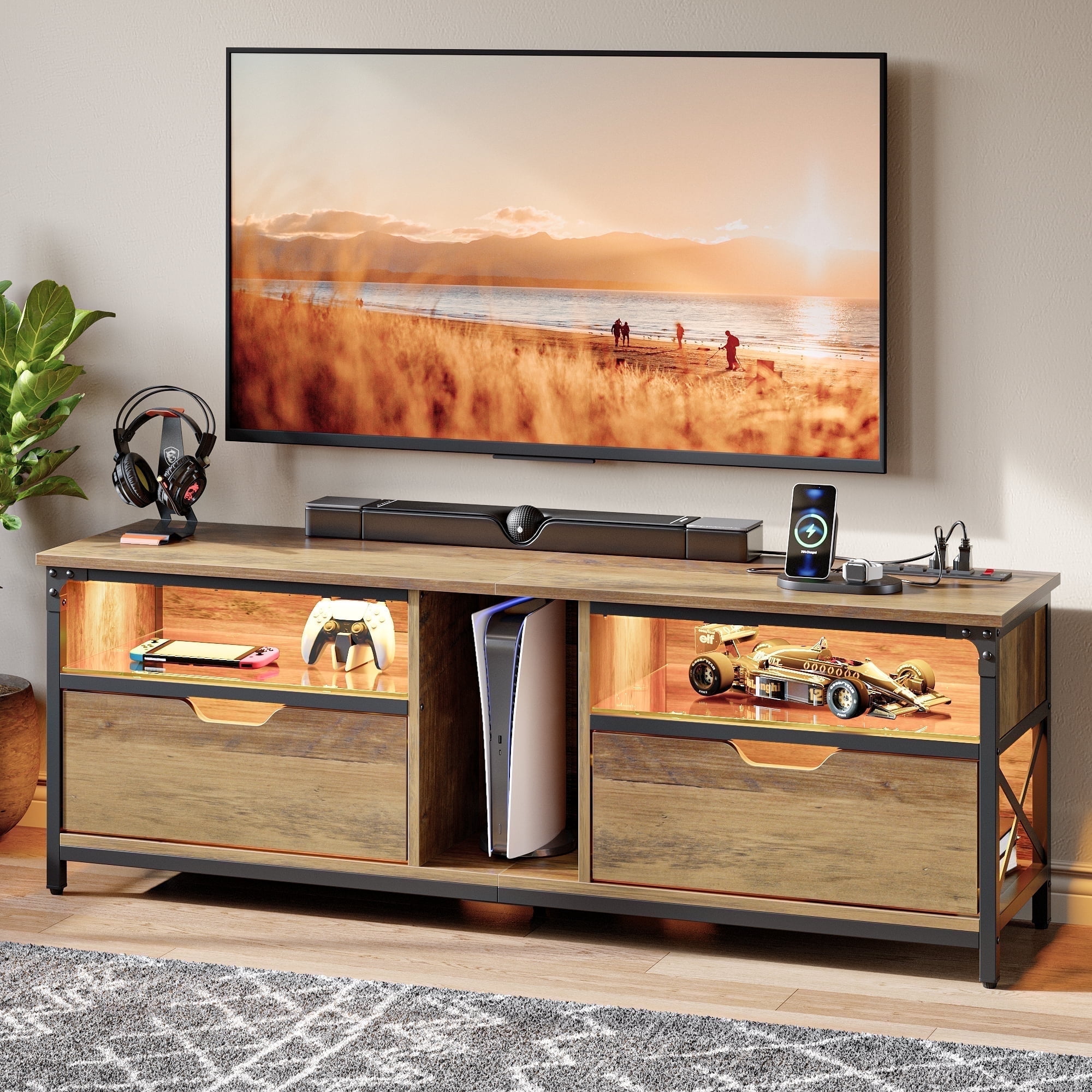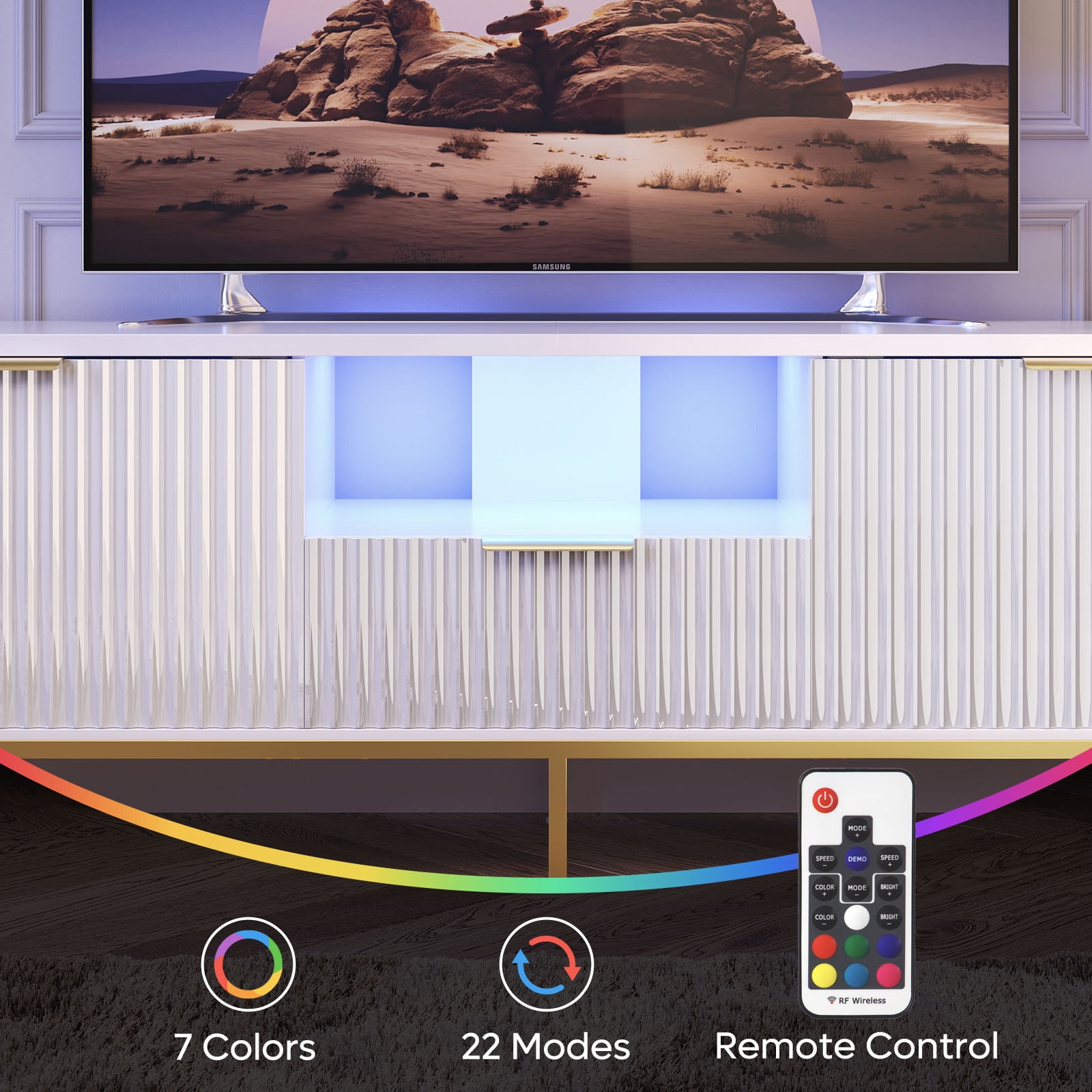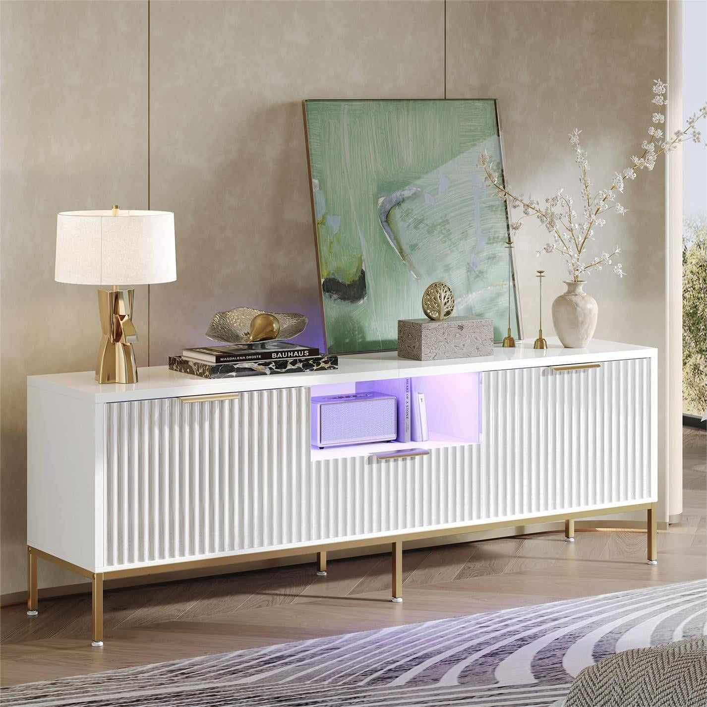 Modern High Gloss Design: This TV stand with drawers features fluted door panels and a sleek glossy surface, complemented by a chic gold frame and handles. It adds a touch of sophistication to any space, making it an ideal choice for living rooms, bedrooms, and offices. Ample Storage Space: With a 55″ tabletop, 1 large drawer, and 2 enclosed cabinets, this modern TV console meets diverse storage needs. An open shelf helps tidy up and conceal wires, keeping your space organized. LED Entertainment Center: Featuring an RGB LED lighting system with 7 color options and 22 color-changing modes, all easily controlled via a wireless remote. Effortlessly create the perfect ambiance for movie nights or gaming sessions. Effortless Maintenance: The 8 adjustable foot pads allow you to elevate the legs for easy cleaning underneath, ensuring stability and protecting floors from scratches. Plus, the high gloss surface is simple to clean. Sturdy Construction: Made from thick, high-quality P2-engineered wood, this TV console is built to last. The middle board enhances stability for the entire stand. Additionally, 8 gold stand feet enhance the loading capacity, ensuring reliable support for your TV and media devices. Easy Assembly: Our 55 inch TV stand comes with comprehensive step-by-step instructions and all essential accessories and tools for effortless installation. Streamline the assembly process and enjoy your new TV setup without any hassle.