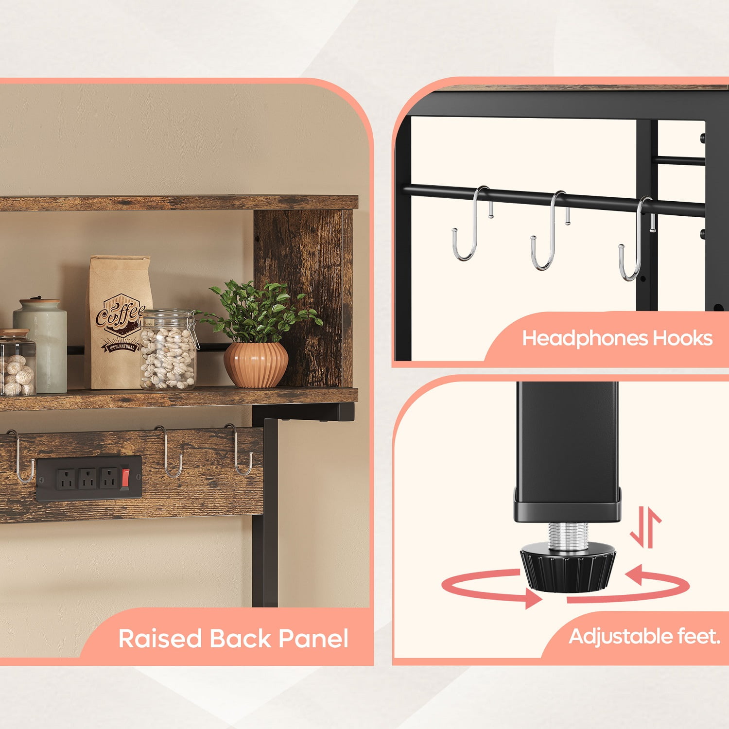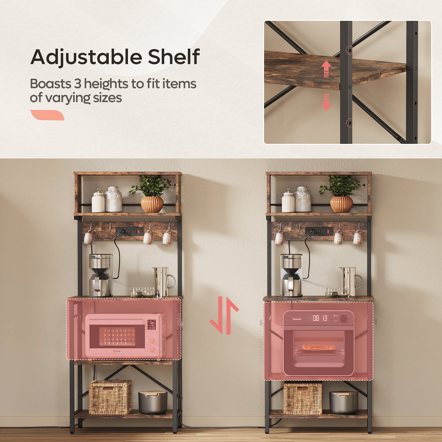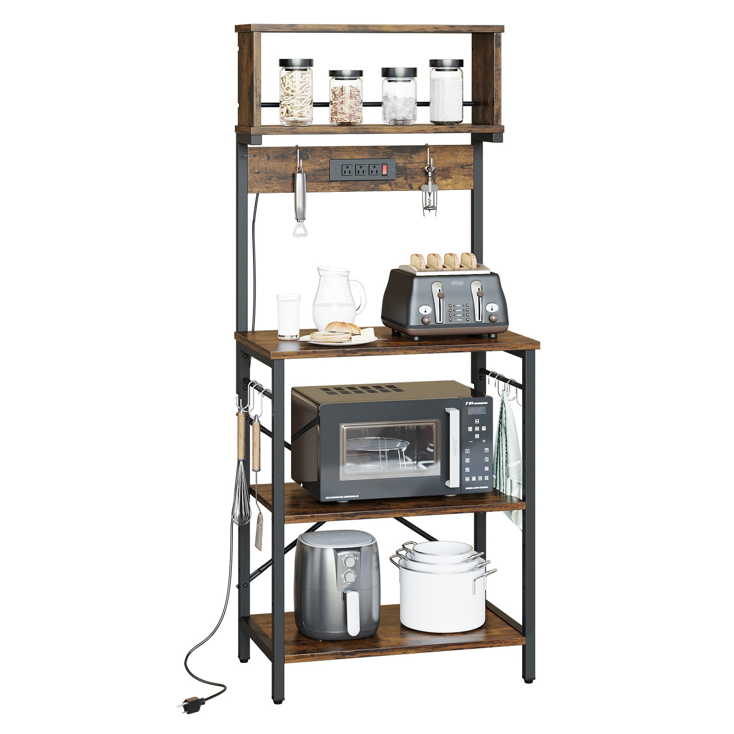 Features Excellent Storage: The kitchen rack comes with 4 spacious shelves and 8 hooks that provide space for storing a variety of everyday essentials, keeping your vegetables, microwave, cooking and eating utensils, plates, and other kitchen accessories in plain sight and easy to use. Simple & Practical Design: The height of the middle shelf can be adjusted to suit the size of kitchenware. It is ideal for holding a microwave, Coffee machine, or oven. The X-bars design offers a large weight capacity which provides more support and ensures stability and durability. Power Outlet: This microwave rack features UL-listed 3 power outlets charging three kitchen appliances at the same time and saving you the hassle of buying extra power extensions for multiple kitchen appliances. The 6.5′ long double-insulated power cord can be neatly collected with the included hoop and loop fasteners. Solid Construction: This Utility storage shelf is constructed with a high-quality PB particle board and a black metal Frame. Come with 4-foot pads to prevent your floor from being scratched and the 2 anti-tip straps ensure added safety. Industrial Style: Industrial and casual style, industrial color make this kitchen rack well match your other furniture for your kitchen, dining room, living room, and bathroom, live your dream kitchen in the most possible way. Specifications Color: Rustic Materials: PB board+metal frame Overall Dimensions: 23” L x15.8” W x60.3” H Power Outlet: 3 AC Outlets with a Switch Power Cord Length: 6.5′ S-Hooks * 8