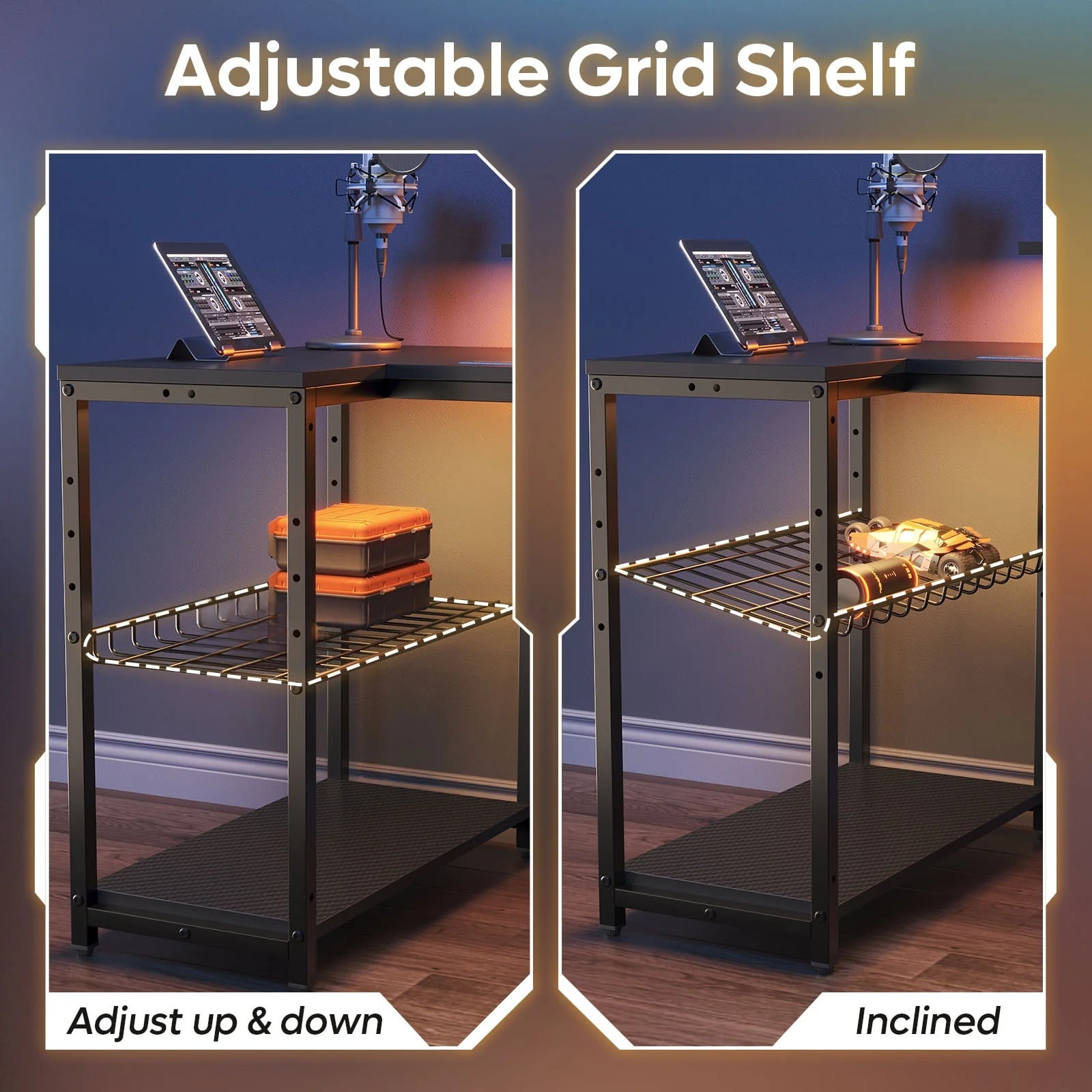 Gaming Desk with Outlets: The computer desk is equipped with 3 AC outlets and 2 USB Ports, providing easy access to power for your computer, printer, scanner, phone, tablet, and gaming gear. The cable is 6.5FT long. Rated Power: 1500W; AC Outlet: 120V/12A; USB Port: 5V/2.2A RGB LED lights: The gaming desk features LED lights with 7 main colors and 22 dynamic modes. Dim the lights and select your favorite color to create a fully immersive gaming environment that’s uniquely yours. 41″L Monitor Stand: The office desk features a 41″L*7.3″W*6″H monitor stand, designed to elevate your screen for a more comfortable viewing angle. This ergonomic design helps keep your head up and reduces neck strain, promoting better posture during your work or gaming sessions. Adjustable Shelf: The corner desk is designed with three storage shelves underneath, providing optimal use of your home office space. The grid shelf offers three adjustable heights, accommodating your items and computer devices efficiently, maintaining a neat workspace while providing ample legroom. Sturdy & Durable: The gaming desk is designed with back support bars for maximum durability and stability. The adjustable feet not only protect your floor from scratches but also ensure stability on uneven surfaces. For added convenience, the desk comes with a cup holder and hooks that can be positioned on either side to suit your personal preferences.