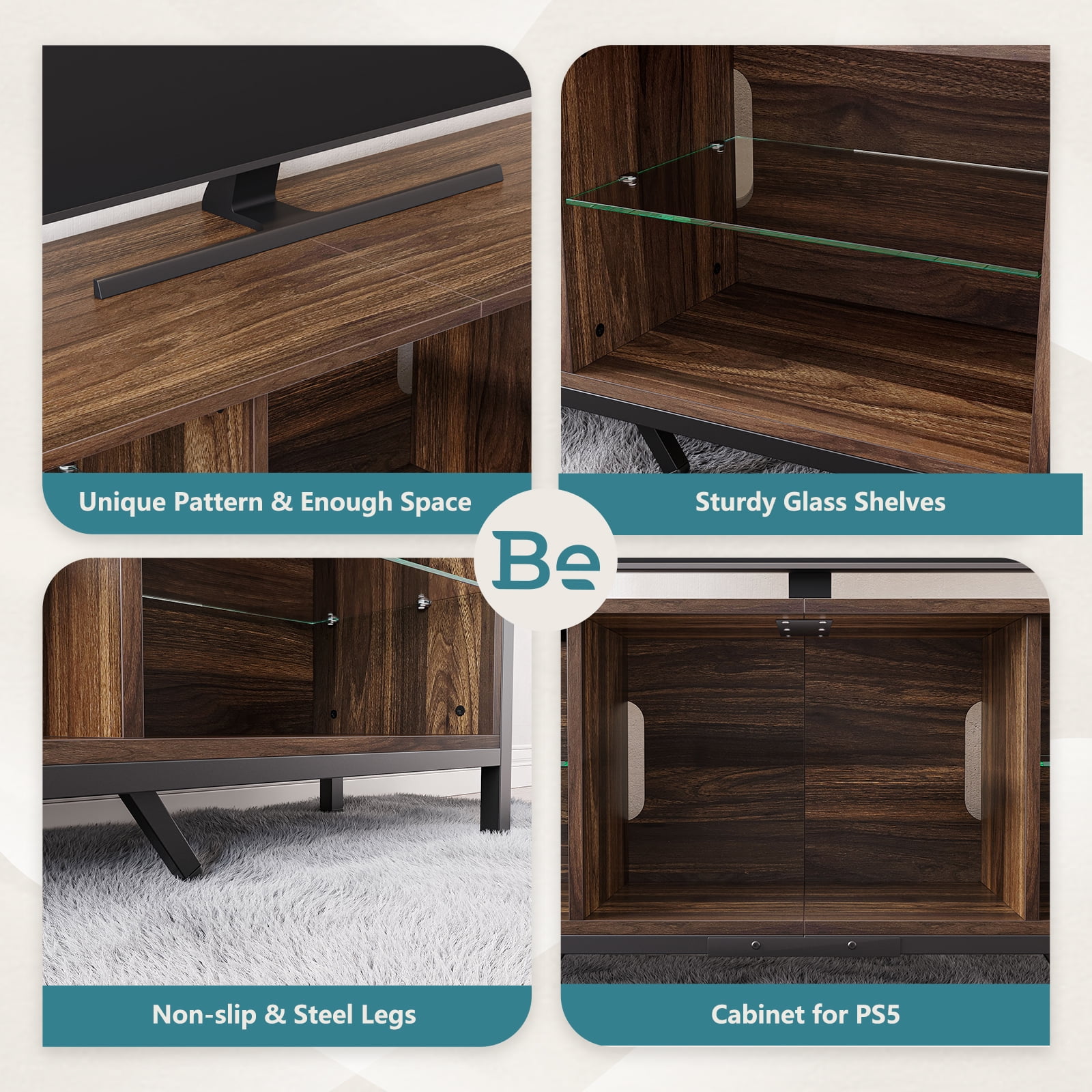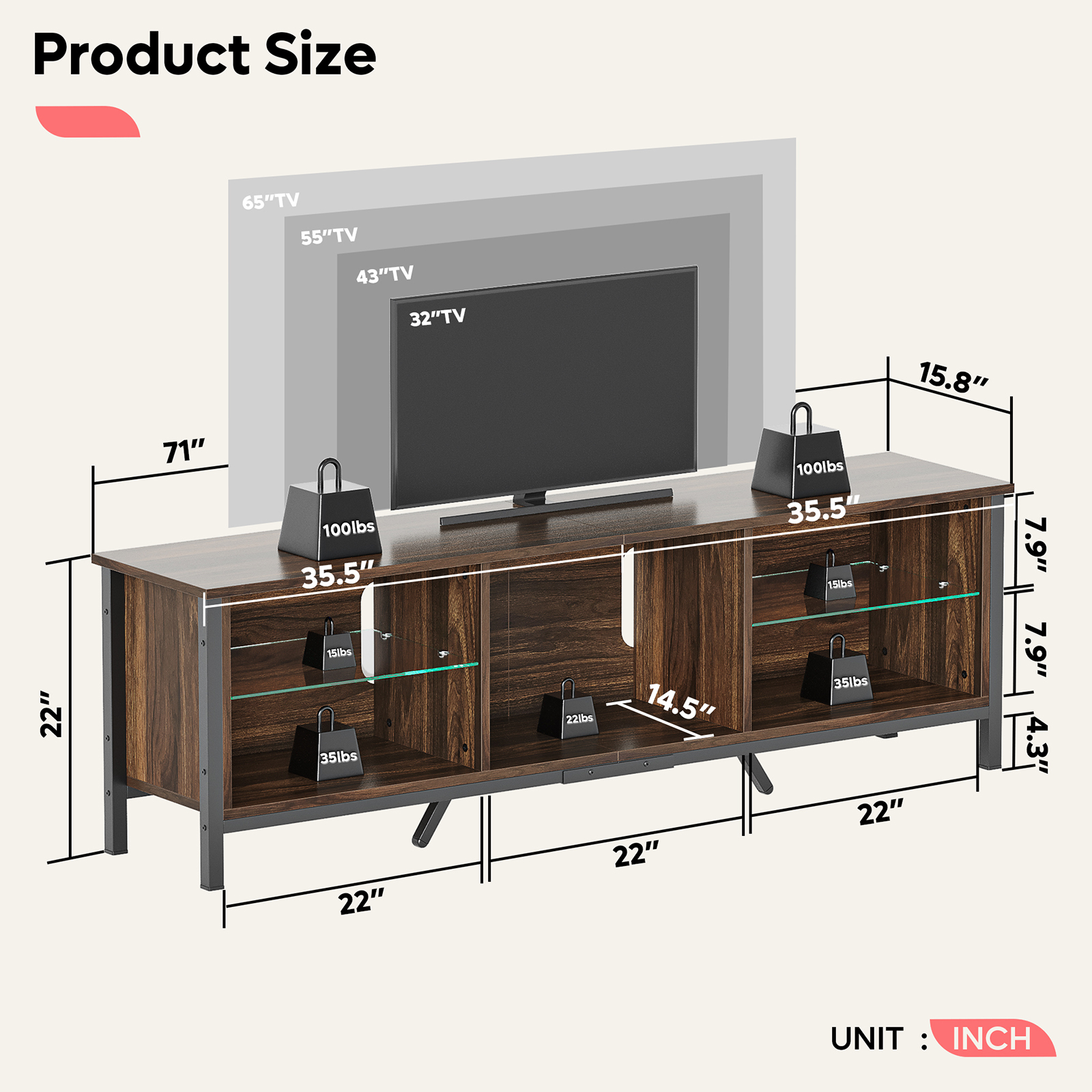 Oversized Design: Our TV stand, with a 70-inch surface, offers more than the average space, accommodating larger TVs with ease. Its all-in-one design is stylish and generous, making it a standout piece in any living room setup. LED Lighting and Remote Control: Equipped with an LED light strip and a remote control, our TV stand can adjust to various lighting modes, allowing it to seamlessly blend with your home decor. Whether you’re watching a movie or hosting a party, you can set the perfect mood. Efficient Space Utilization: The design of our TV stand allows for the placement of a sound system in the middle, making efficient use of space. This feature enhances your viewing and listening experience, turning your living room into a personal theater. Adjustable Glass Shelves: Our TV stand features adjustable glass shelves that can be tailored to fit your storage needs. Whether you’re storing DVDs, game consoles, or decor items, these removable shelves provide flexibility and convenience. Easy Assembly: Our TV stand is designed for a hassle-free setup. With clear instructions and an easy-to-follow process, you can assemble it quickly and effortlessly, saving you time and energy. Specifications: Material: P2 Particle Board + Metal Frame Overall Dimension: 71″L×22″H×15.7″D Top Load Bearing: 100 LBS Bottom Shelf Load Bearing: 25LBS Overall Product Weight: 77.16 LBS Self-assembly: All fixings and tools supplied
