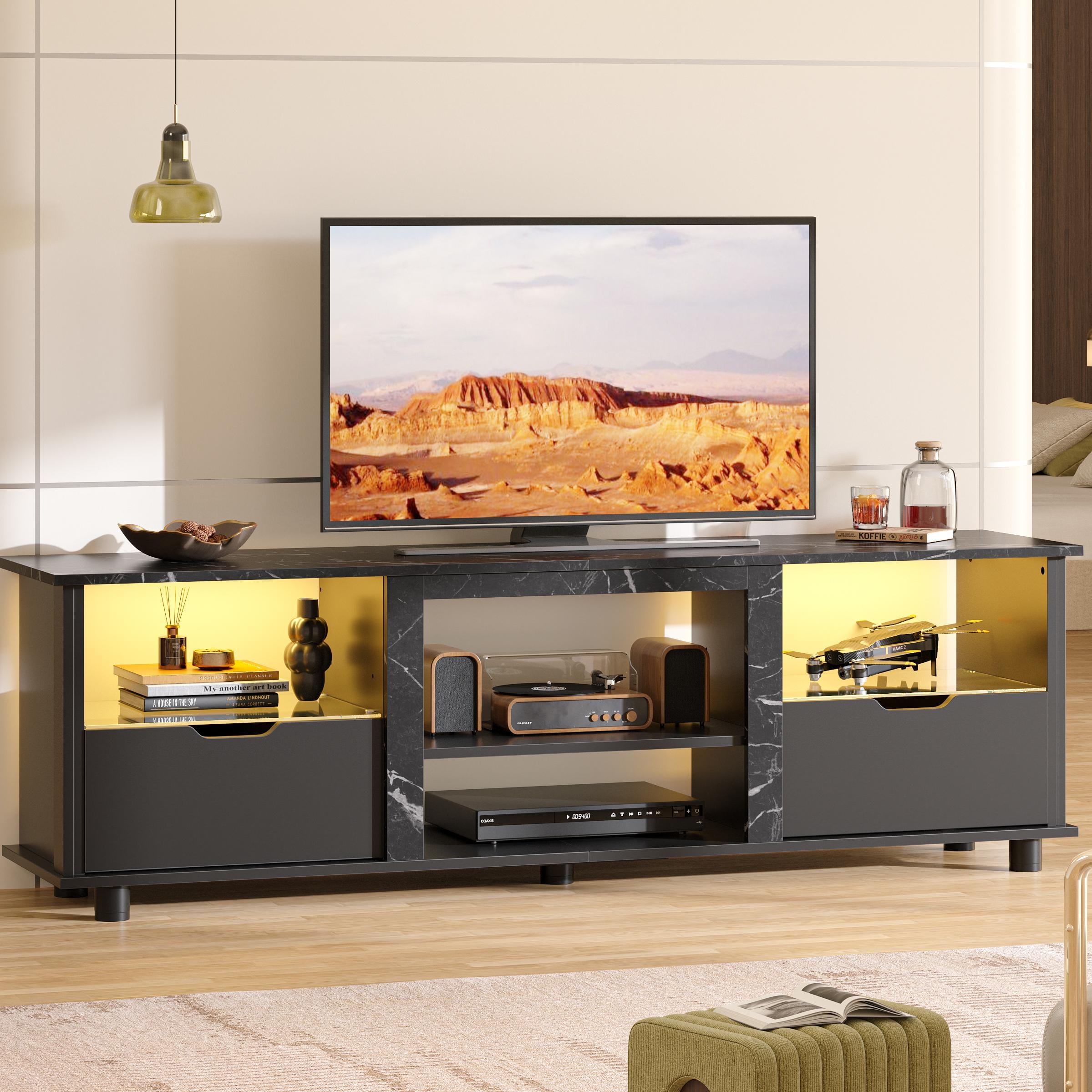 Bestier 70 inch TV Stand with LED Lights, Entertainment Center for TVs up to 75″, TV Console Table with Drawers & Adjustable Shelves, Black Marble