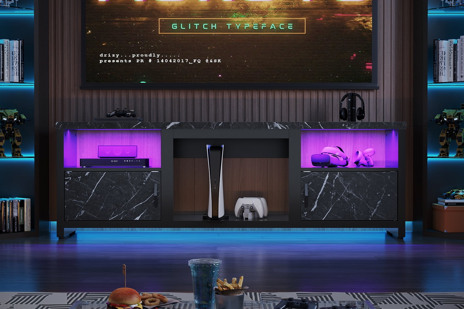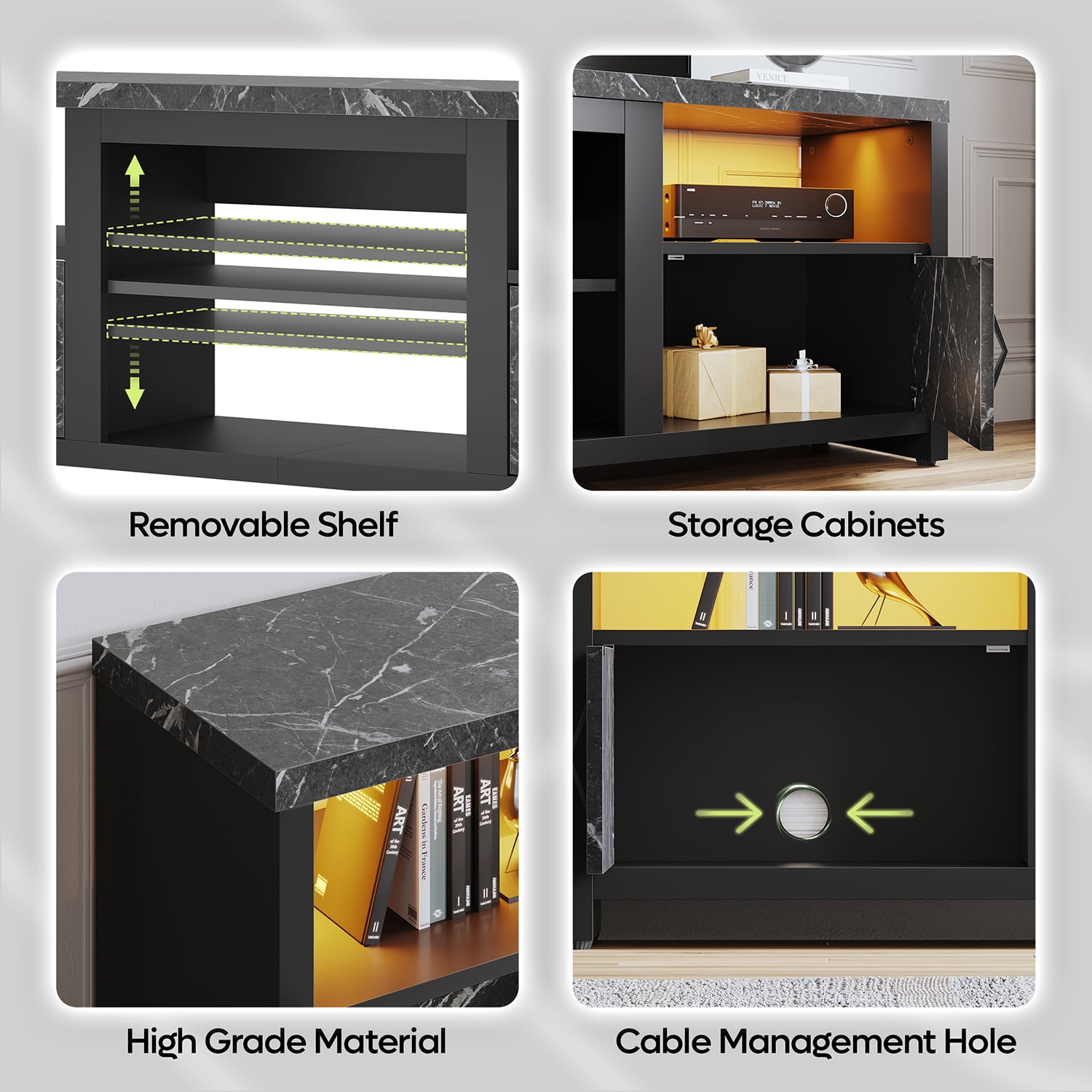 Adjustable LED Lights: The entertainment center TV stand come with 7 main colors and 22 dynamic modes LED lights system. You can adjusts the lights of different colors according to different preferences, which makes your home more elegant and beautiful. Great for the bedroom, living room, game room, family room etc. Ample Storage Space: The led tv stand features two cabinet, perfect for storing your private items.The four open shelves provide additional space for video games, movies, remote controls, DVD players,books,and other essentials. Adjustable Shelf: The middle shelf on this solid wood entertainment center can be installed or remove depending on how you want to use it. It has 3 adjustable heights for customizable organization. If you remove the shelves, the space can easily accommodate a PS5, game controller, and other gaming equipment. High Quality: The TV stand is made of CARP P2 board, which is scratch-resistant and waterproof. The large-area load-bearing structure at the bottom makes the cabinet stable and sturdy.The black marble finish makes the entertainment center look great in different home decor styles such as modern, mid-century, retro, industrial decor and more. Easy To Assemble: All the boards and hardware are included. An instruction is also included for easy installation. Bestier are committed to serving customers with reliable quality products, please get in touch with us if you have any requests!