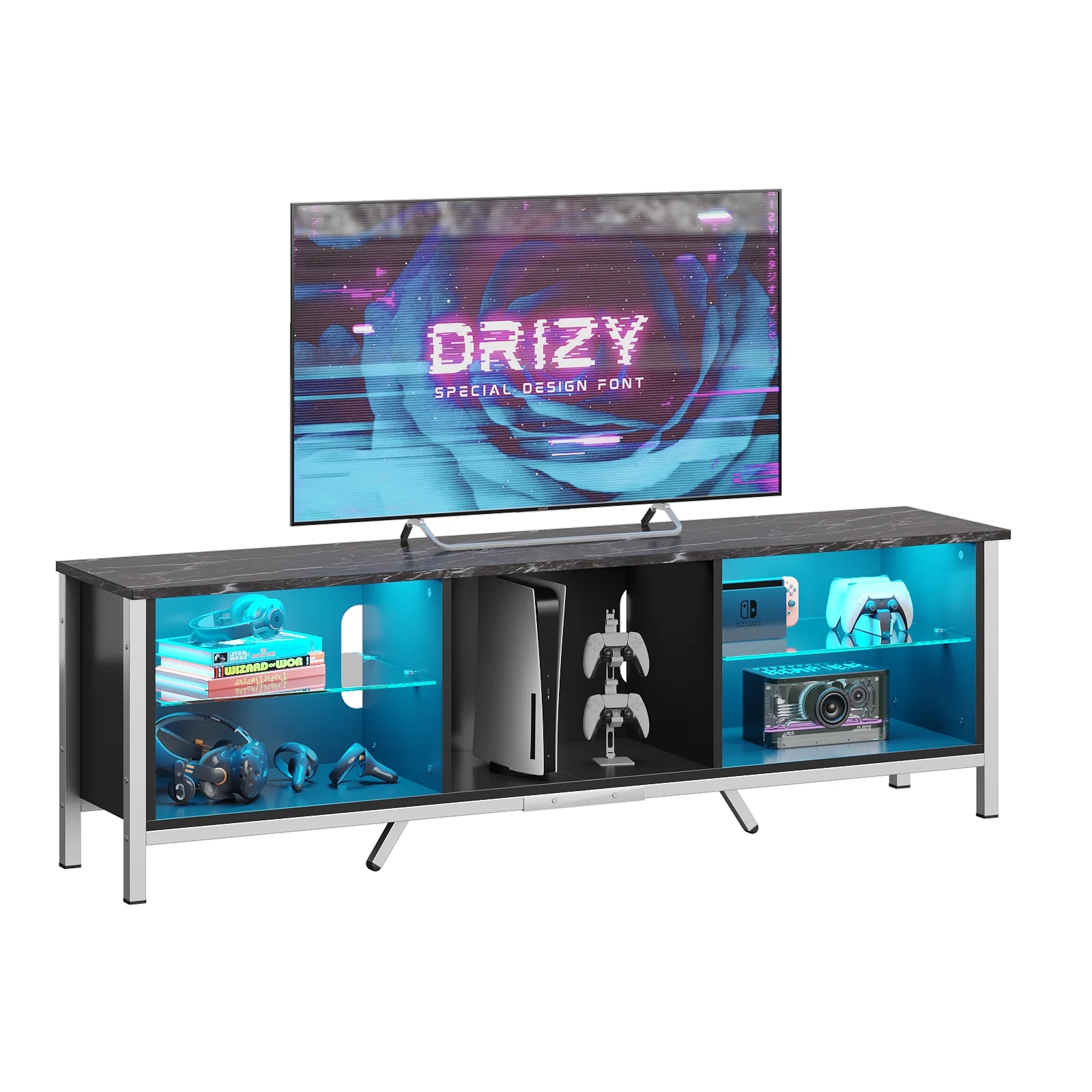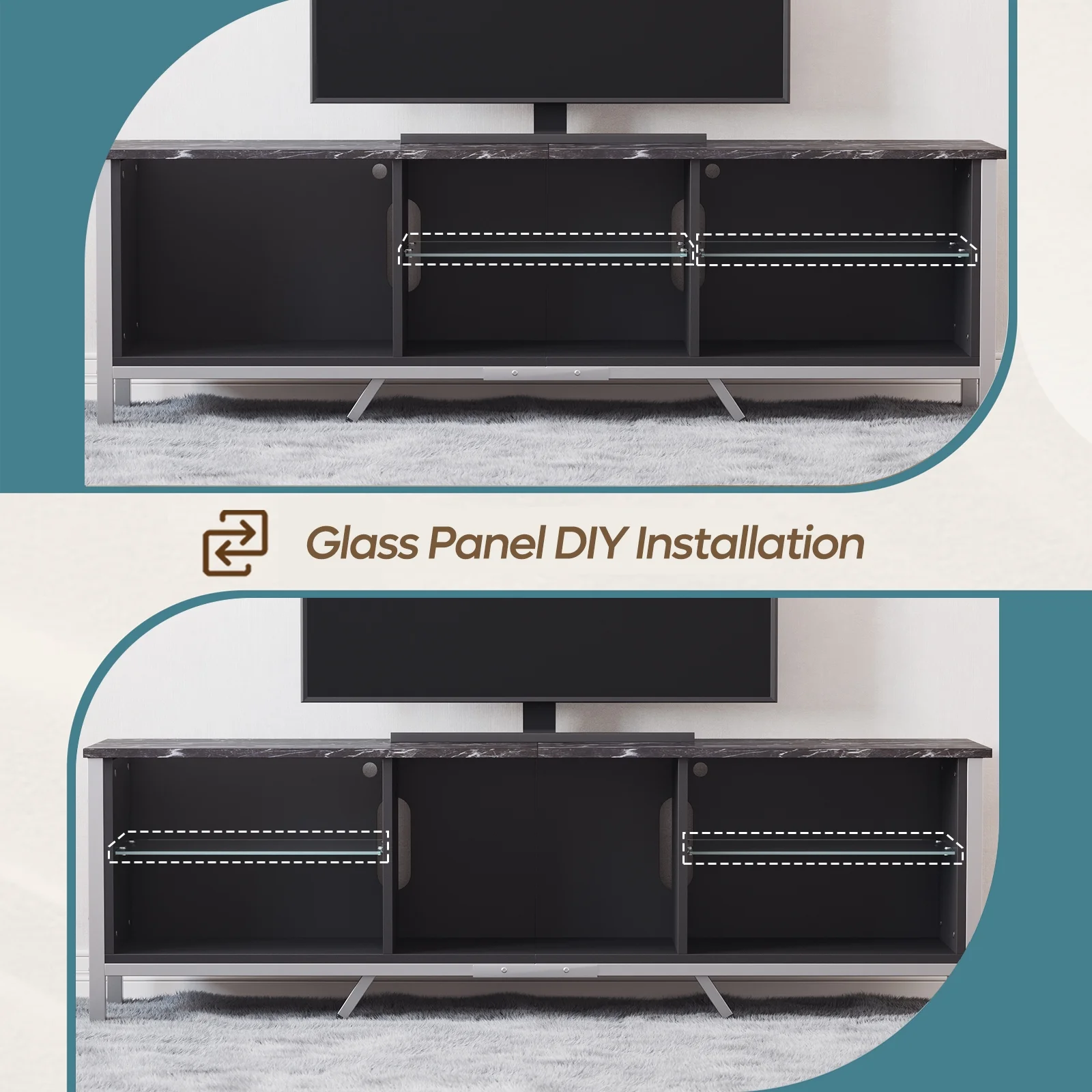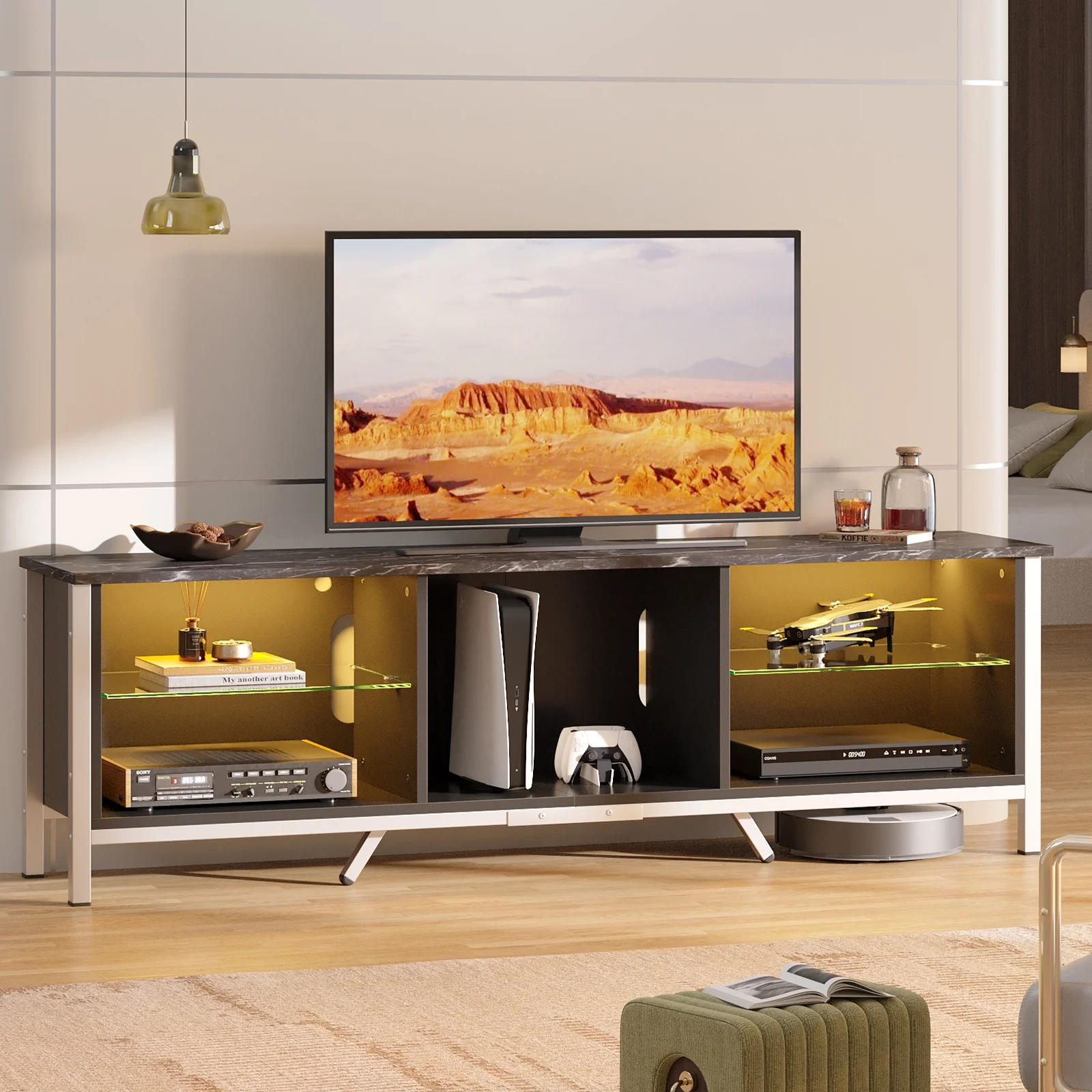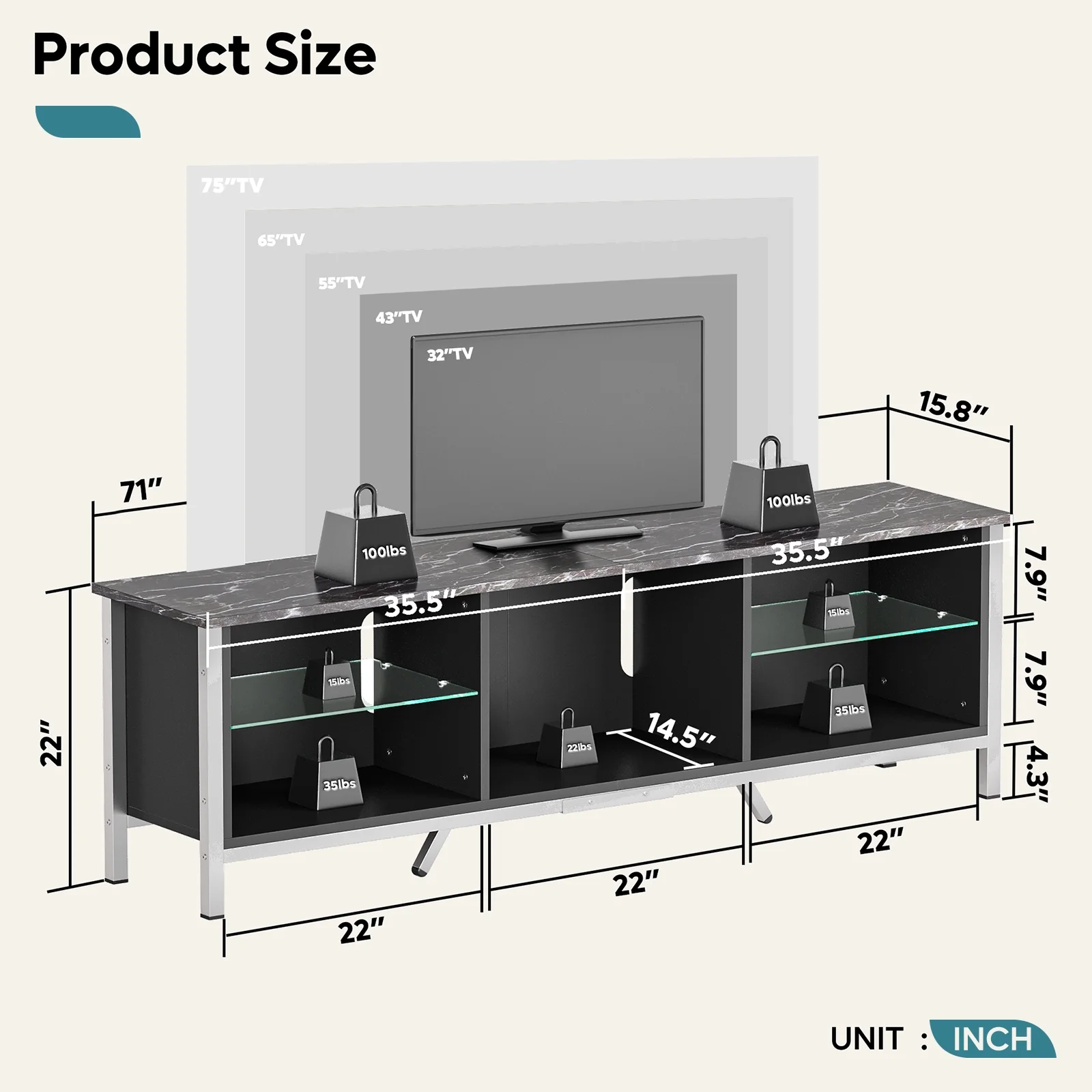 Features Immersive Entertainment Experience: This TV stand features LED lights with 7 primary colors and 22 dynamic modes, creating a captivating ambiance for your living room, gaming room, or bedroom. The detachable glass shelves enhance the light effects, making it perfect for special occasions. Ample Storage Space: Measuring 71″L×22″H×15.7″D, this wide TV stand can accommodate a TV up to 80 inches. It provides ample storage for your stereo, speakers, books, DVDs, gaming consoles like PS5 and Switch, magazines, and other electronics. Flexible and Personalized Storage: This modern TV stand features two sturdy glass shelves and a spacious cabinet, offering diverse storage options. You can adjust the shelves according to your needs, making it ideal for storing various items. Durable and Stylish Design: Made of CARB certified P2 particle board, this TV stand boasts great stability and durability. The special marble finish adds a touch of elegance, making it a fashionable addition to your home. Easy Assembly: This modern 70 inch TV stand comes with all the necessary hardware and detailed instructions for assembly. With easy-to-follow steps, you can effortlessly put together this stylish piece, enhancing your space in no time.