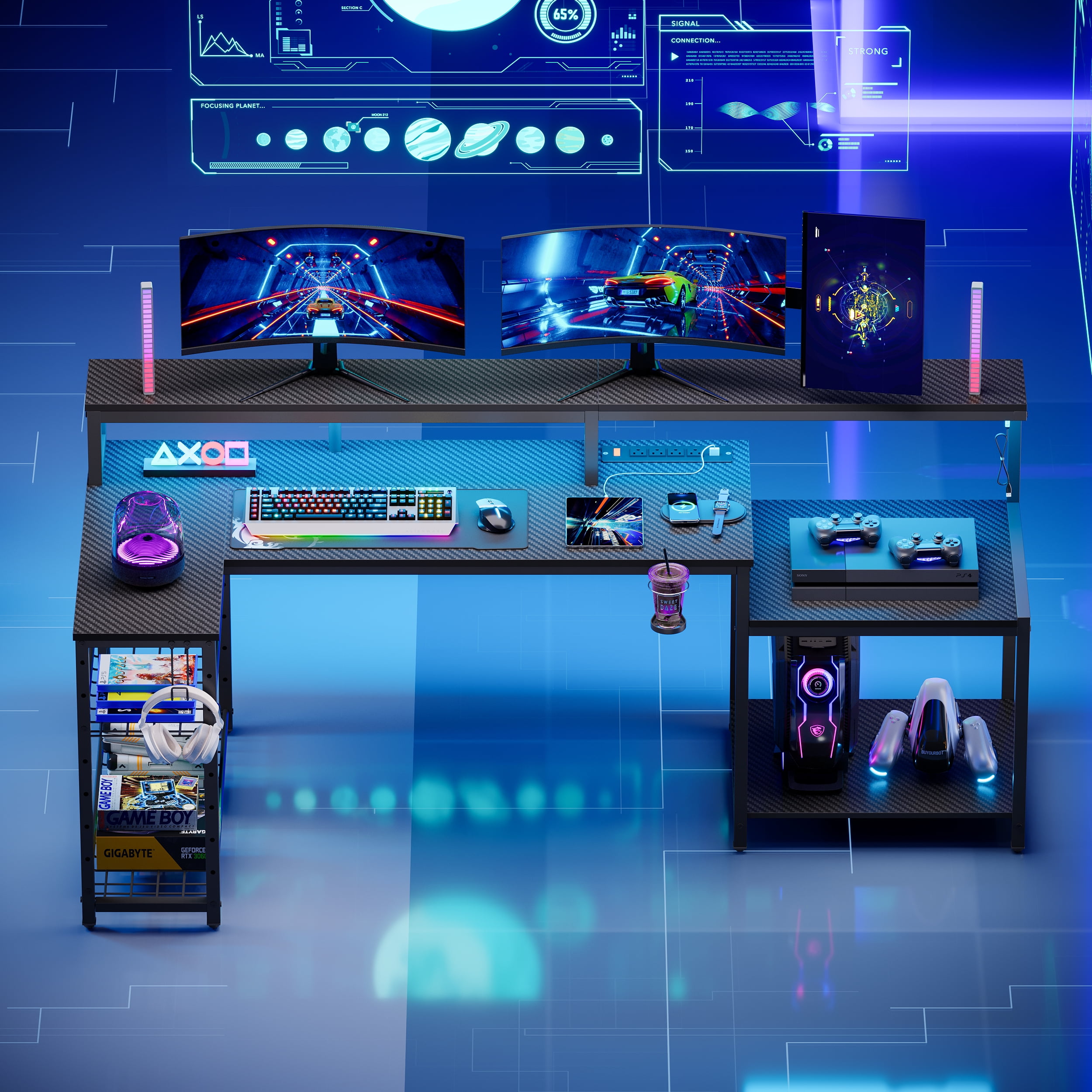 Bestier 71 inch L-Shaped Gaming Desk with Power Outlets LED Computer Office Table with Monitor Stand & Storage Shelf in Carbon Fiber Black
