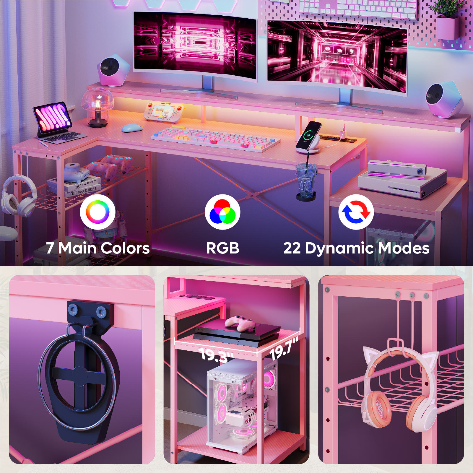 This l shaped desk is equipped with 4 AC power sockets + 2 USB charging ports, which can power up to 6 devices at the same time, bringing great convenience to your gaming or home office. Easily charge your gaming devices, computers, PS4, VR device, smartphones, or power banks. Rated power: 1500W; AC power outlet: 120V/12A; USB port: 5V 2.2A
