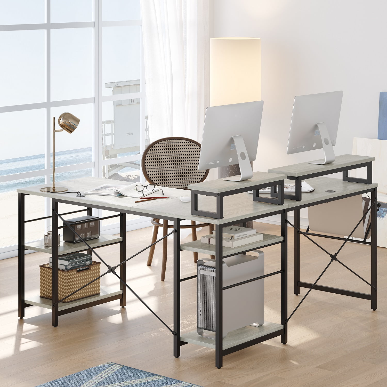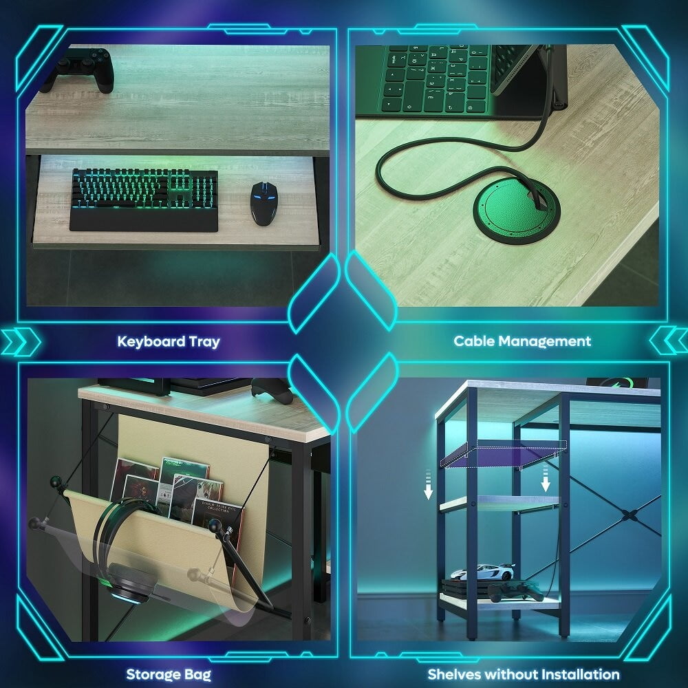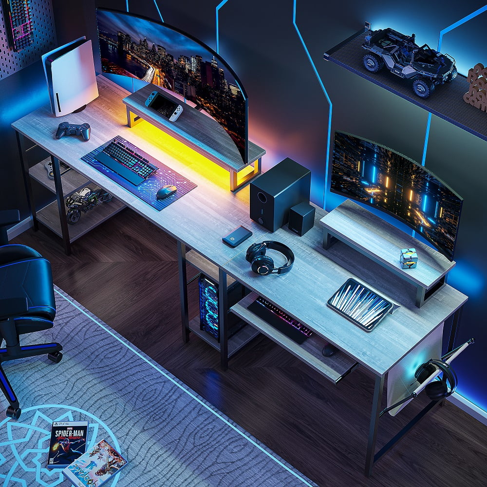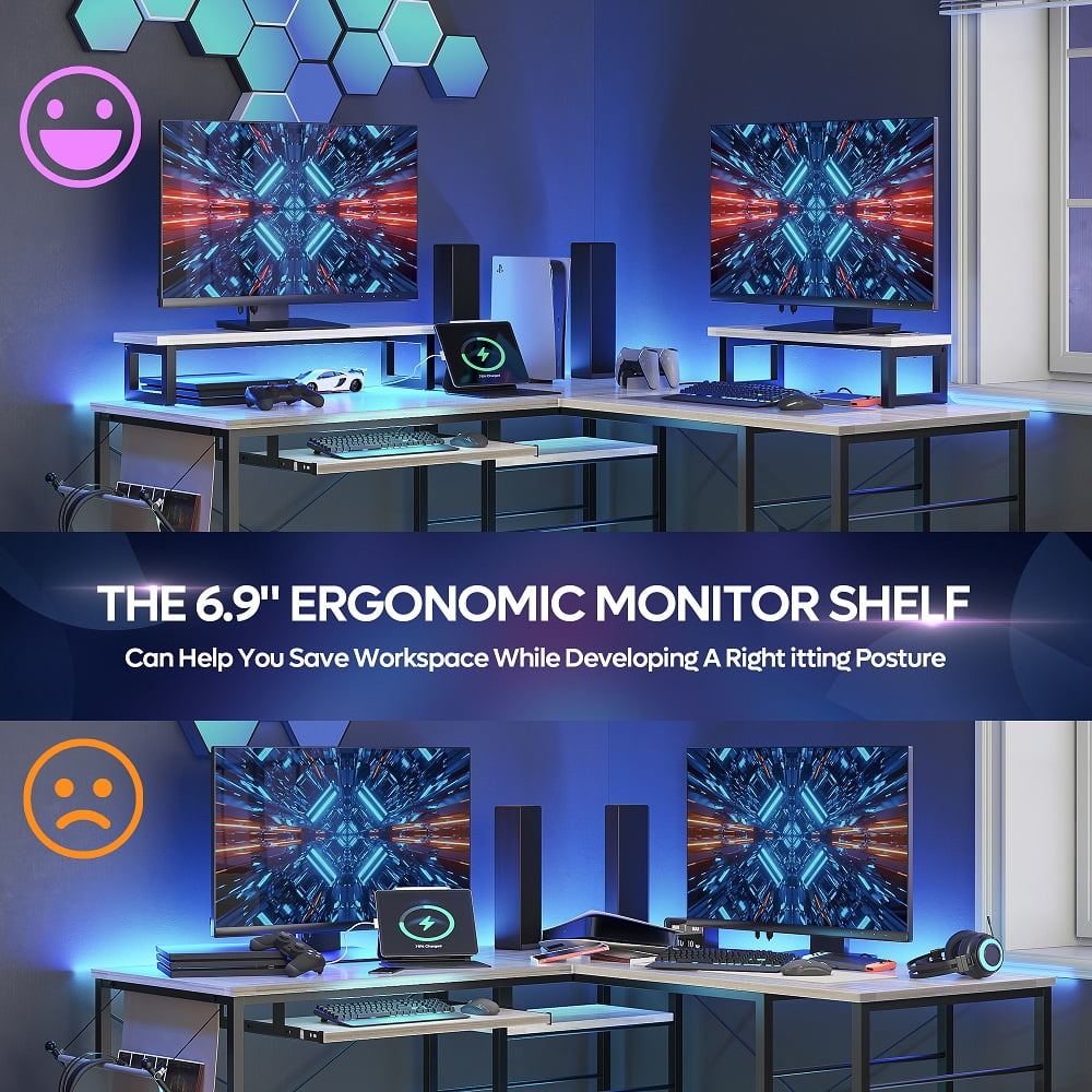 If you are looking for a big computer desk with monitor stand and led strip lights, this is it! The Bestier L-shaped corner computer desk with LED lights is a modern and functional desk that can transform any room in the house into an office. You can assemble it into a L-shaped desk or a long desk. The complete workstation is so spacious that 2 people can work at the same time. Besides there is 2 movable and non-slip monitor display shelf on the desk which keeps your laptop at appropriate sight level to help you sit in a correct posture. In addtion, the writing desk has a keyboard tray , a storage bag, and 4 opne shelves to help you store various office supplies and keeps your desktop more organized. Also it has adjustable foot pads for better stability.