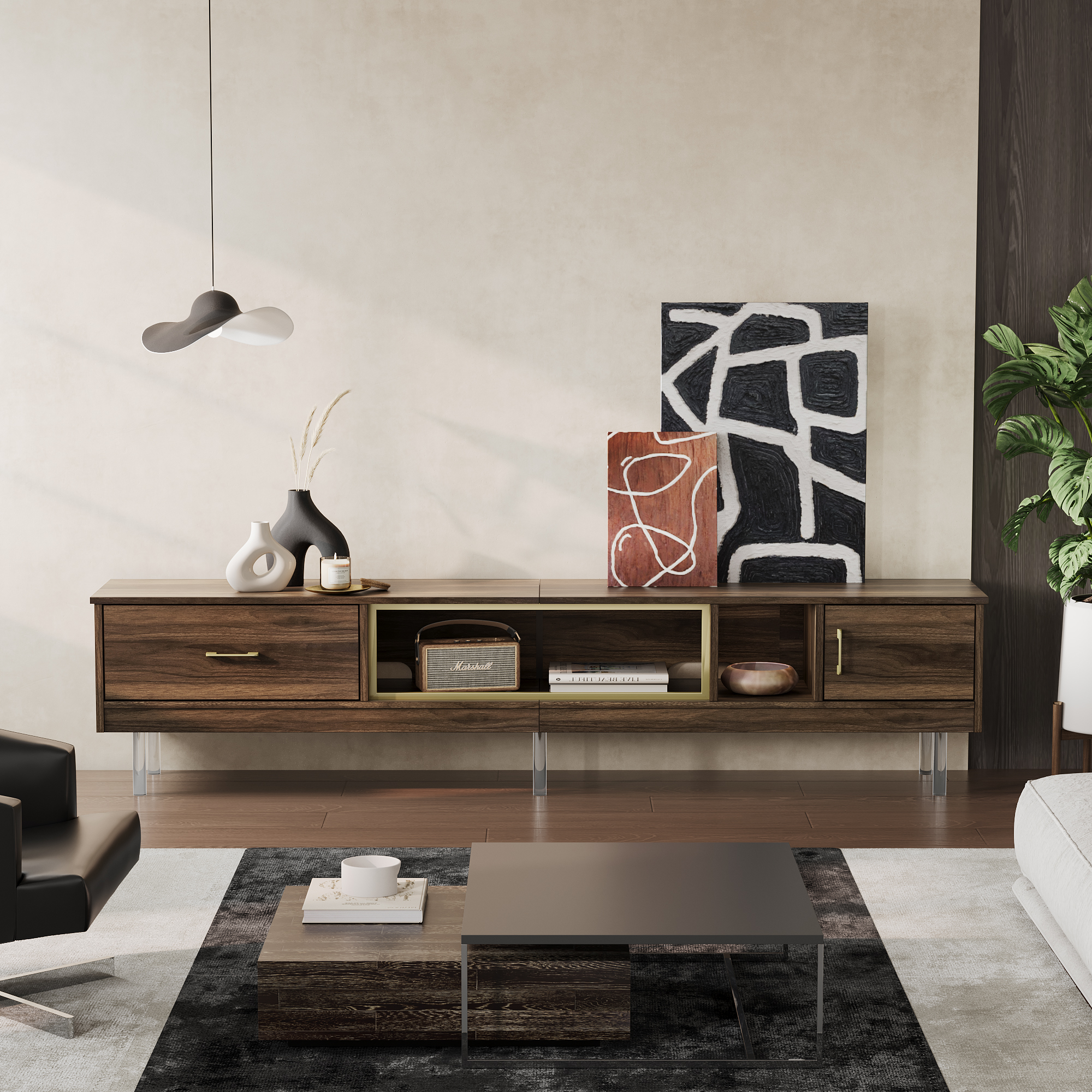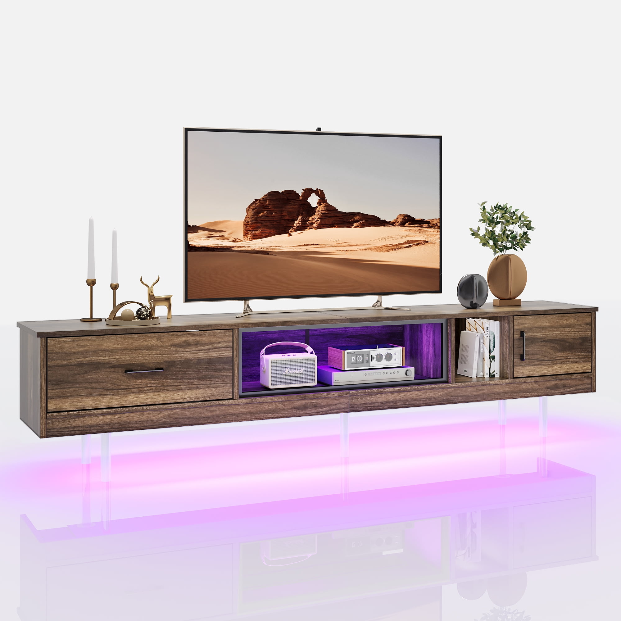Large-Screen Accommodation: Bestier 80-inch TV stand is designed to perfectly accommodate televisions up to 90 inches. It’s the perfect platform for your large screen TV, transforming your living room into a personal home theater for movie nights or binge-watching sessions. Dynamic Lighting: Equipped with an RGB light strip, this entertainment center can display a range of colors. Whether you’re creating a cozy atmosphere for a movie night or a vibrant setting for a party, the lighting adds a unique ambiance to any event. Practical Elevation: Our media stand offers an open storage design with a variety of drawers and compartments. This layout allows for easy organization and access to various items, from media components to personal keepsakes, keeping your living area neat and organized. Organized Storage Solution: The floating design of this media console is not only aesthetically pleasing but also practical. The raised structure allows for easy cleaning underneath with robot vacuums, ensuring your living space remains clean and dust-free. Effortless Assembly: Bestier TV stand is designed for an easy and hassle-free setup. With clear instructions and a straightforward assembly process, you can have it ready in no time, saving you valuable time and effort. Specifications: Material: P2 Particle Board + Metal Frame Overall Dimension: 80” W x 13.78”D x 20.63”H Top Load Bearing: 100 lbs Bottom Shelf Load Bearing: 30 lbs Package Included: 1 x TV Stand 1 x LED Light Set 1 x Fittings Set 1 x Assemble Manual