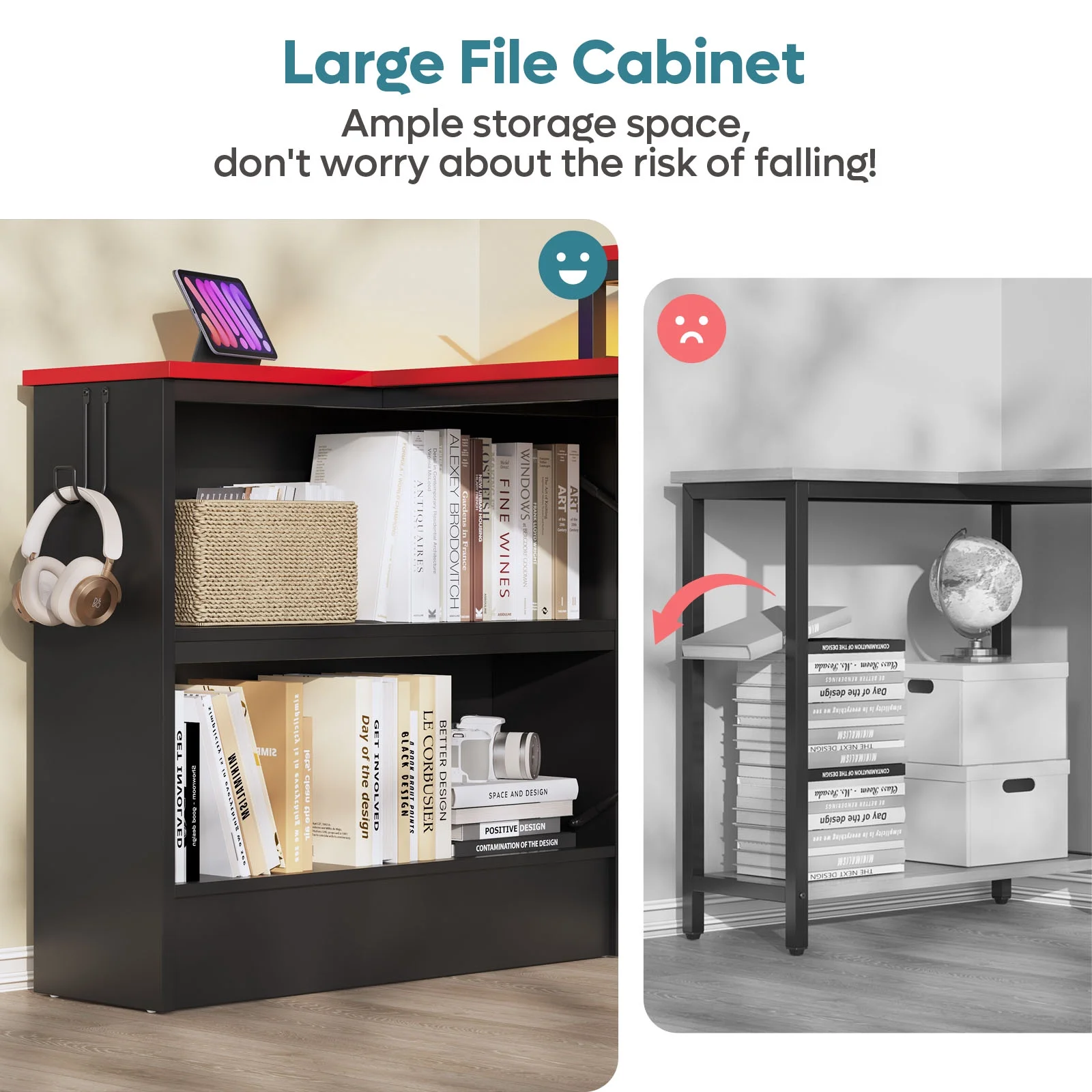 Create the perfect office space to work from home with Bestier L-shaped computer desk with LED light. This office desk with an open shelf cabinet fits snuggly in a corner to maximize your home office space. Equipped with an LED light, the l desk provides perfect illumination and atmosphere for your work or gaming sessions. The open shelf cabinet can be installed on both sides of the corner desk to provide a perfect home for your binders and books but keep them within easy reach. The large desktop with a movable monitor stand provides plenty of room for your office supplies or gaming devices. The gaming desk with LED light even has a headphone hook and a side pocket storage bag for organization. This Desk measures to be 35″ H x 42″ W x 31.5″ D and is constructed of CARB-certified particleboard.